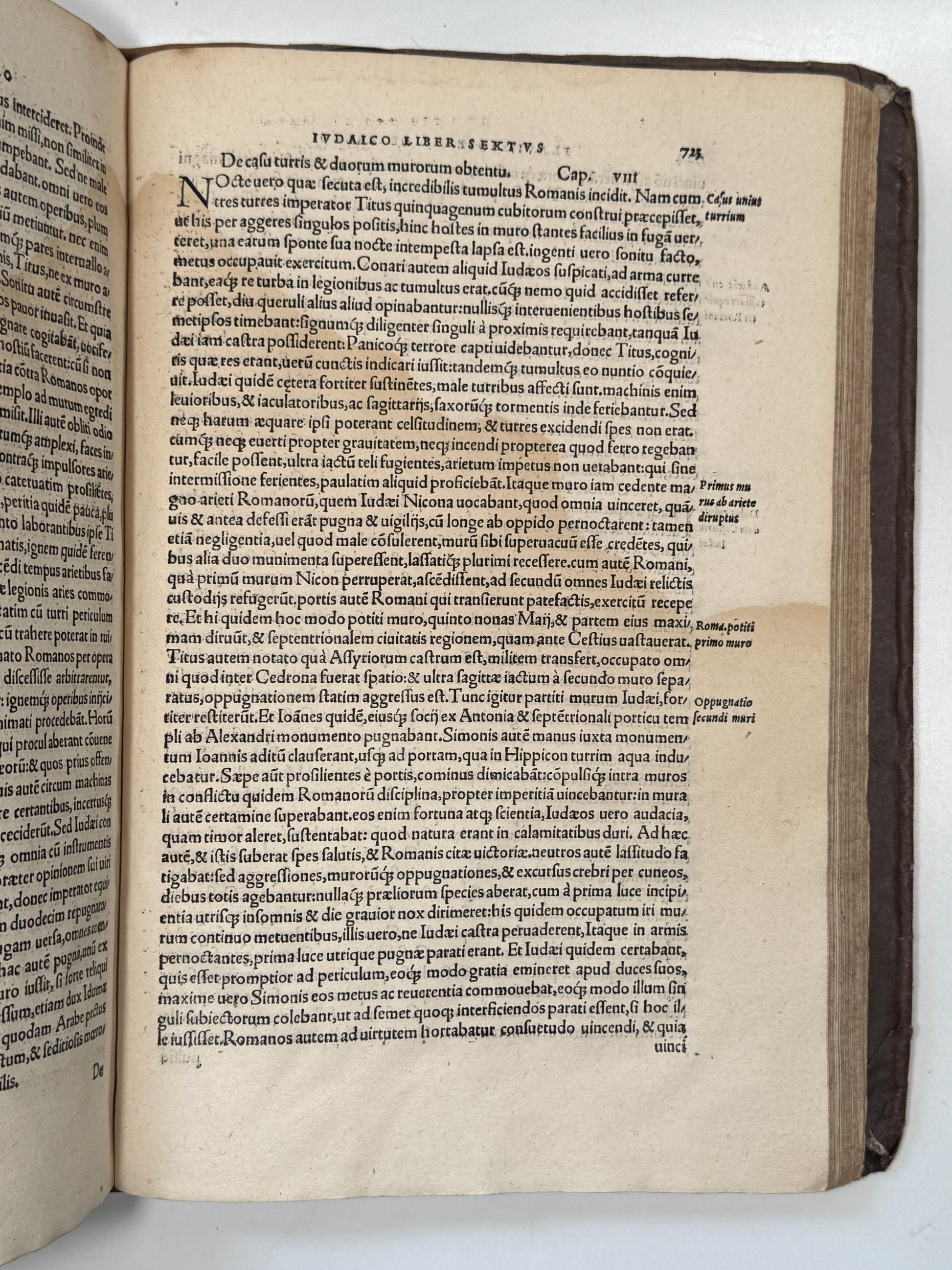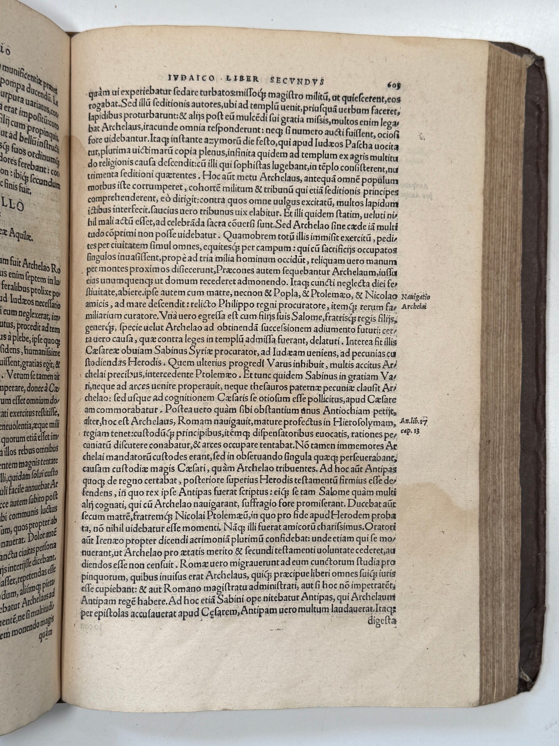 The editorial work of Erasmus lends particular significance to this edition: not only did he revise the Maccabees text, but the entire corpus was carefully corrected against older exemplars, making it one of the most accurate and influential Josephus printings of the sixteenth century. The inclusion of a copious index further enhanced its utility for humanist readers, theologians, and historians, and this was a popular edition in its time, particularly in the Reformer tradition who were interested in Josephus' independent historical accounts of both events of the Old Testament, and more pertinently, those of the New Testament.