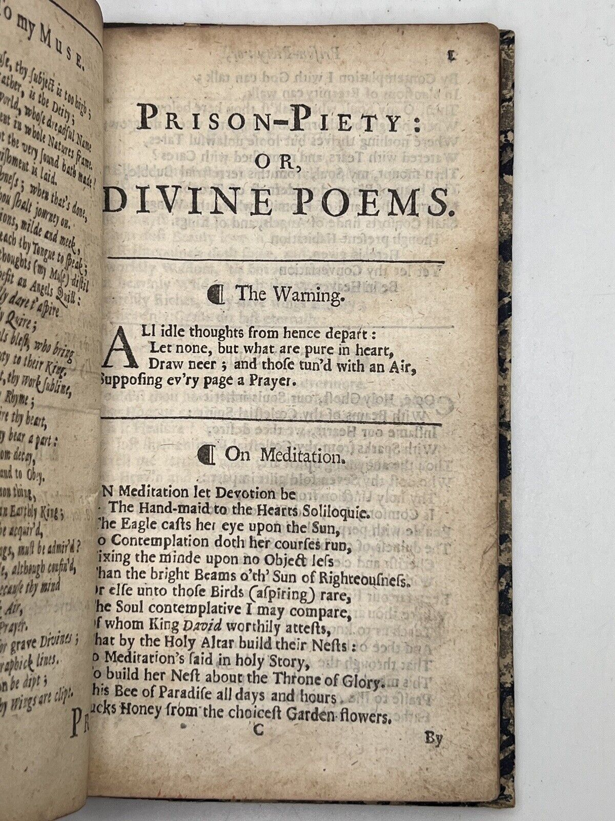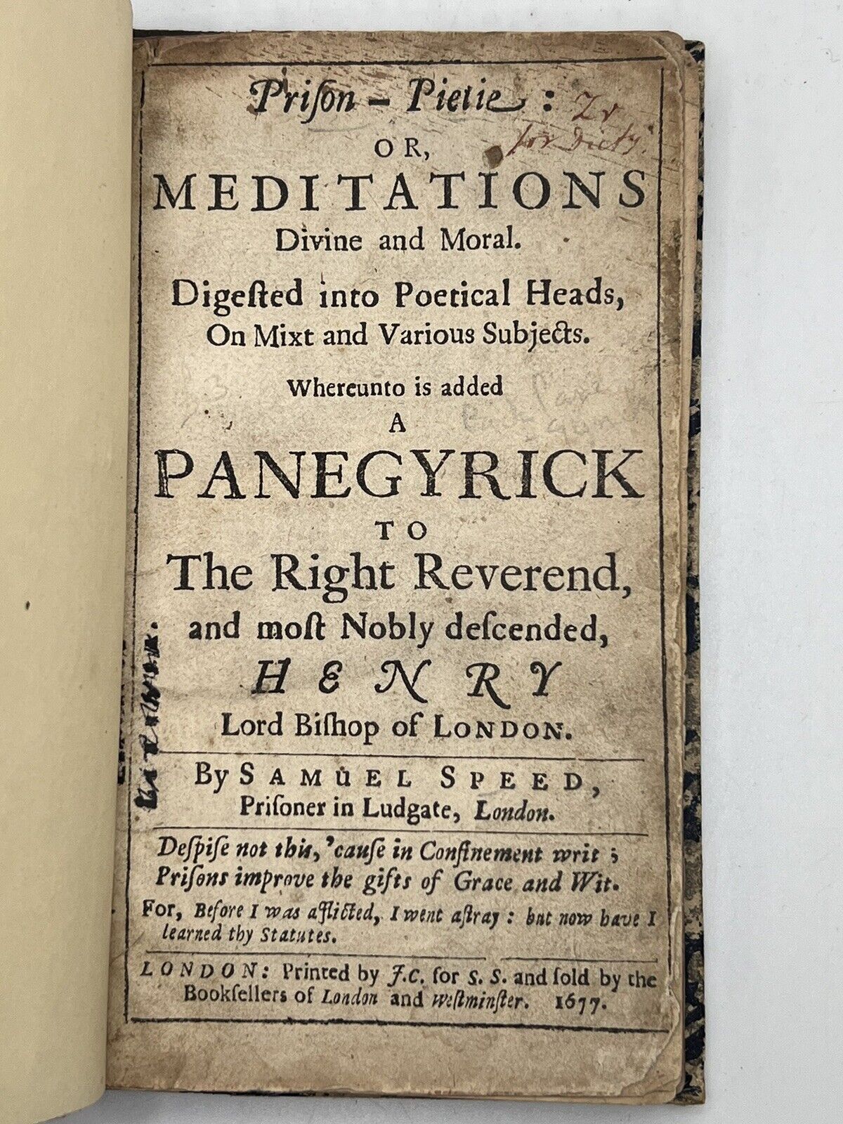 Prison-Pietie: Or, Meditations Divine and Moral. Digested Into Poetical Heads, On Mixt and Various Subjects. Whereunto is Added a Panegyrick to the Right Reverend, and Most Nobly Descended, Henry Lord Bishop of London. By Samuel Speed, Prisoner in Ludgate, London. London: Printed by J.C. for S.S., 1677.