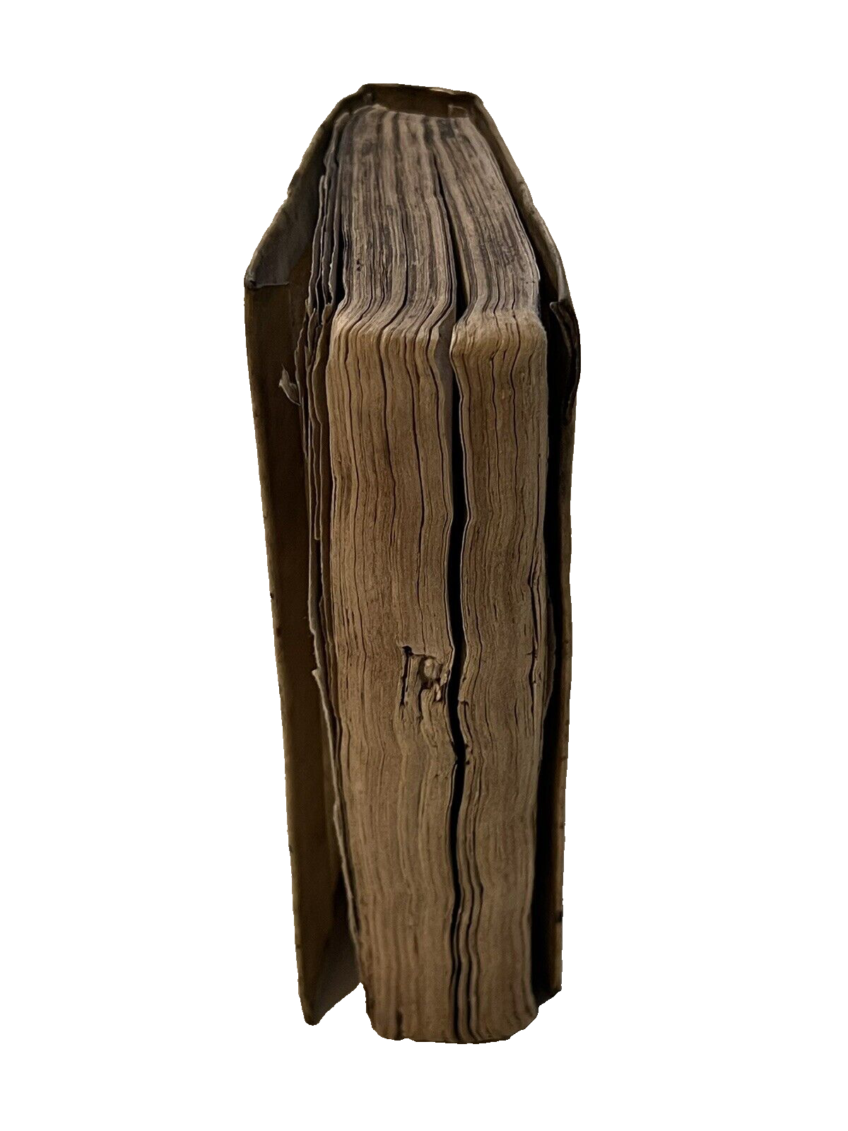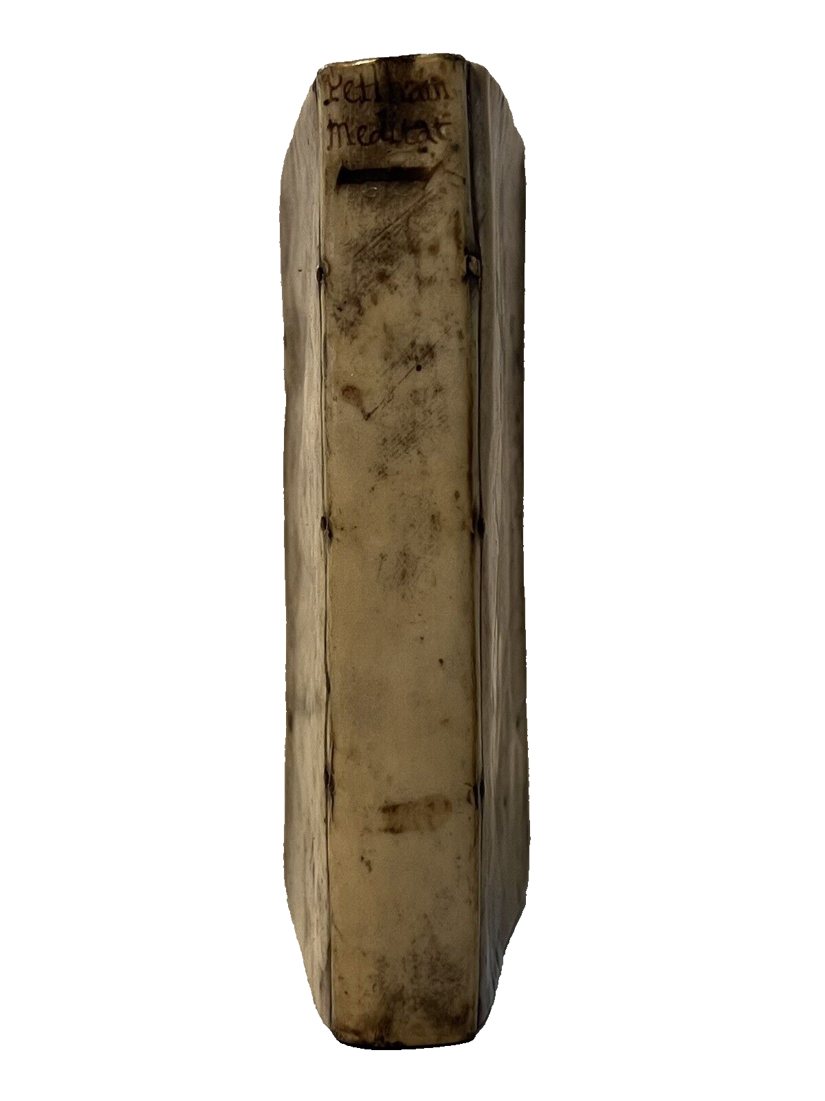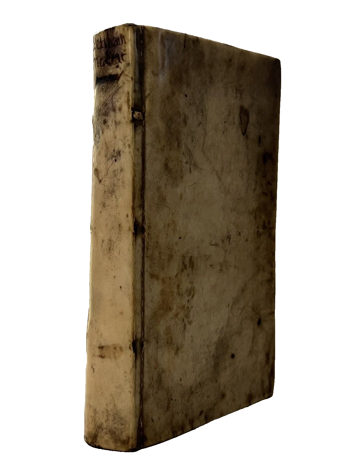 Full vellum binding with an ink title to the head of the spine, with some scuffing and marks. Binding fully detached from the page block. Four very small holes to the vellum binding where closing strings were previously attached. Lacking pastedowns. Ink ownership inscription to the head of the title page. Text block clean, lightly toned with occasional foxing. Some small tears and loss to page edges. Damp staining to the last few leaves of the page block. Page block cocked.