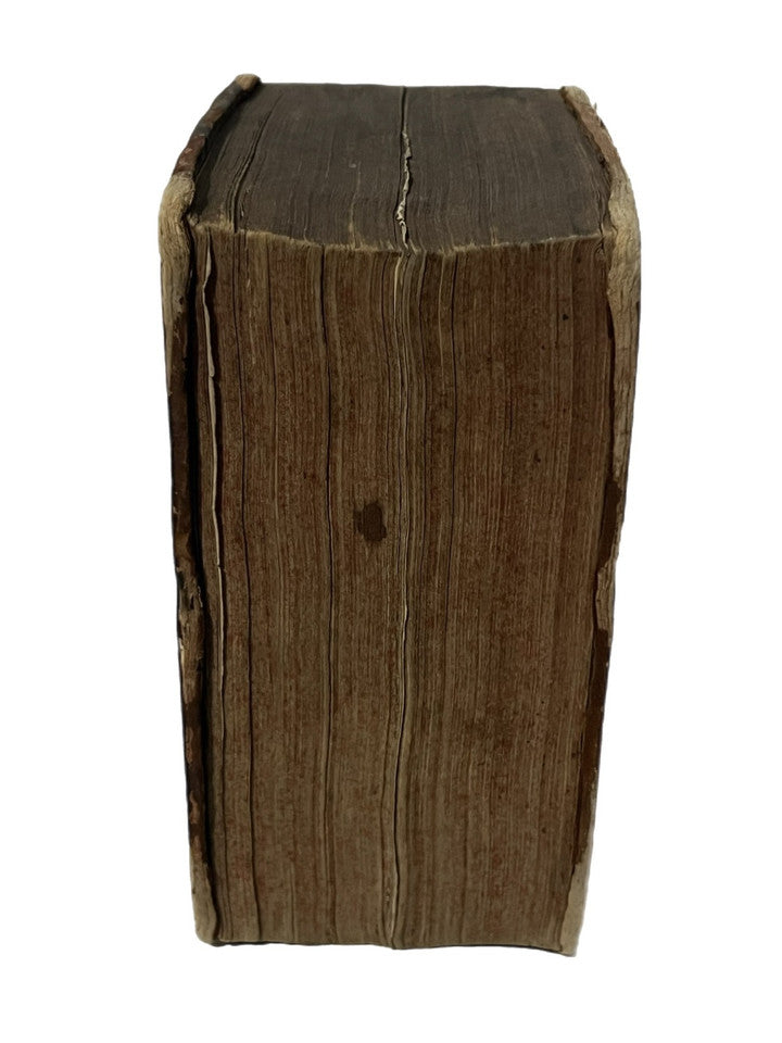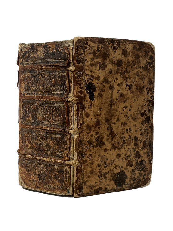 Full calf binding, rubbed with some loss to the leather, dry. Both boards are securely attached, though with joints cracked & exposed. Stands without shelf lean, binding secure. No attached bookplates. Pencil inscriptions to ffep recto from a prior book dealer. This copy previously sold for £500 (unknown when). Collated as complete through both parts. Complete with the 3D8 blank which is often lacking, as well as a7-8 which are both blanks. It's possible that the final two blanks are supposed to be z7-8 in the collation, but the text itself ends with z6 which has the colophon for the second part on the verso. Generally very clean throughout the text, minor sporadic spotting, else generally very good.