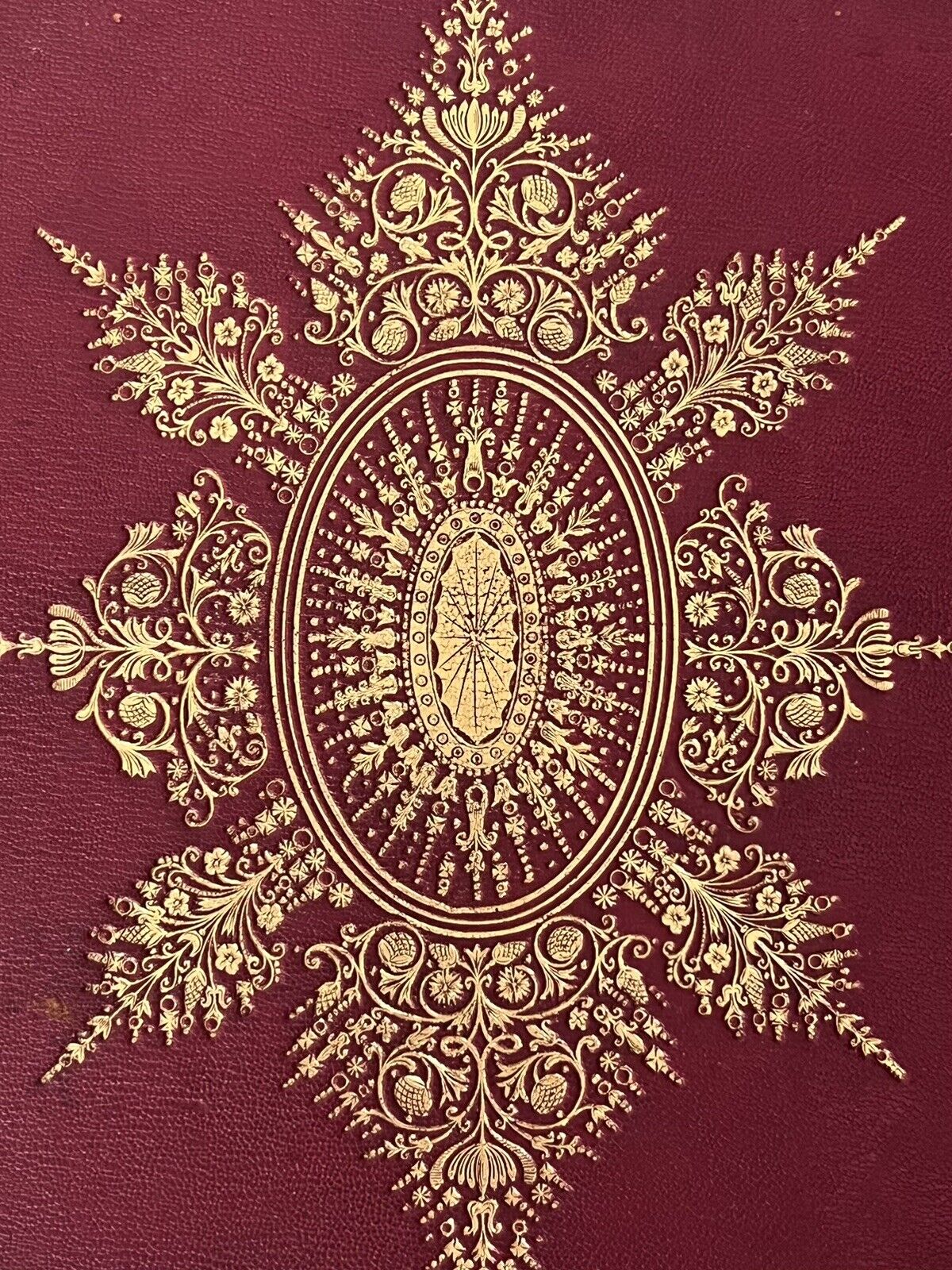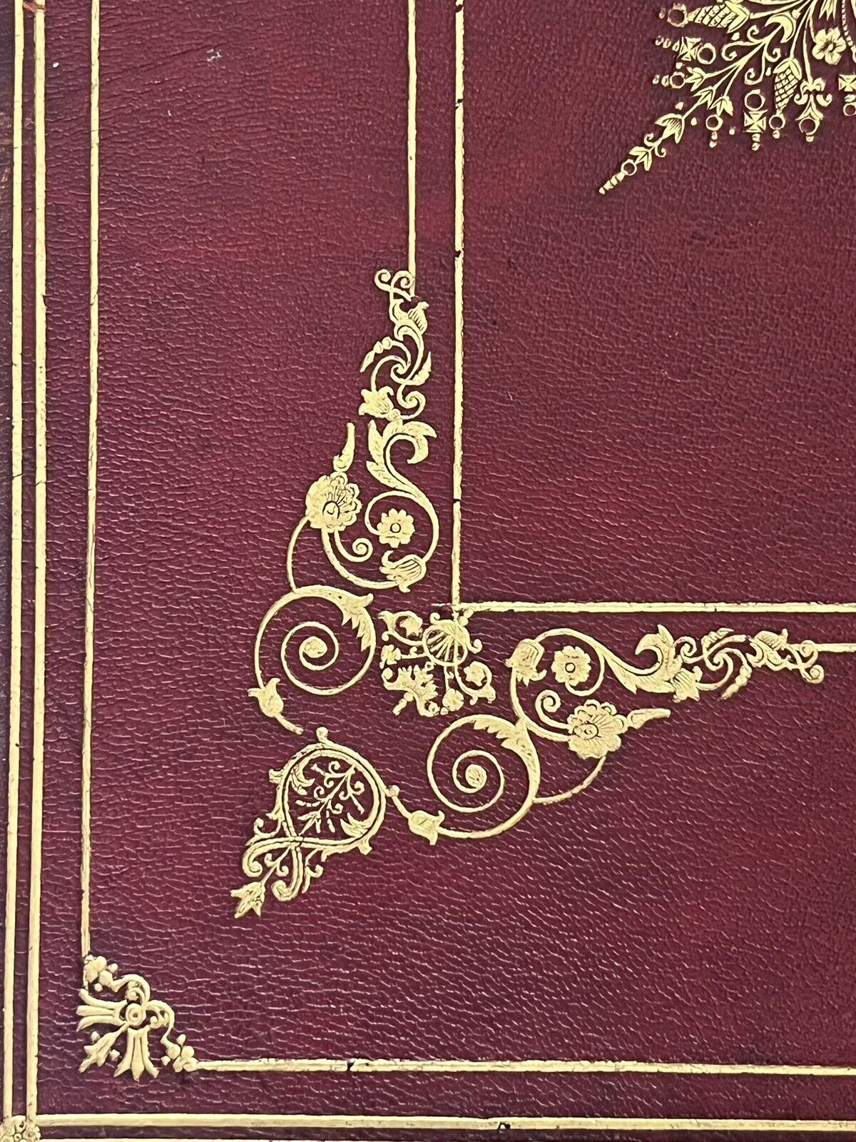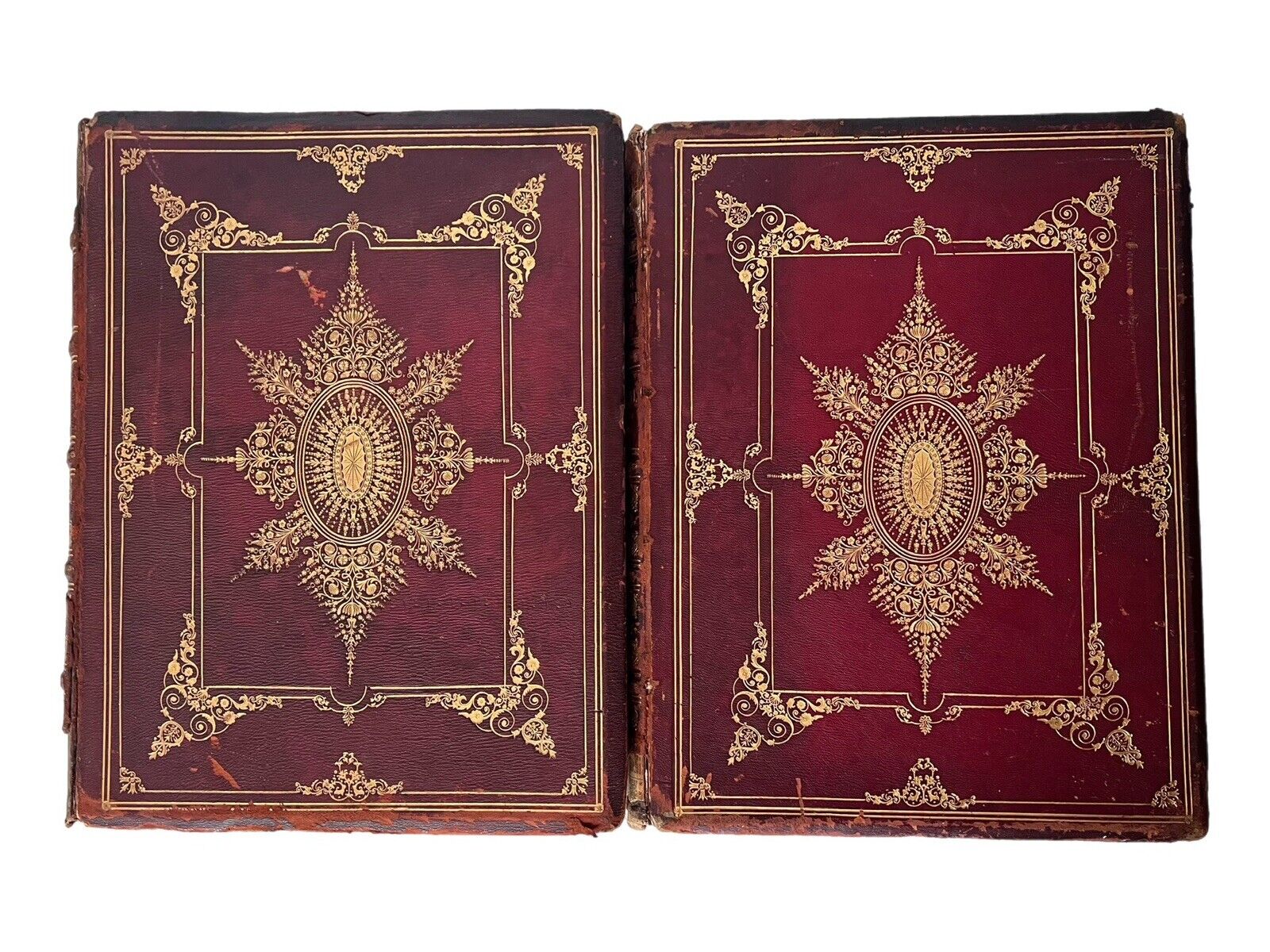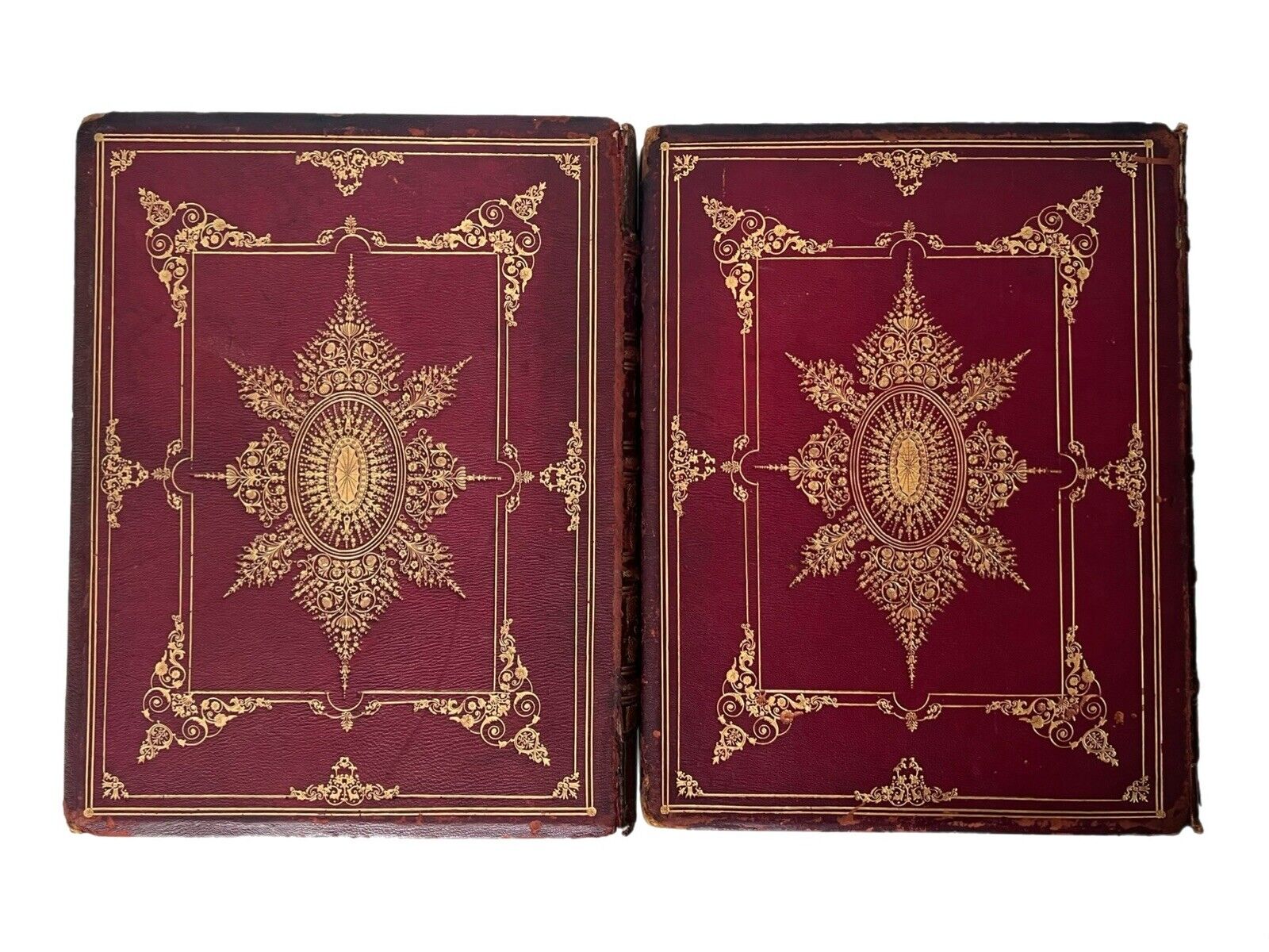 Contemporary full red morocco, very finely tooled in gilt to spines and all boards, the boards all with the same design. Bindings rubbed with some discolouration but the gilt remains bright and the books remain highly attractive indeed. Losses at extremities of backstrips to both volumes. Joints rubbed, slightly cracked at extremities, hinges reinforced with cloth, and subsequently the boards are securely attached, the bindings are secure. If placed carefully the bindings stand on the shelf, otherwise they are vertically unstable, probably owing to their dimensions being large thin folios, they are better stored laid flat anyway to avoid the page block sagging. The page blocks are not sagged. All edges gilt, a little dulled but remaining very attractive indeed. Shelf and edge wear with some losses at corners as typical. Original pale yellow endpapers. Without any attached bookplates or ownership inscriptions. Some minor foxing to first and last few leaves, with the most affected being the preliminary blanks and the title pages. Some minor damp staining at the head of the text block in volume one (only), confined to the marginal space, not affecting the text, with the majority of the page block unaffected. Internally very clean, the full text without loss of sense throughout, the occasional small spot of foxing to some leaves.