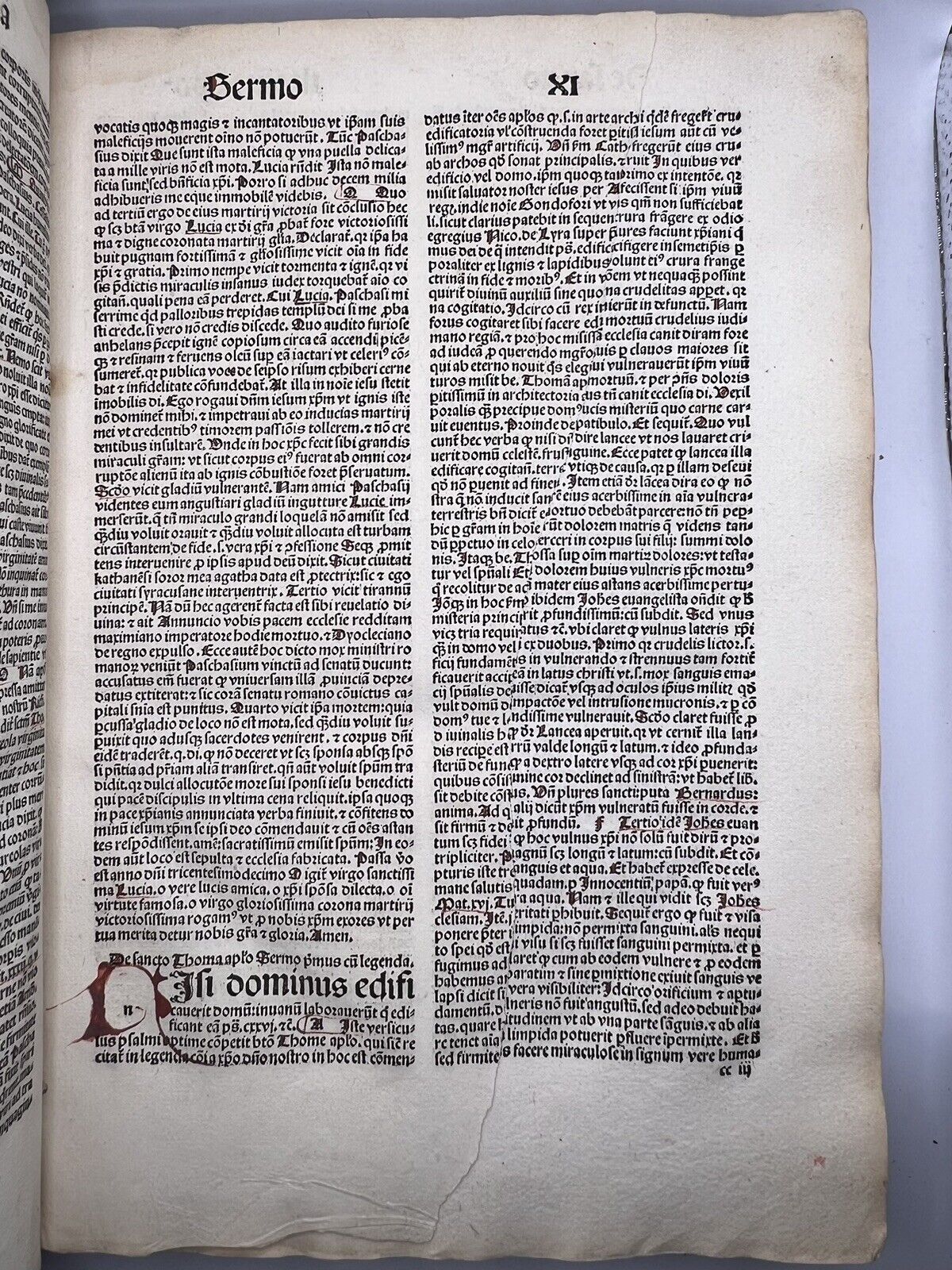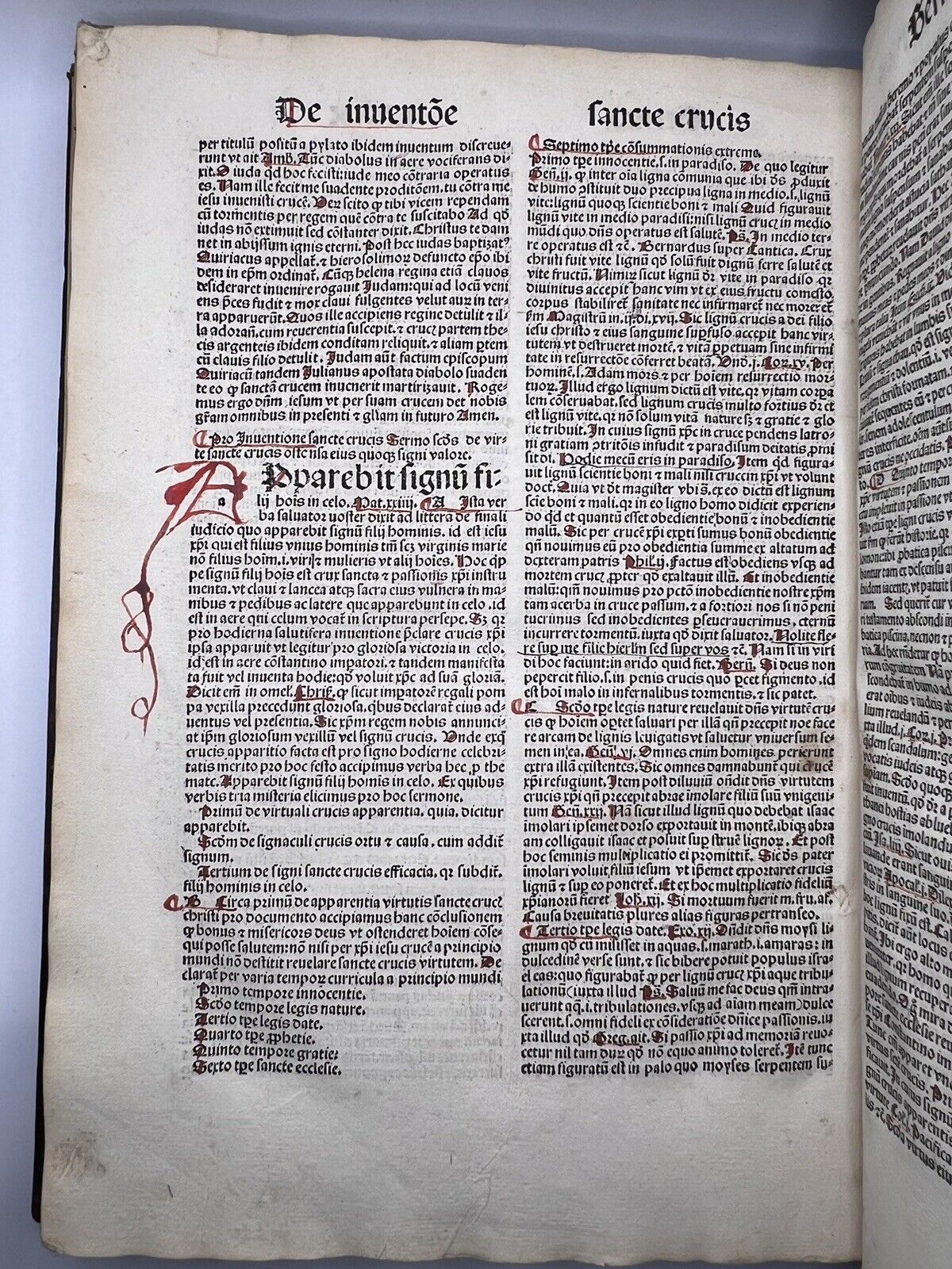 This book contains the first part only, lacking Pars Estivalis, also lacks the preliminary tables and cc¹, with cc² torn, losing a third of the leaf, but present, else with the text of this section complete and finely rubricated throughout every leaf. The collation on the tipped in catalogue is erroneous, but correctly identifies this as a fragment of a larger work (137 of 310 fo).