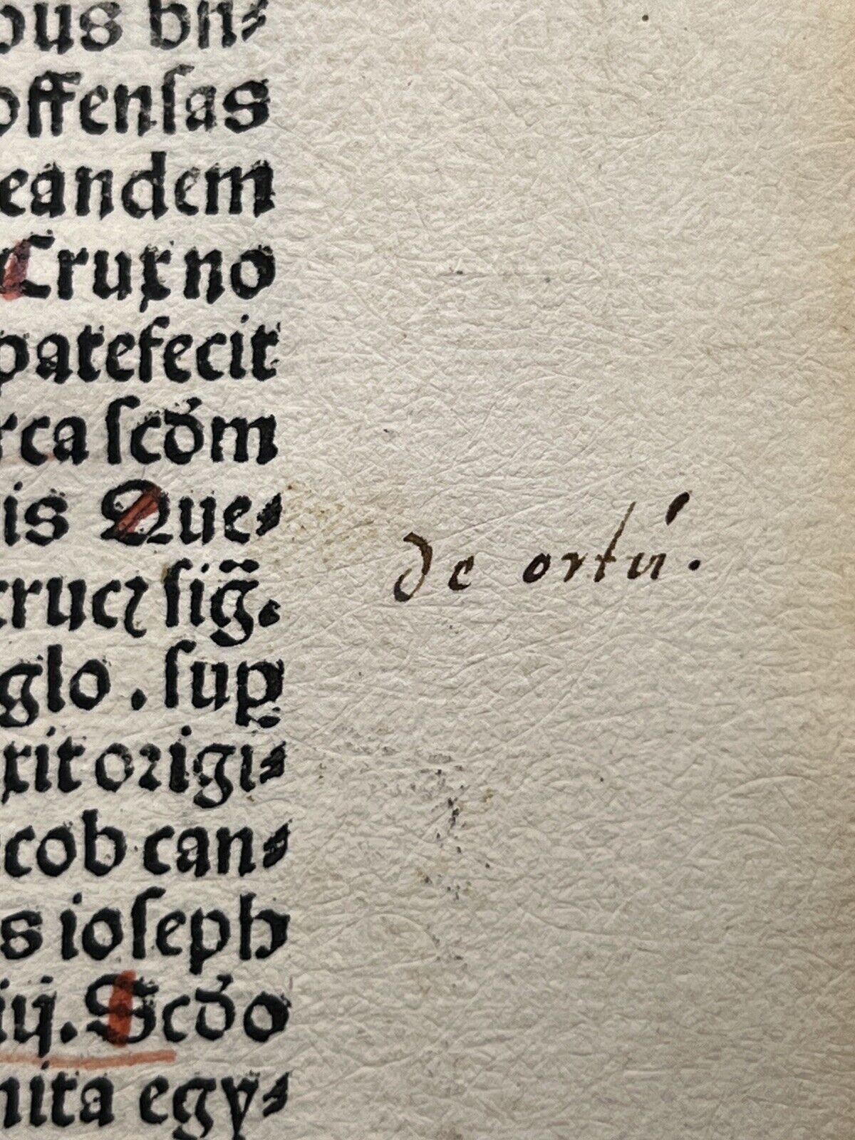 An auction catalogue description to the front pastedown misidentifies the date of this as 1492 and the printer as Anton Koberger. Goff correctly mentions that the first edition of this work appeared in 1499 and that this is the 4th edition of this work "not before 1502". For more on the identification of this edition, see D.E. Roads, "An Unidentified Incunable printed at Augsburg not before 1502", The Library 5 (1958), pp.54-56.