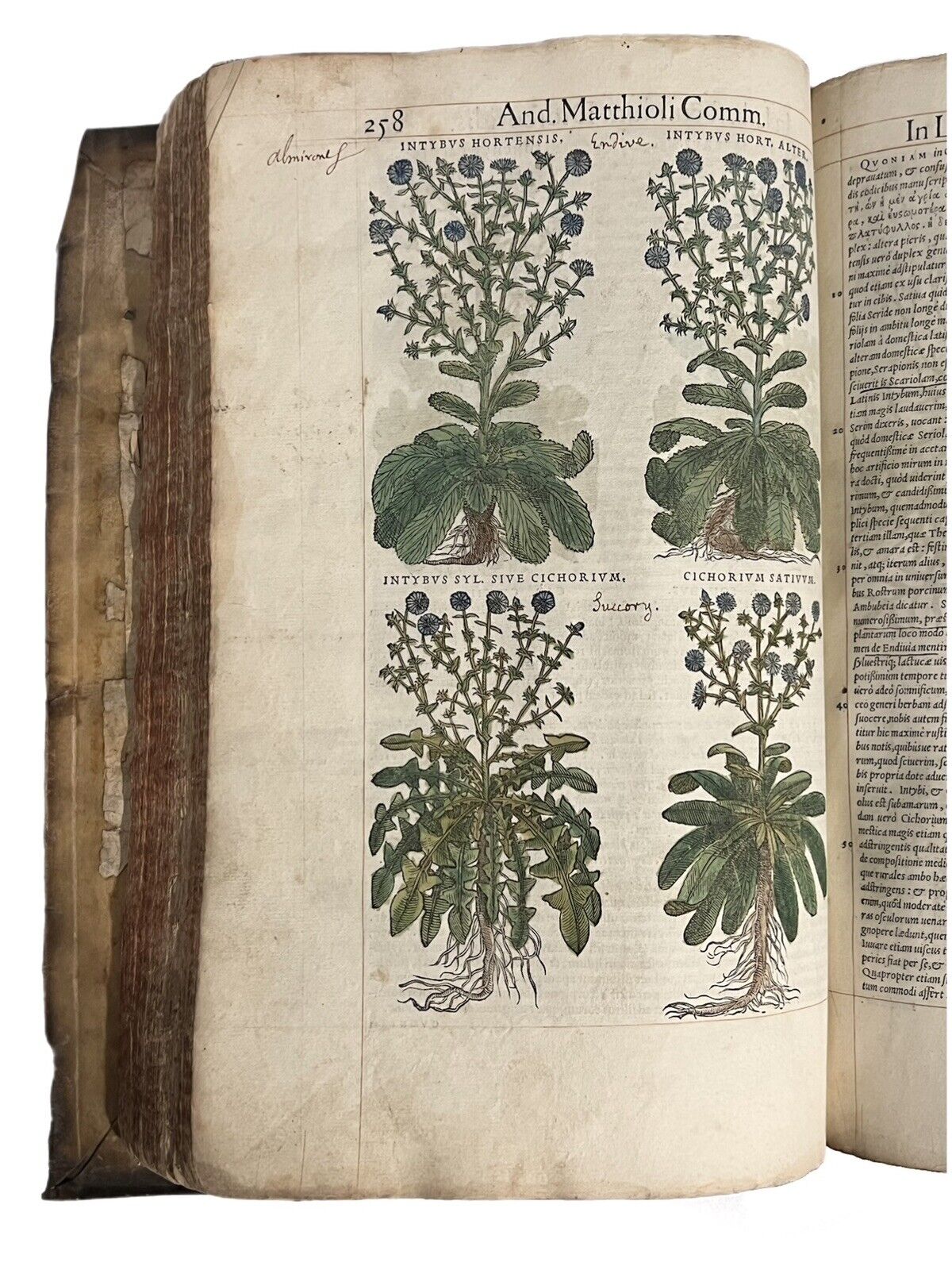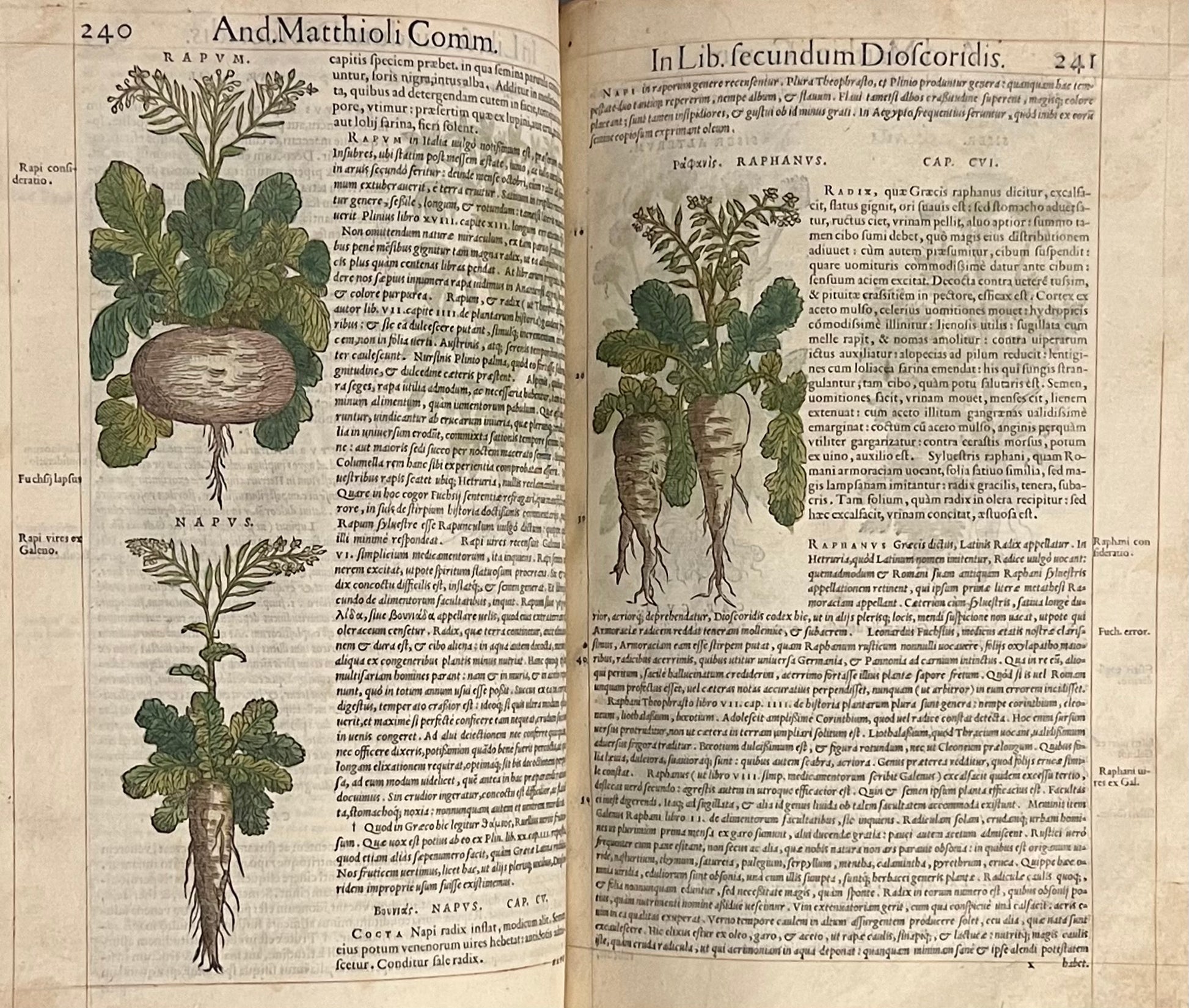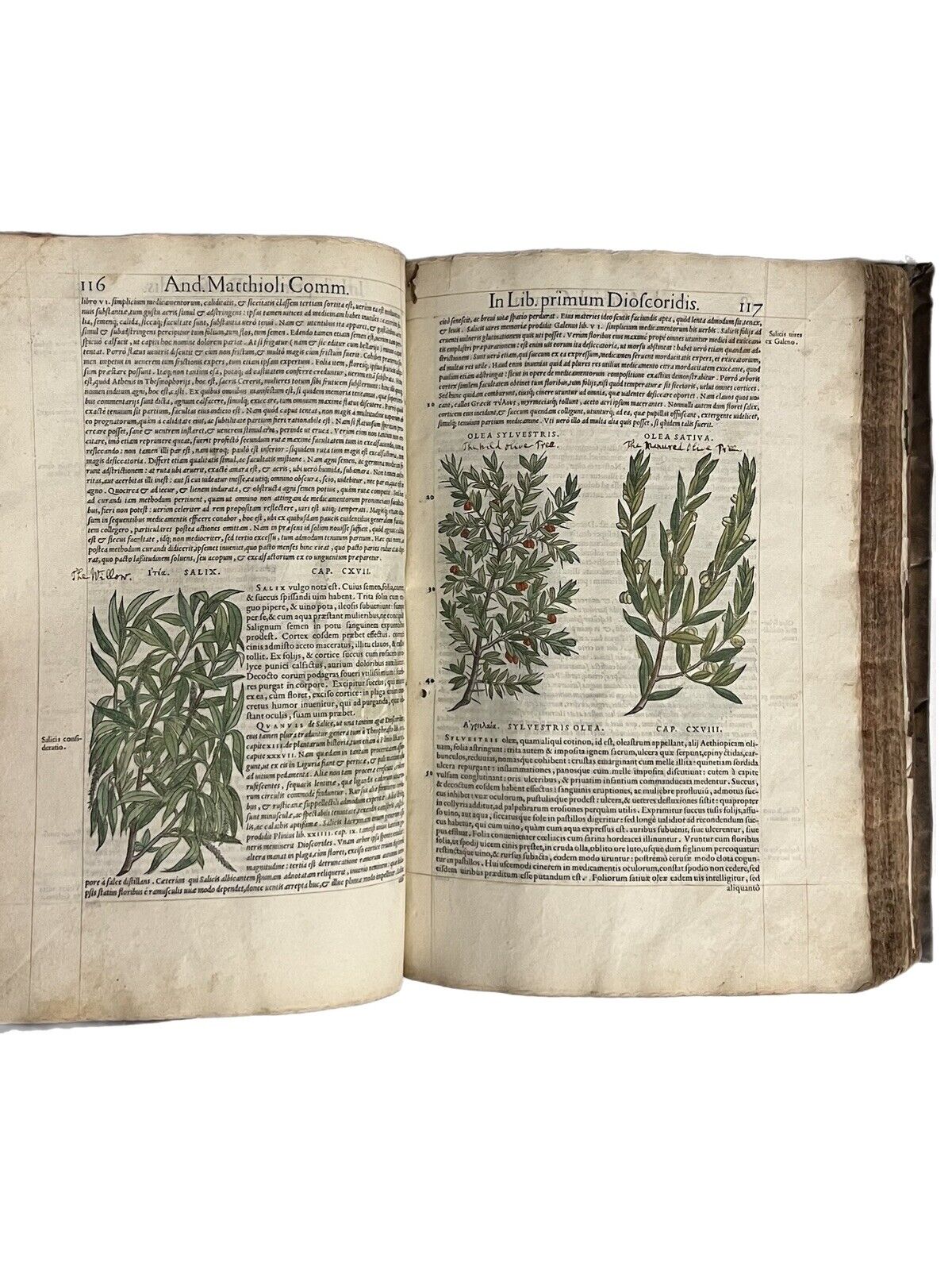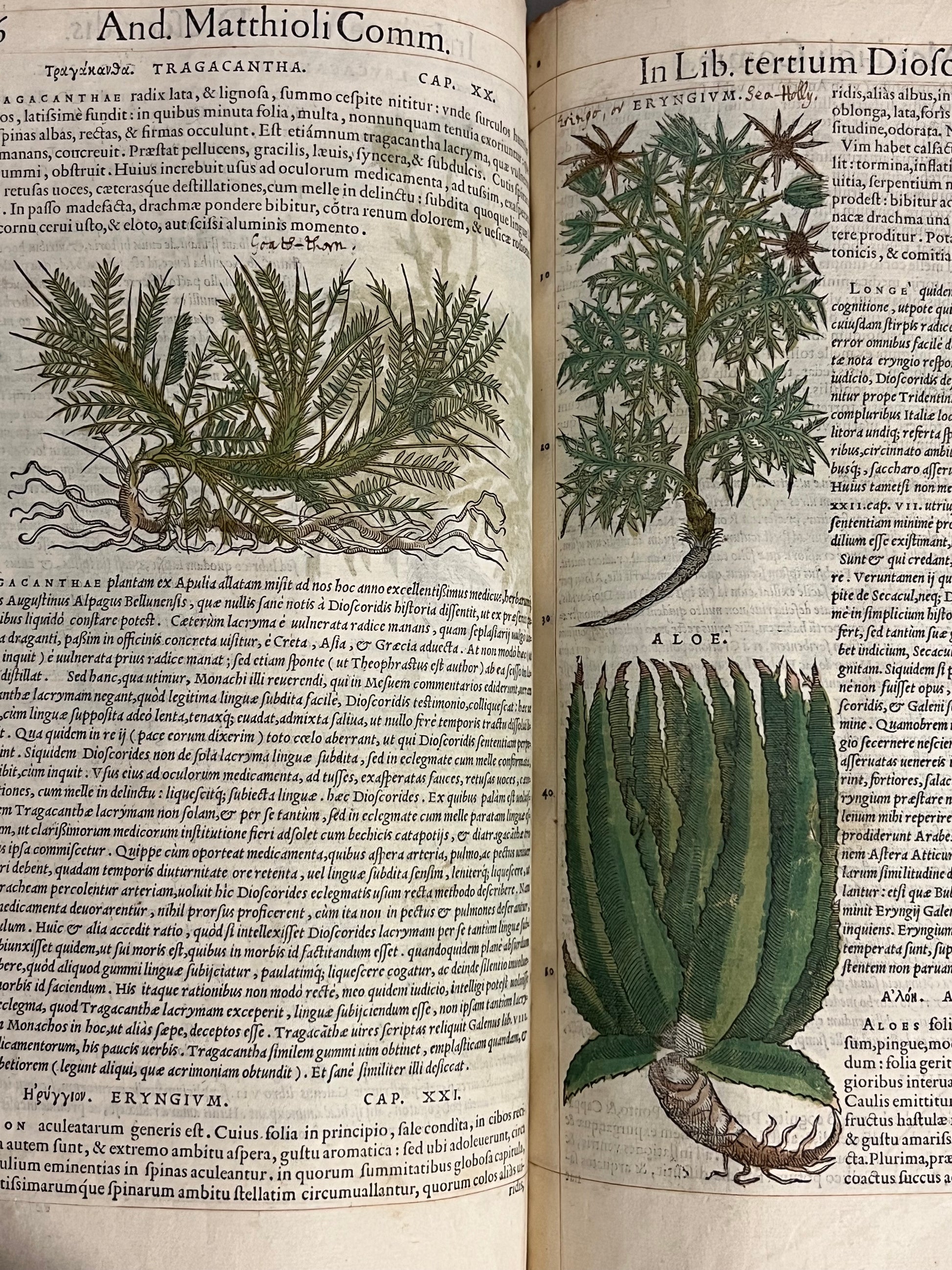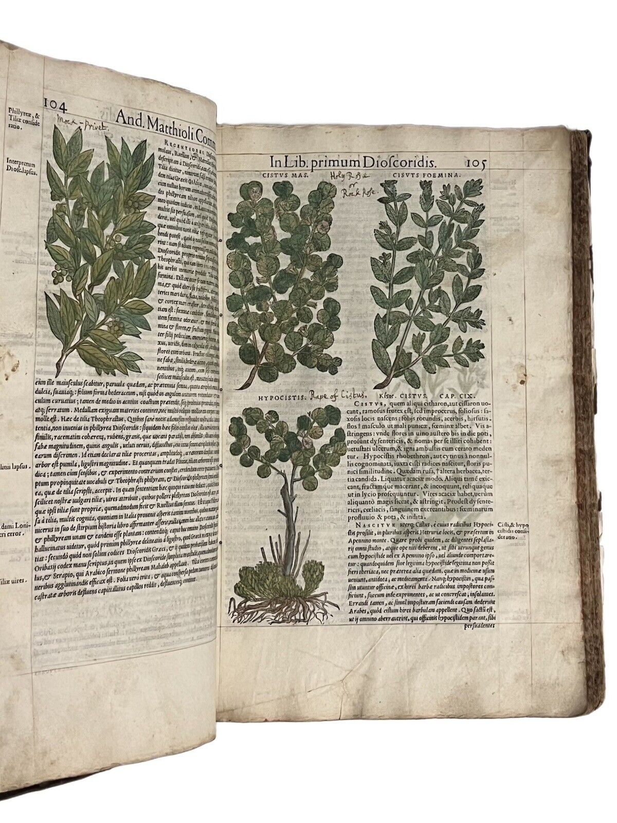 FIRST ILLUSTRATED EDITION AND THE FIRST IN LATIN OF MATTIOLI'S IMPORTANT HERBAL, HERE HAND COLOURED AND WITH EXTENSIVE MARGINALIA BY THREE EARLY MODERN HANDS IN LATIN, SPANISH, AND ENGLISH!
