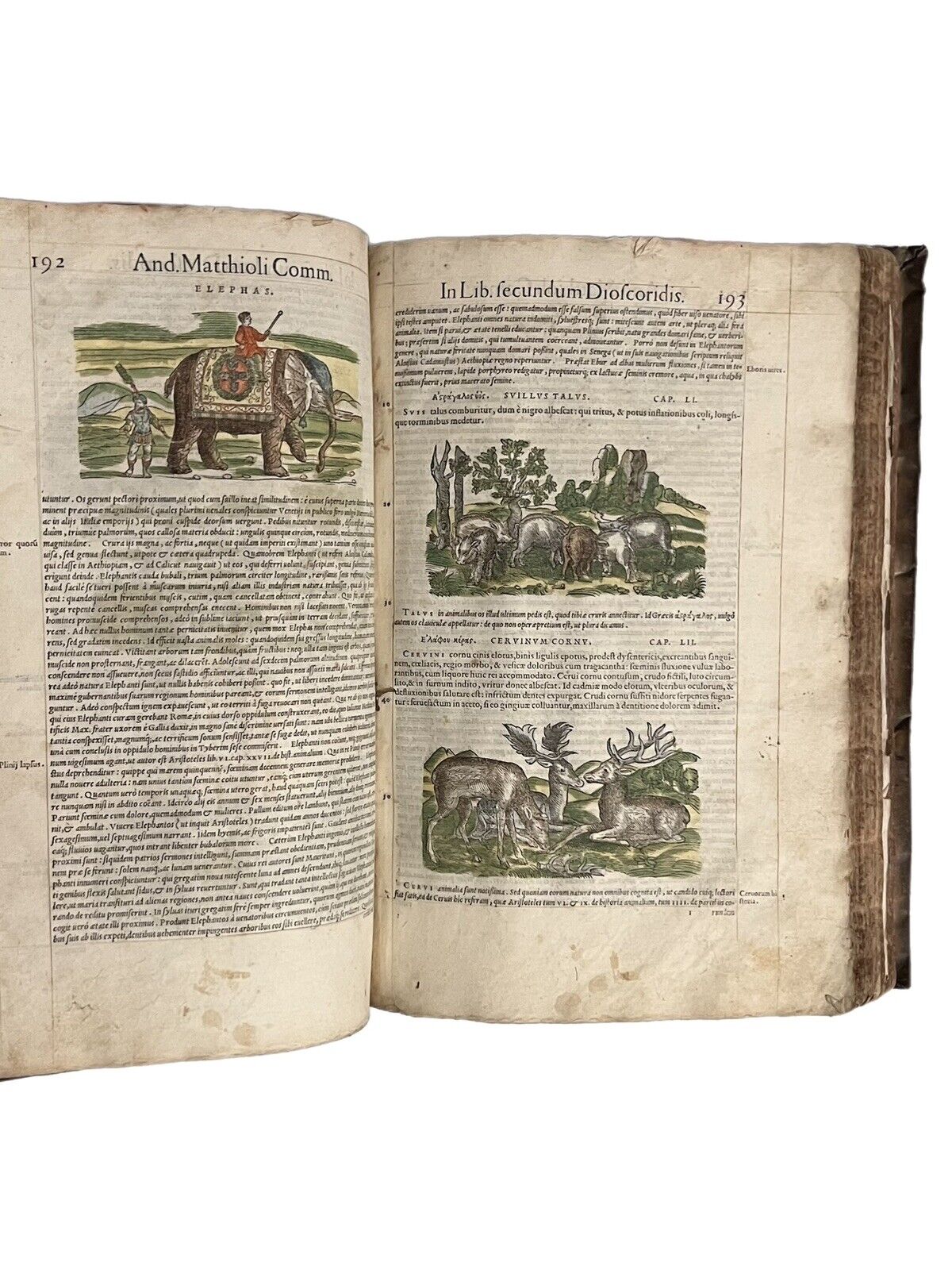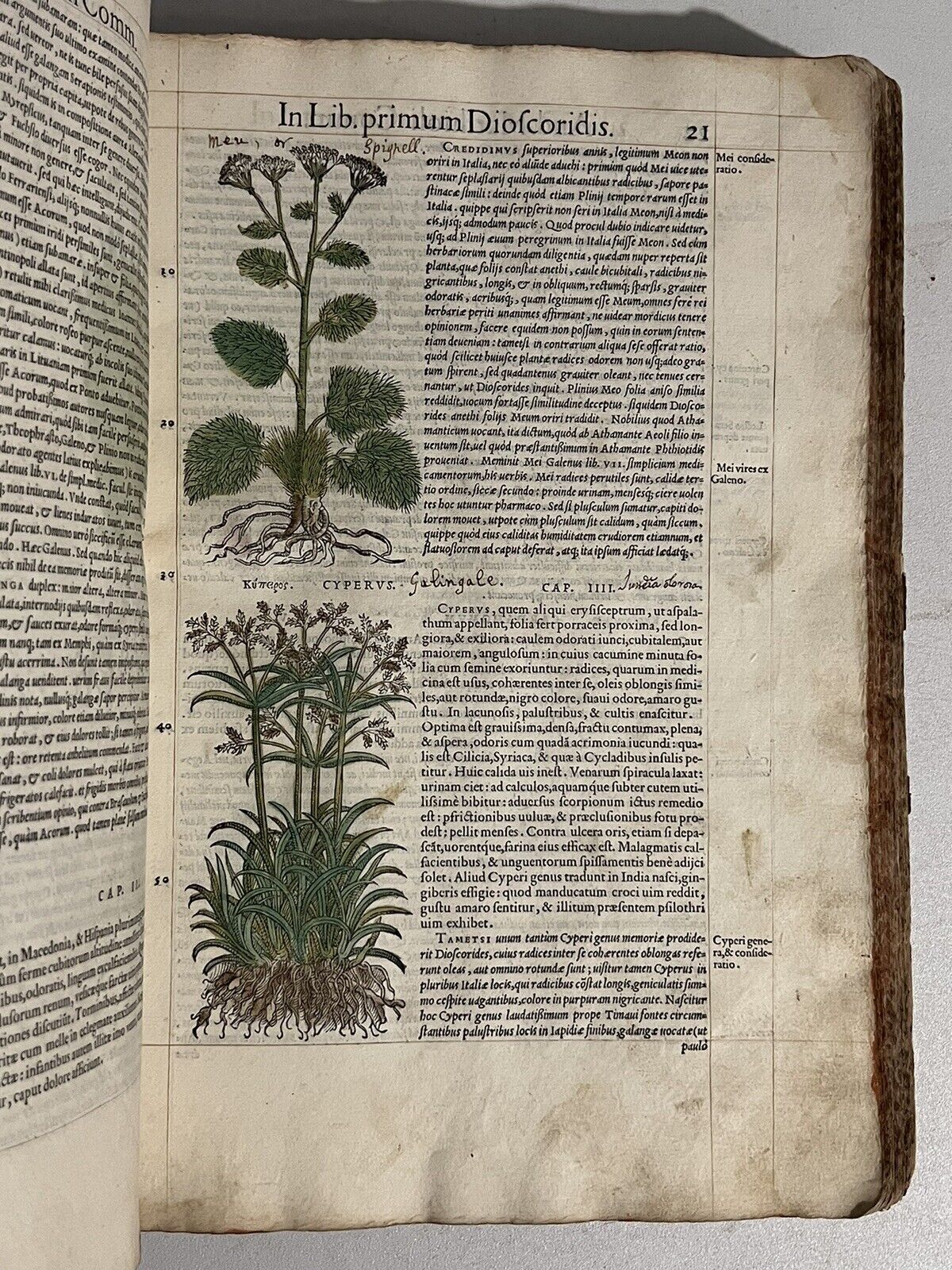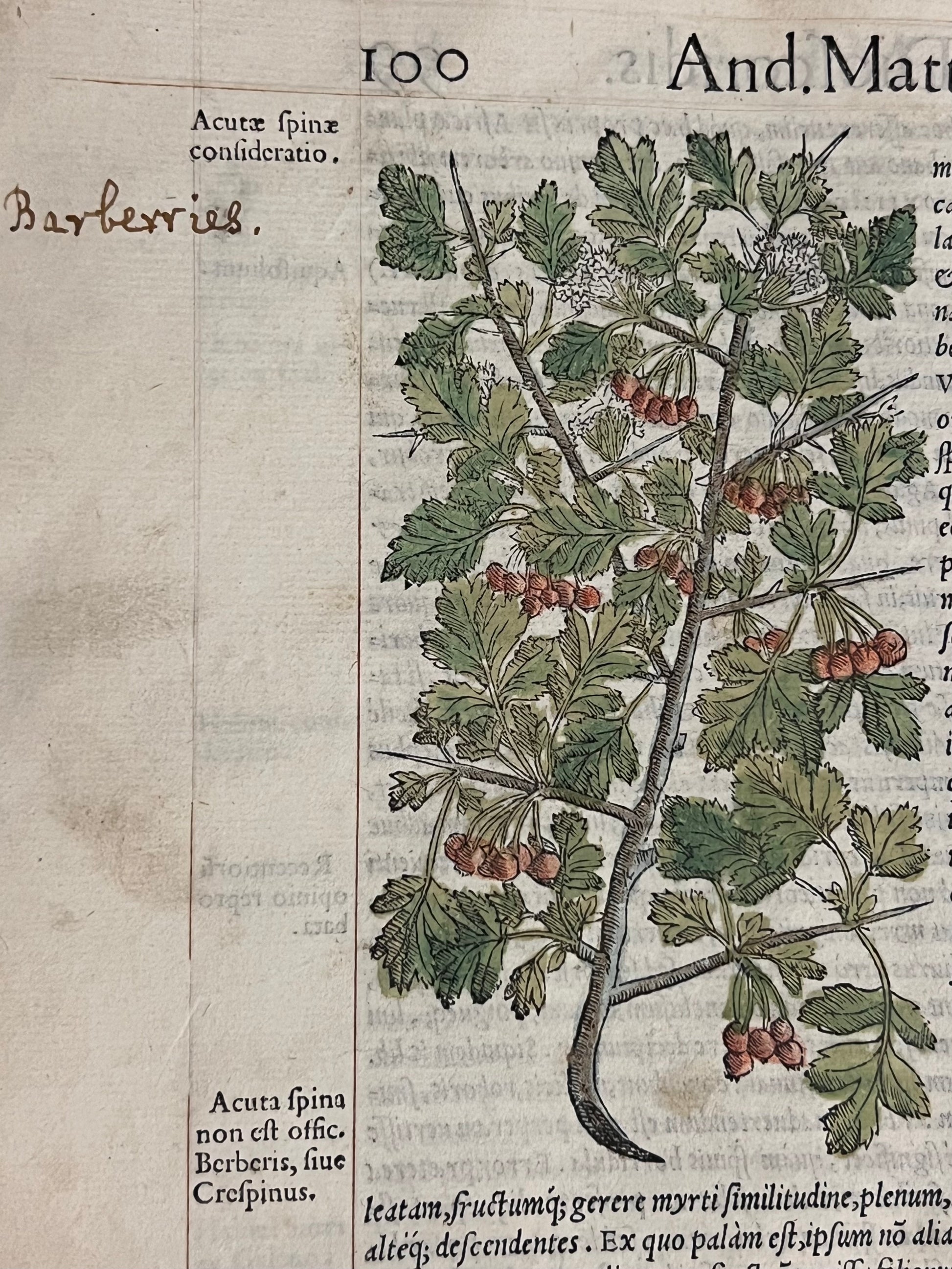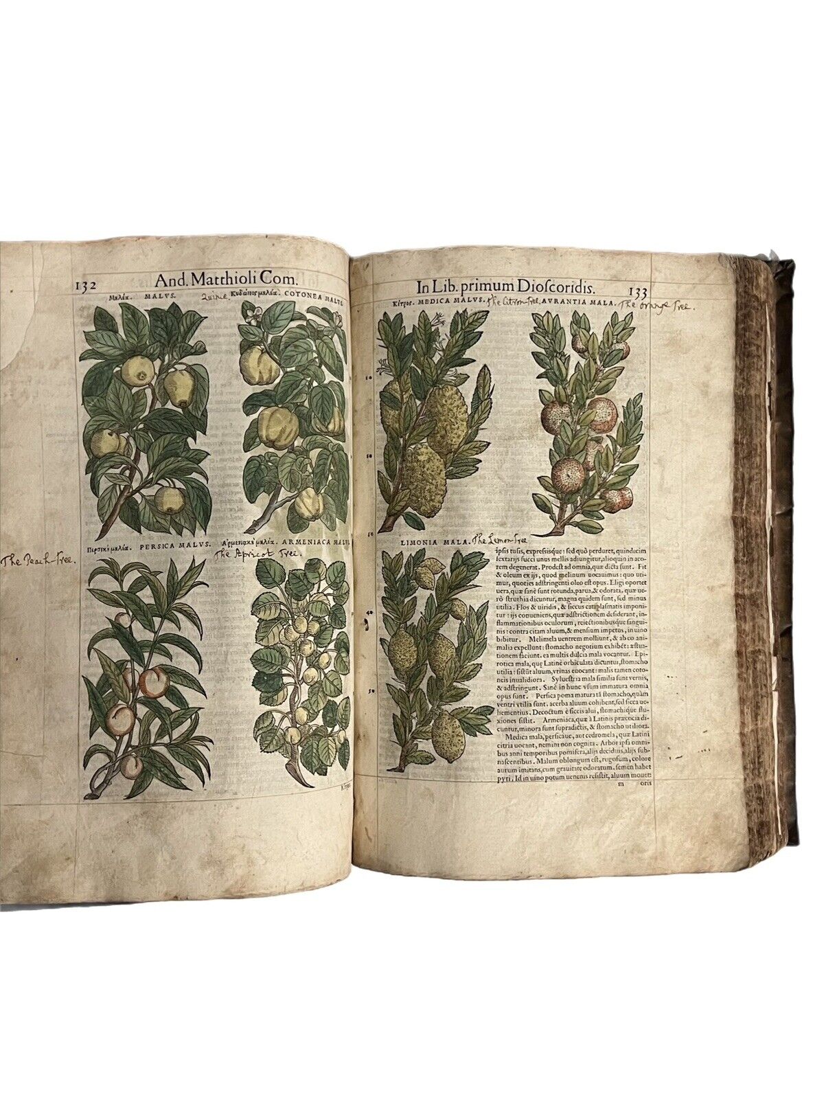 FIRST ILLUSTRATED EDITION AND THE FIRST IN LATIN OF MATTIOLI'S IMPORTANT HERBAL, HERE HAND COLOURED AND WITH EXTENSIVE MARGINALIA BY THREE EARLY MODERN HANDS IN LATIN, SPANISH, AND ENGLISH!