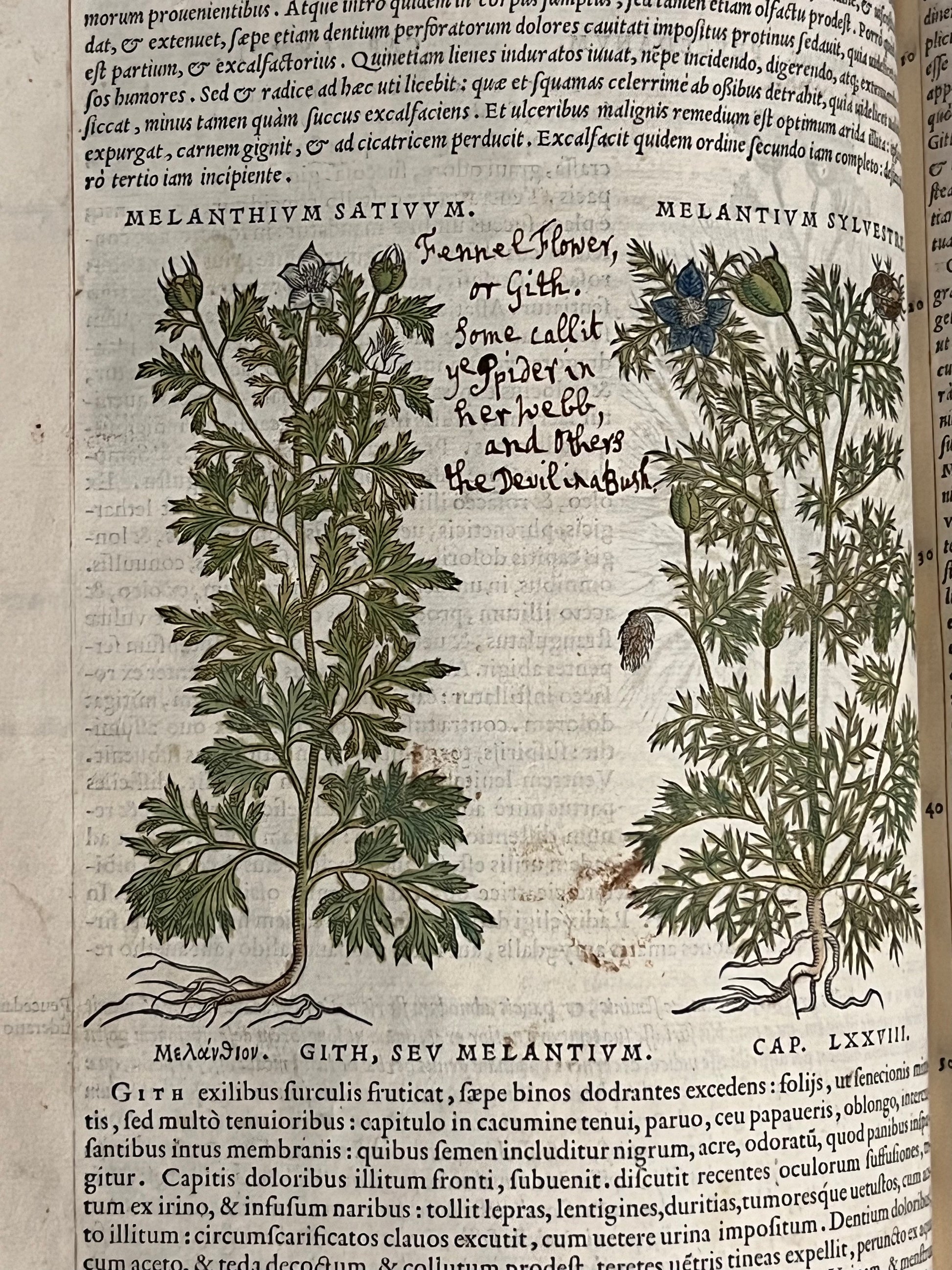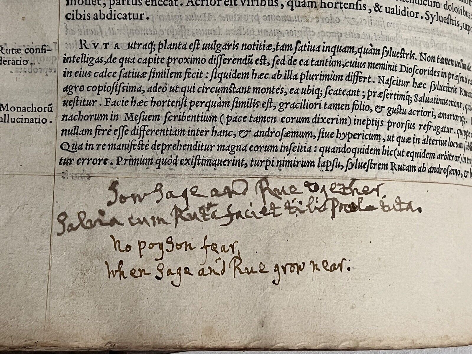 Early modern annotations in places throughout in both Spanish and Latin indicating early Continental ownership. The English annotations, circa the 18th century, indicate that this book was acquired on a Grand Tour as there is a transcription of the inscription found on Mattioli's tombstone in the Cathedral of Trento in this same hand. It has most likely been kept by descent in England since the 18th century. This English hand often writes rhyming couplets such as "No Poyson fear when Sage and Rue grow near", as well as the common names of each plant such as "Nightshade", "Hemlock", "Devil's home", "Opium", etc. The English hand is probably circa 1720.