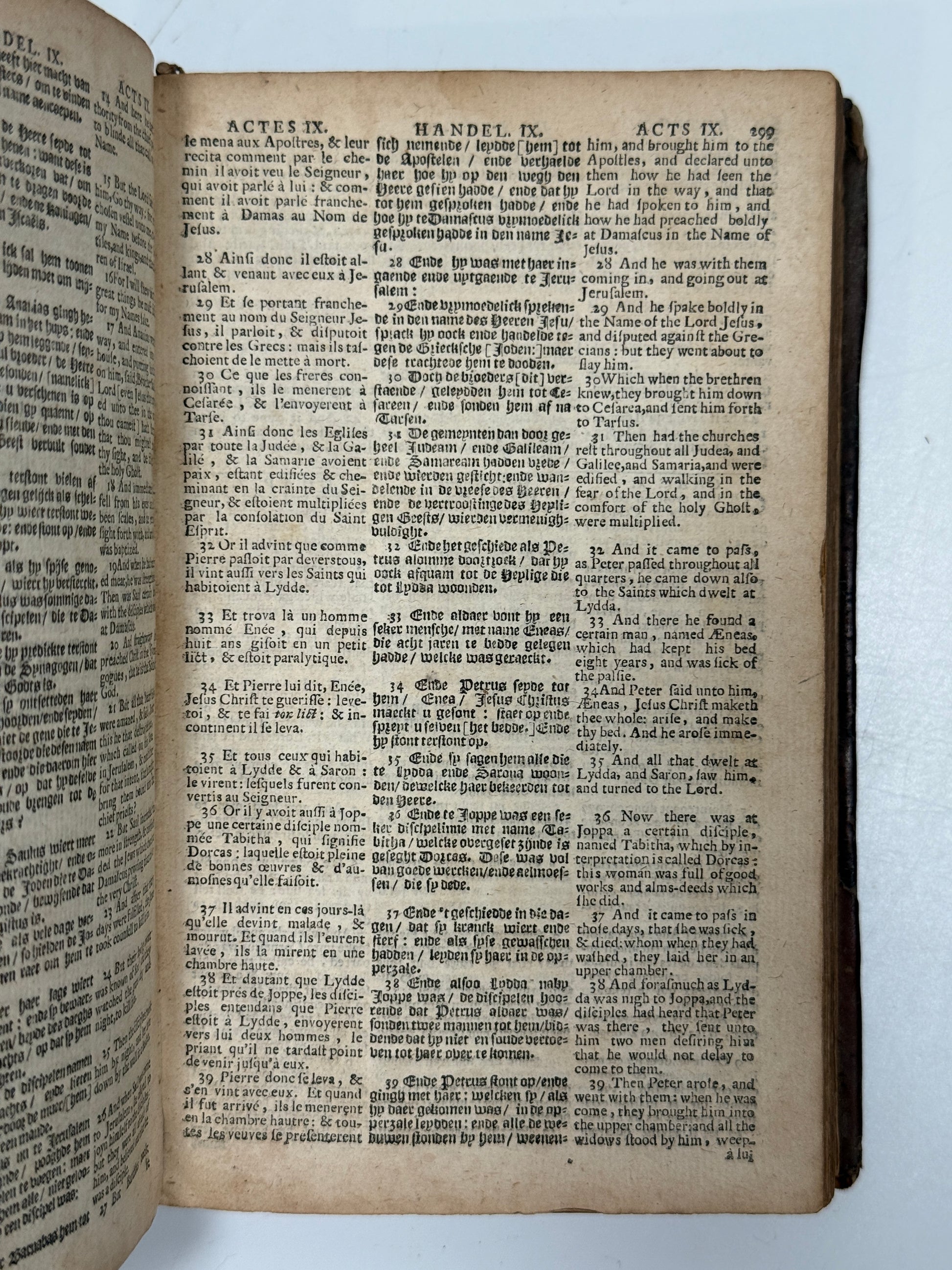 An exceptionally rare 17th century New Testament printed in English, Dutch, and French in parallel columns. Do note that this is the New Testament only so does not include the Old Testament, but this is as printed. This is not one volume only of a set, but the complete work as printed.