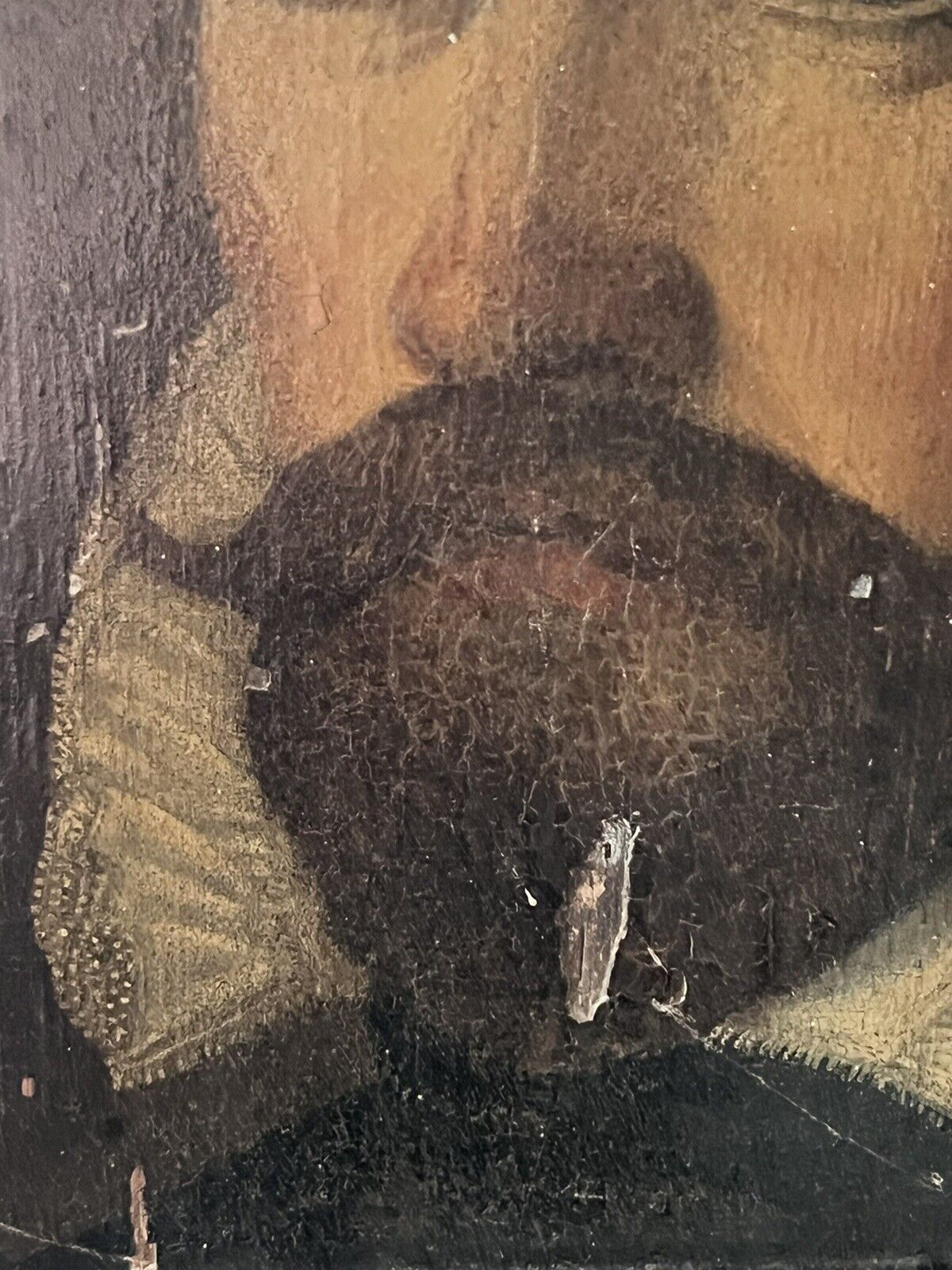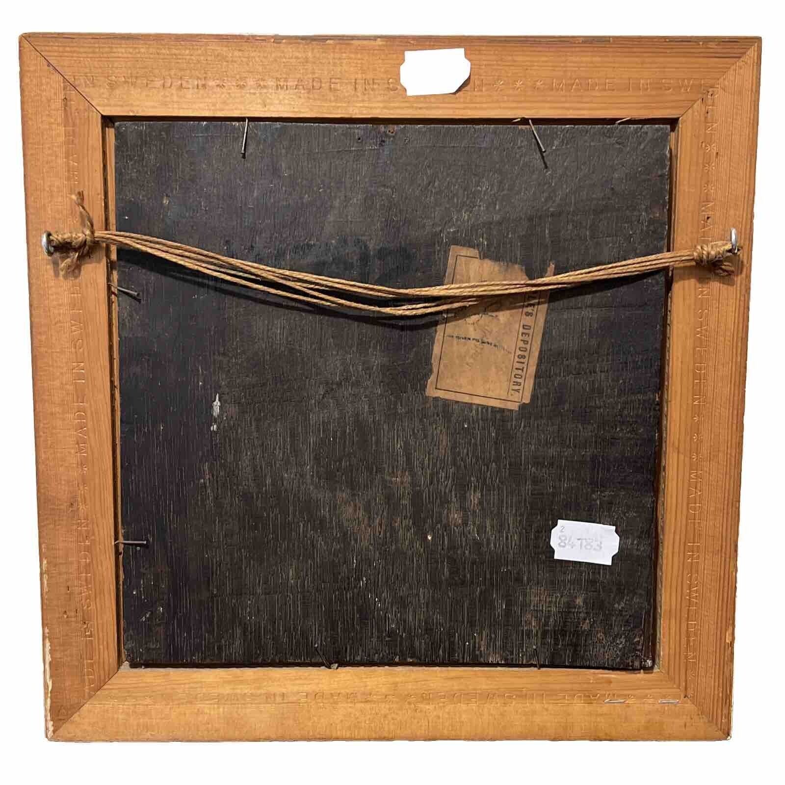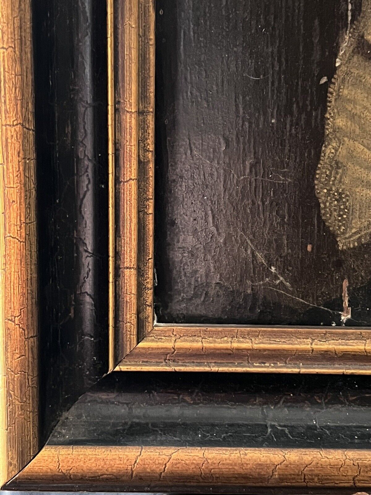 With some chips to the paint as pictured, and areas of minor loss. The oak panel itself is warped at one side but in the frame shows well nonetheless.