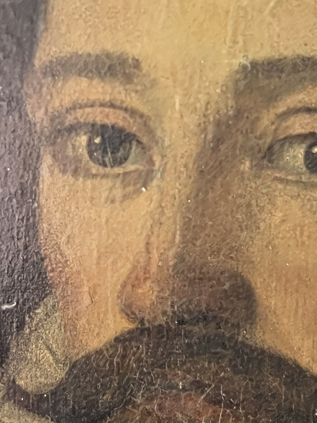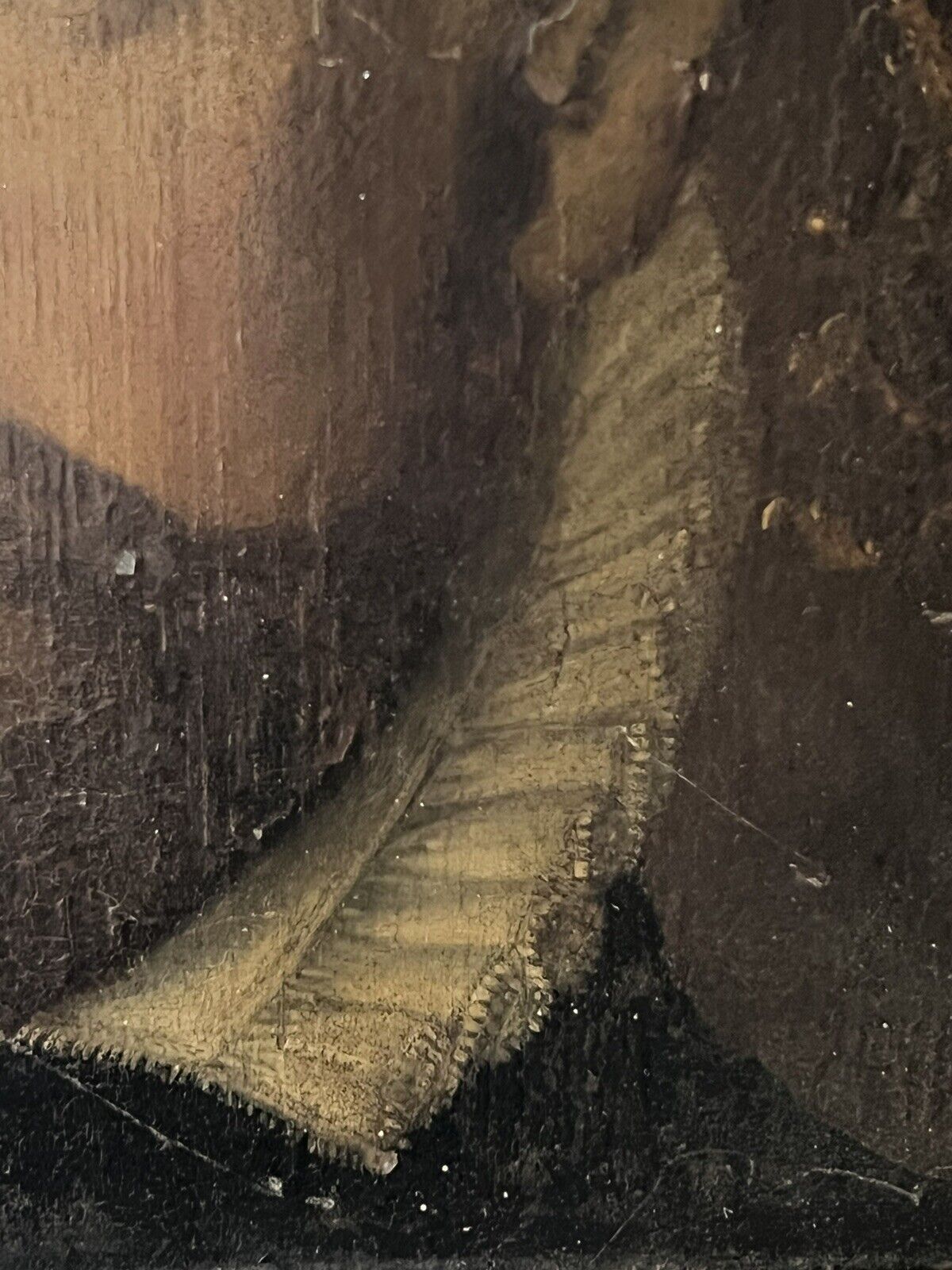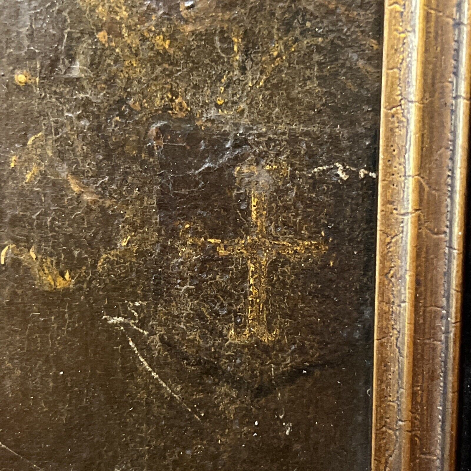 With some chips to the paint as pictured, and areas of minor loss. The oak panel itself is warped at one side but in the frame shows well nonetheless.