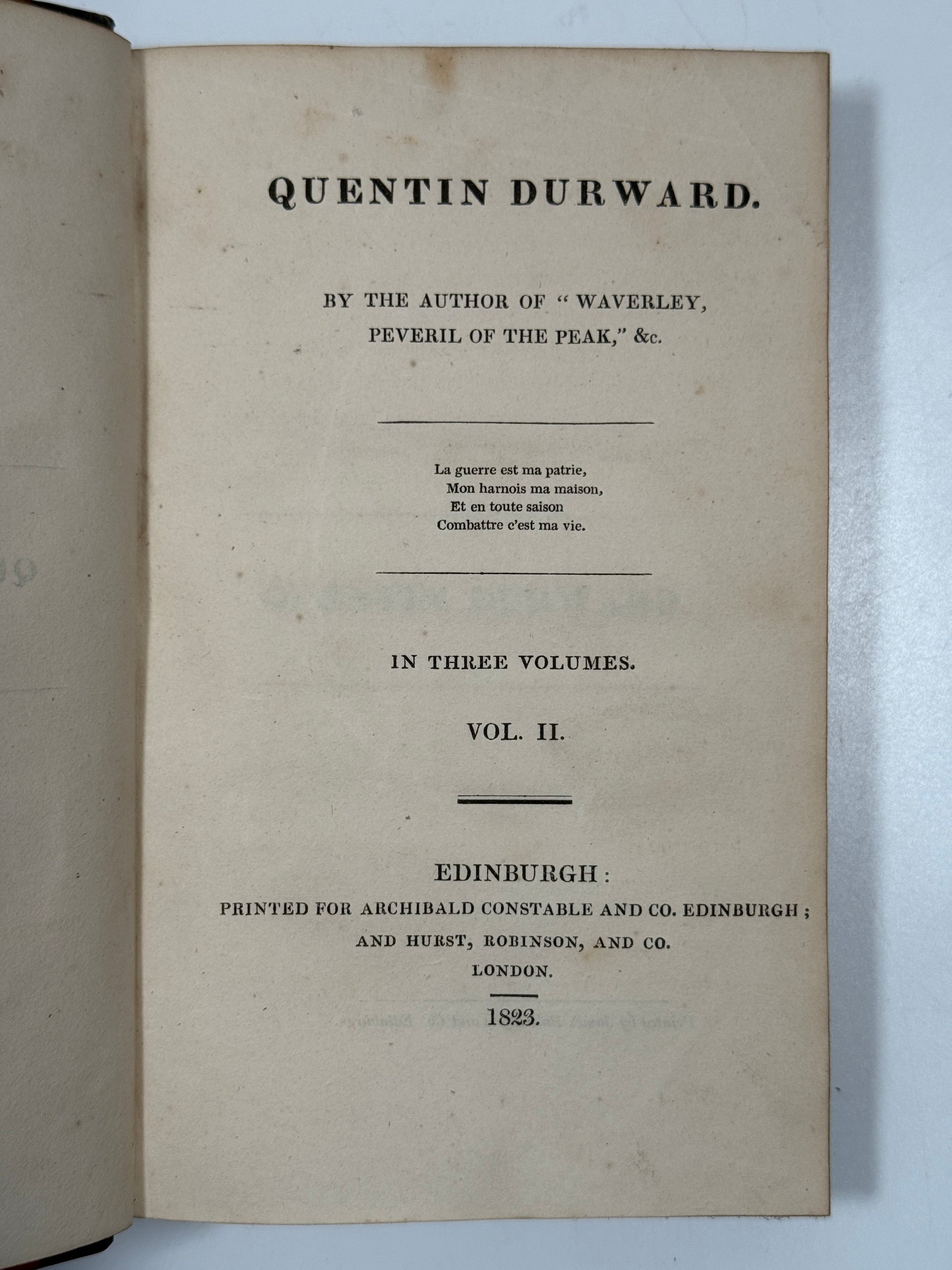 Quentin Durward. By the Author of "Waverley, Peveril of the Peak," &c. [Walter Scott]. In Three Volumes. Edinburgh: Printed for Archibald Constable and Co., Edinburgh; and Hurst, Robinson, and Co., London. 1823.