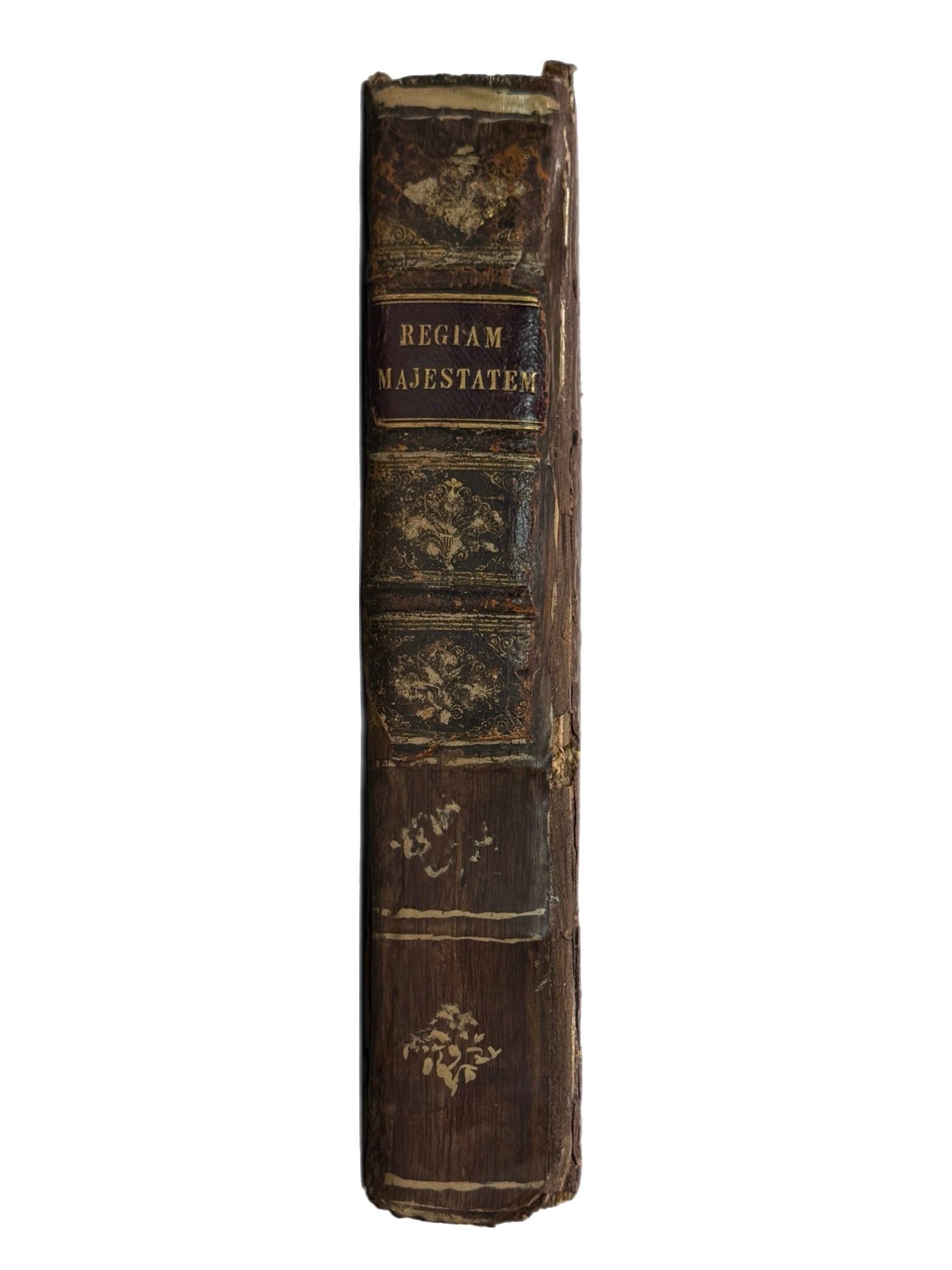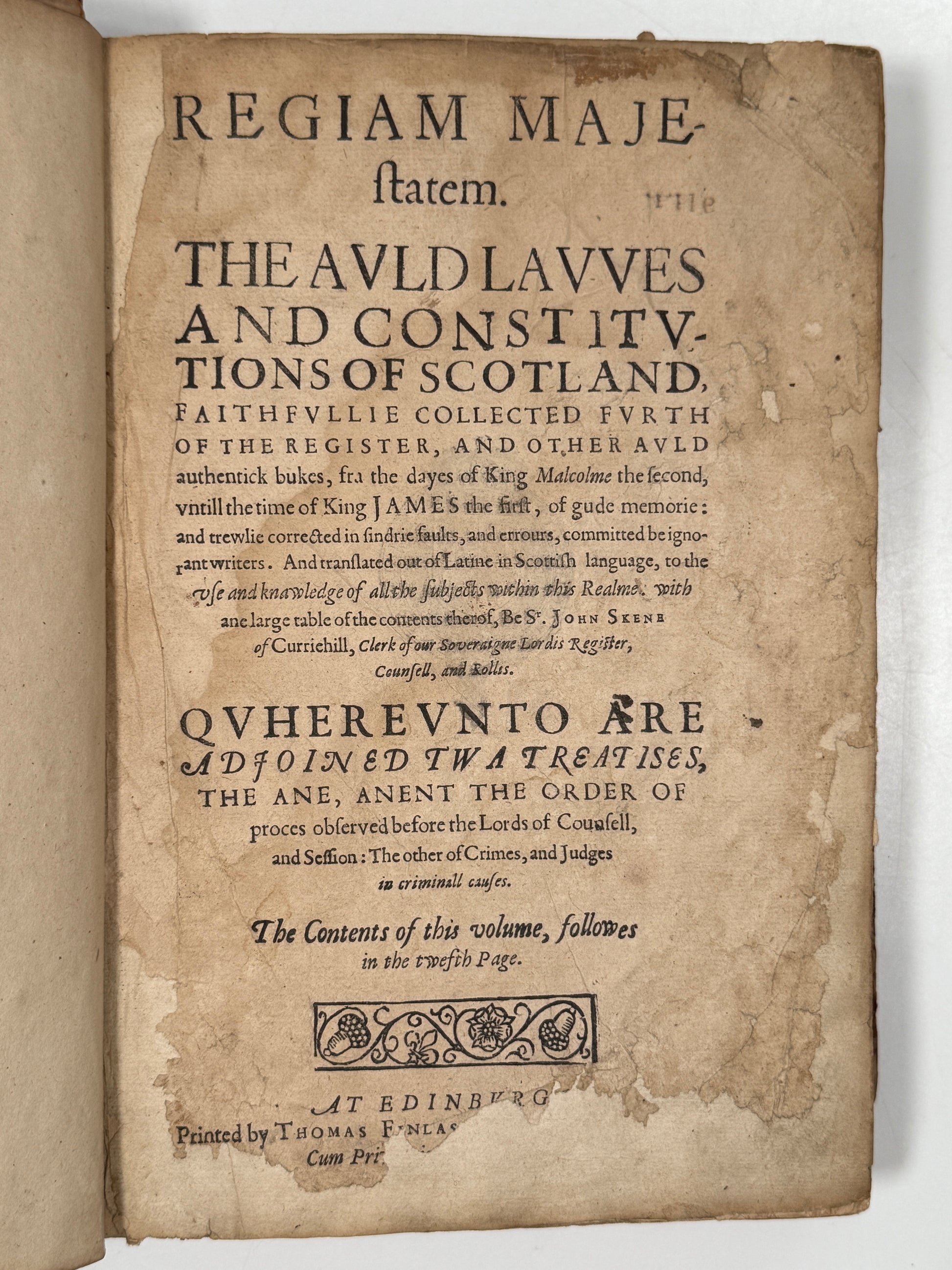FIRST EDITION in Scots, also published the same year in Latin, of Regiam Majestatem, the important collection of Scotland's ancient law compiled during the reign of Robert I (1306-29) during the Scottish War of Independence with England, with much of its material dating from the 12th century Glanvill. This copy in contemporary boards with an anachronistic Scottish thistle design painted to both boards in a naïve manner. This edition is often mistakenly described as the first English edition, but it is in fact in Scots which is often mistaken for early modern English as it is similar.