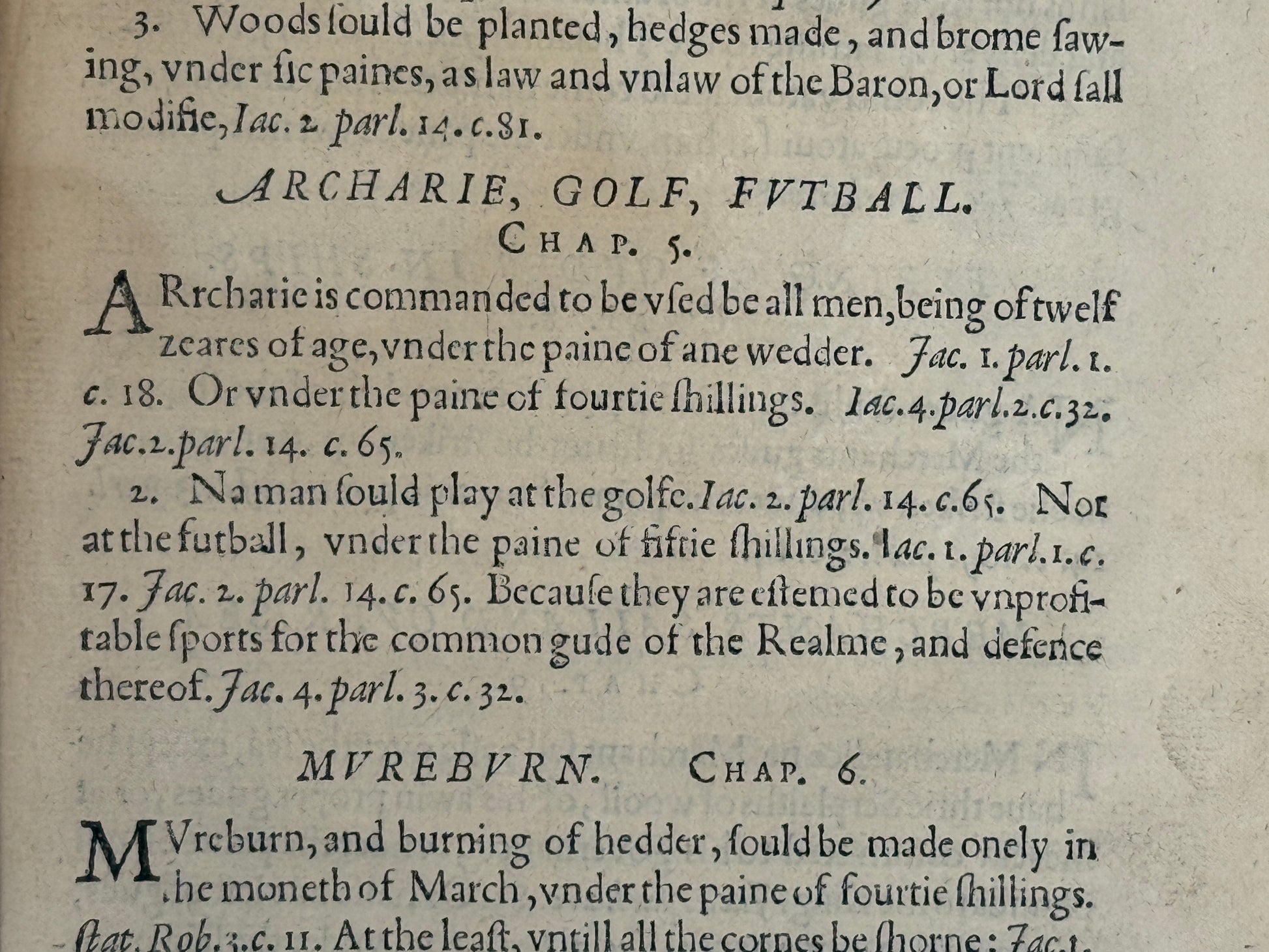 Notably, this text includes early references to the sports of both golf and football: "Na man sould play at the golfe. Not at the futball, under the paine of fiftie shillings. Because they are estemed to be unprofitable sports for the common gude of the Realme, and defence thereof."