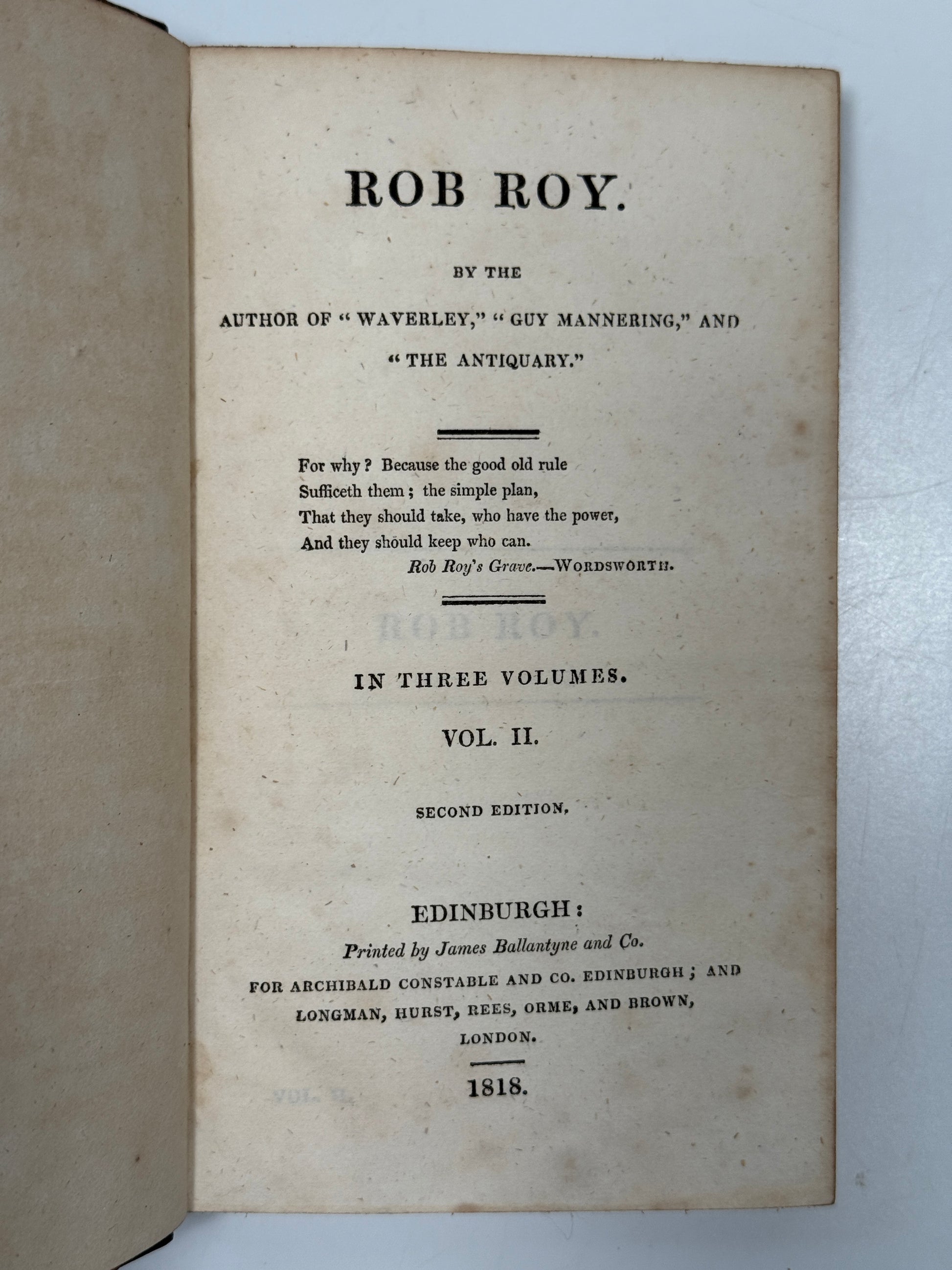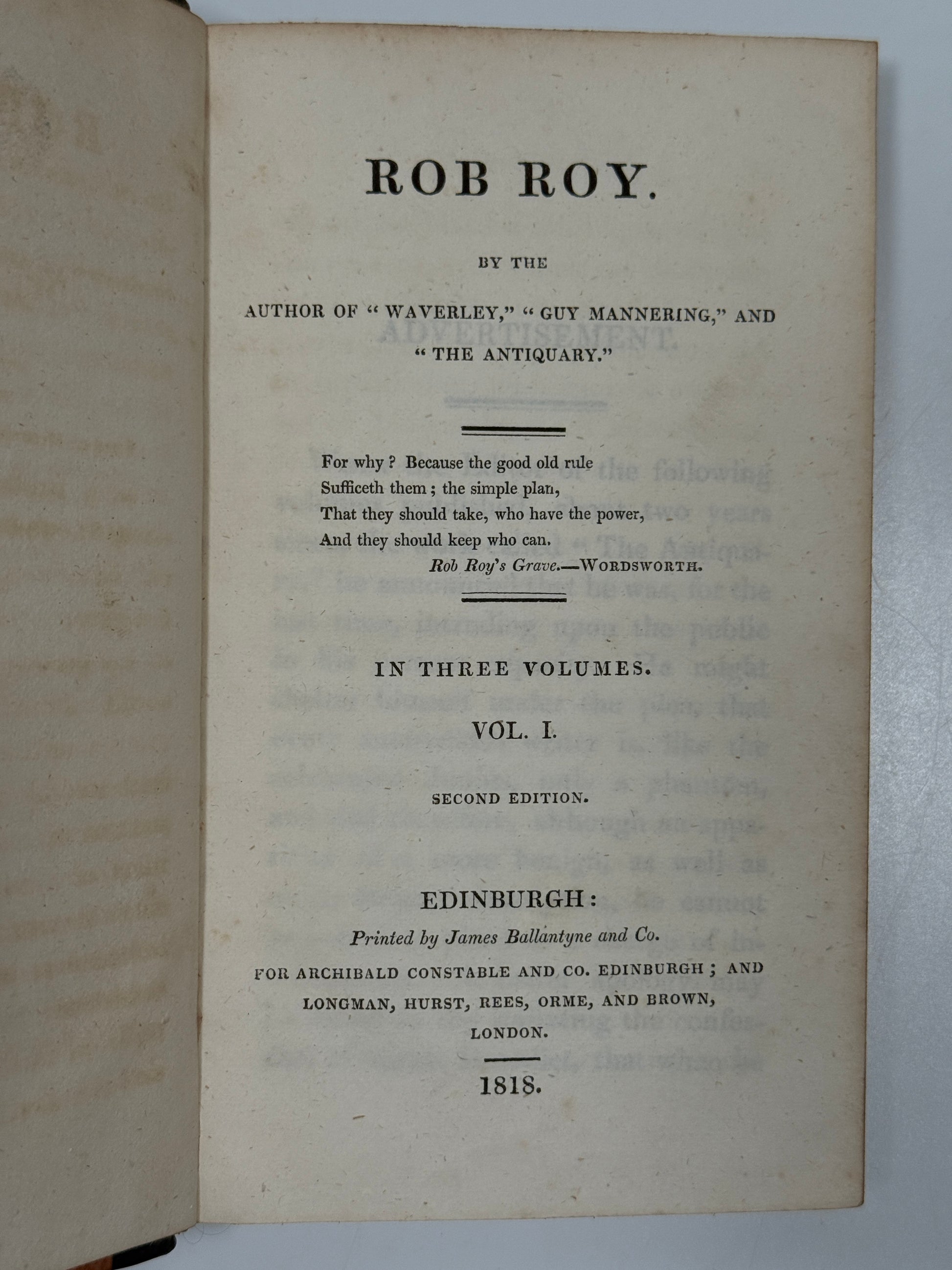 Rob Roy. By the Author of "Waverley," "Guy Mannering," and "The Antiquary." [Walter Scott]. In Three Volumes. Second Edition. Edinburgh: Printed by James Ballantyne and Co. For Archibald Constable and Co., Edinburgh; and Longman, Hurst, Rees, Orme, and Brown, London. 1818.