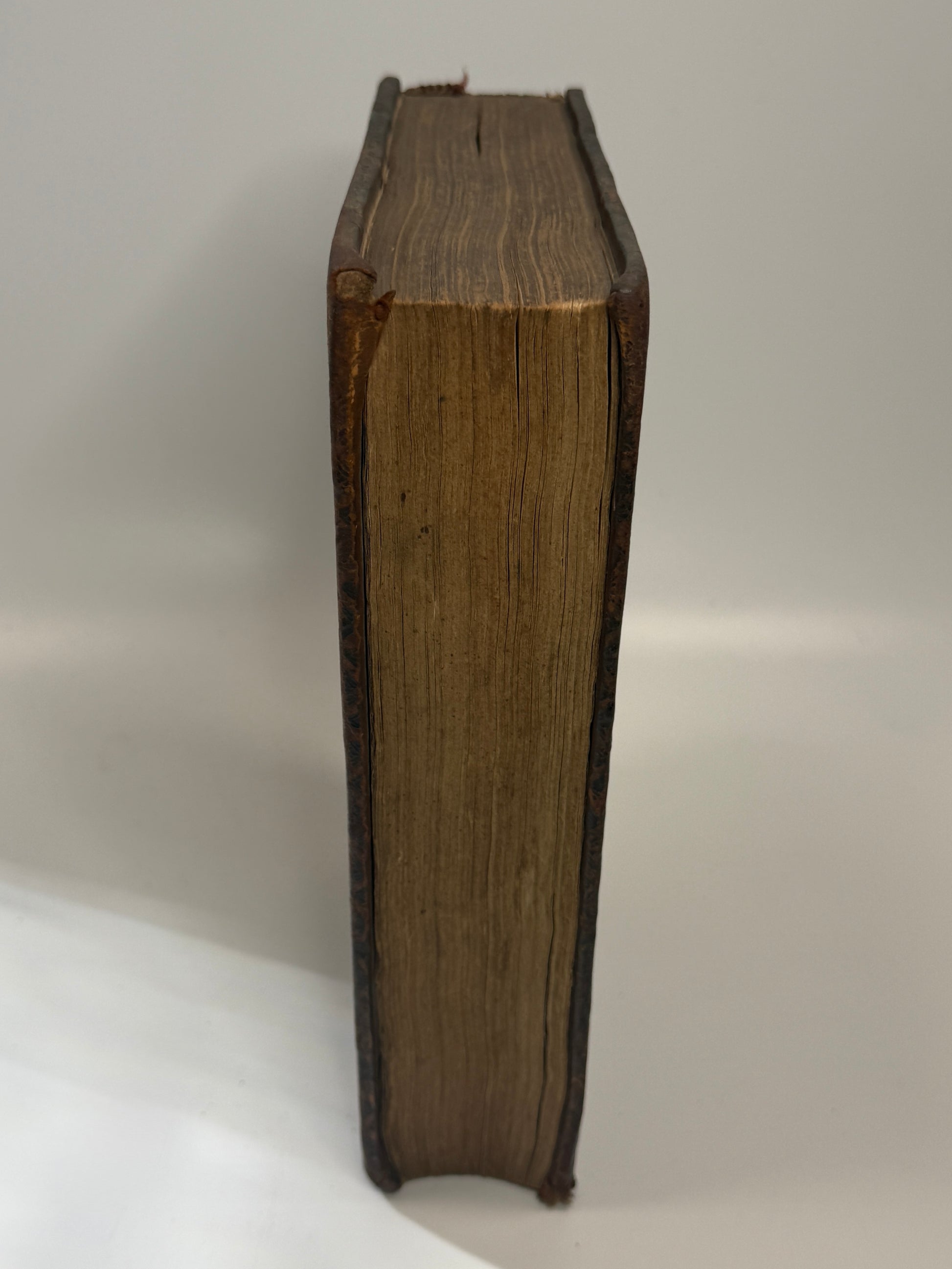 Full brown calf with a tooled label in a compartment to the spine between raised bands lined with gilt. Binding lightly rubbed and scuffed. Lacking headcap and tailcap. Tooled label partially cracked and slightly peeling with very minor loss. Both boards attached with both joints and front hinge cracked, and wear to the rear hinge, thus fragile. Shelf and edge wear. Board corners turned-in. Page edges dulled with top edge darkened as often. Slight shelf lean but stands upright. No attacked bookplates. Ink inscriptions to front pastedown and ffep. Wax attached to both pastedowns. Text block fairly clean with light toning, occasional foxing, some pencil marginalia, and minor dampstaining to a small number of leaves. Endpapers toned as commensurate with the full leather binding.