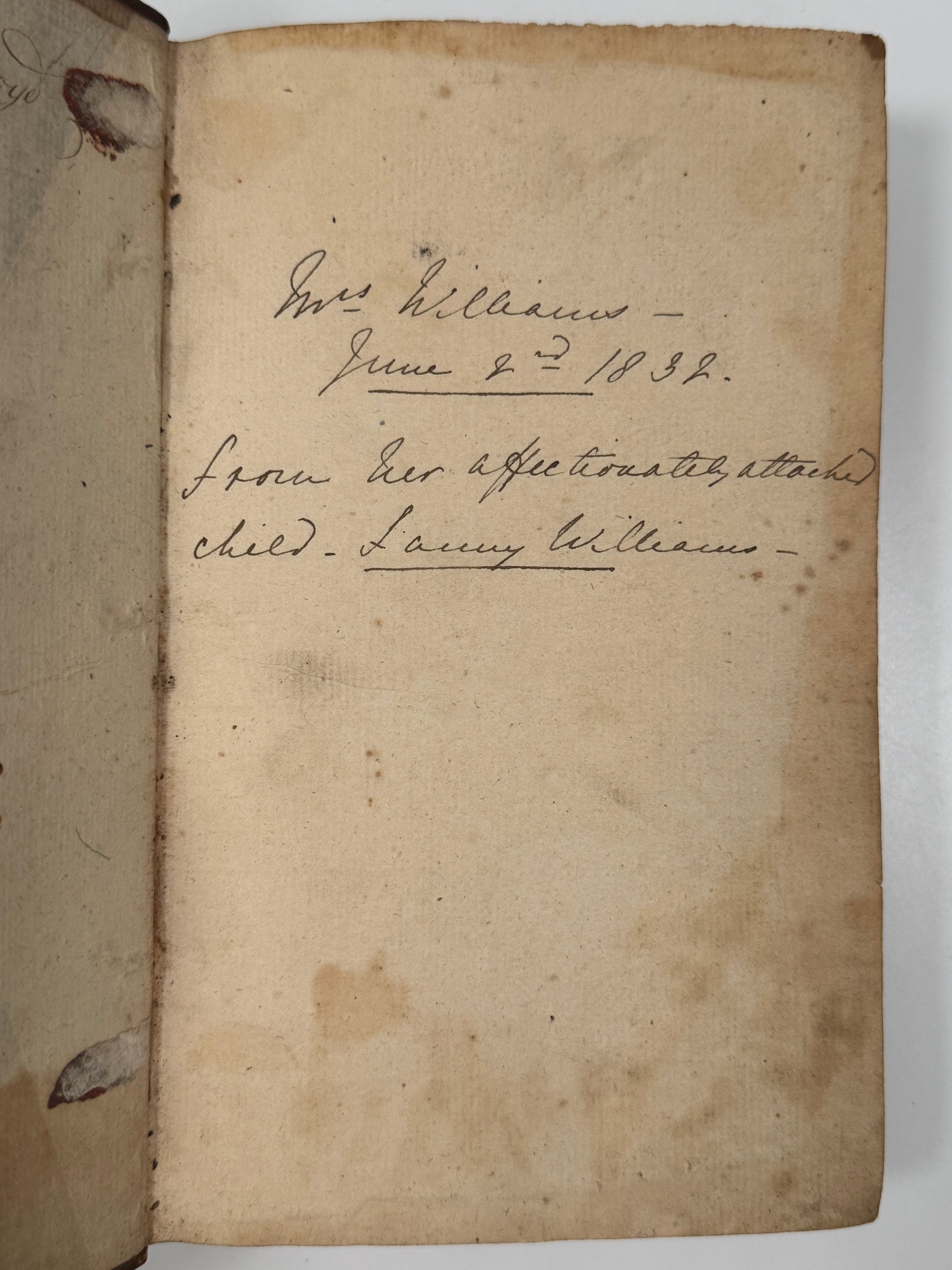 Ink inscription reading "Mrs Williams - June 2nd 1832. From her affectionately attached child - Fanny Williams."