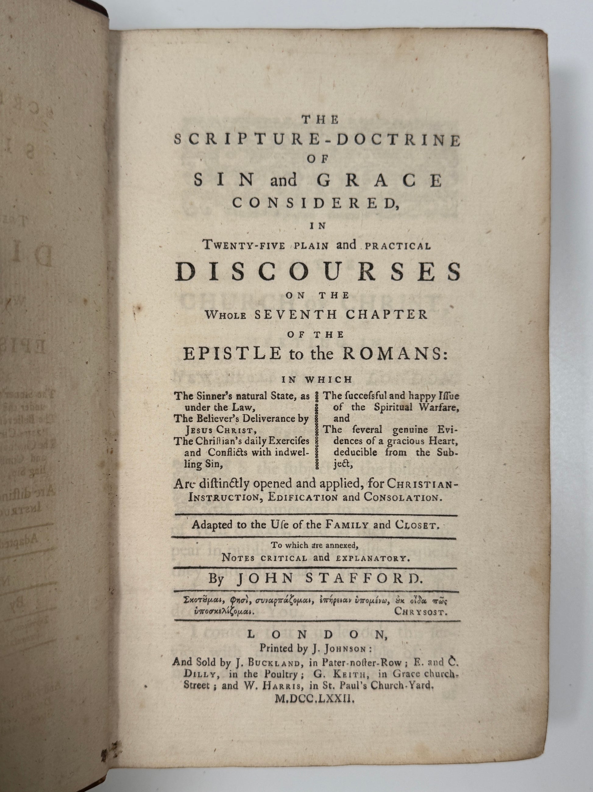 The Scripture-Doctrine of Sin and Grace Considered, in Twenty-Five Plain and Practical Discourses of the Epistle to the Romans: In Which the Sinner's Natural State, as Under the Law; The Believer's Deliverance by Jesus Christ; The Christian's Daily Exercises and Conflicts with Indwelling Sing; The Successful and Happy Issue of the Spiritual Warfare; and the Several Genuine Evidences of a Gracious Heart, Deducible from the Subject, are Distinctly Opened and Applied, for Christian Instruction, Edification and Consolation. Adapted to the Use of the Family and Closet. To Which are Annexed, Notes Critical and Explanatory. By John Stafford. London: Printed by J. Johnson: and Sold by J. Buckland, et al., MDCCLXXII (1772).