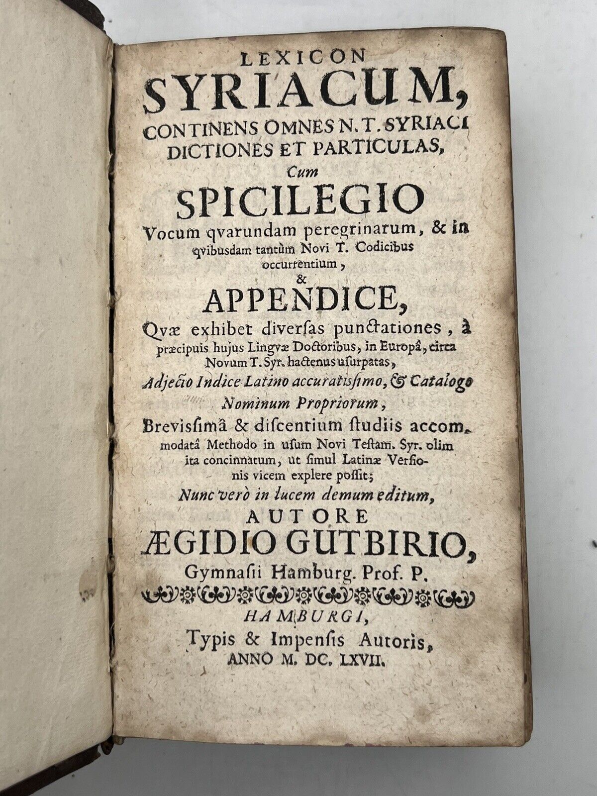 Novum Testamentum Syriacum [...]. By Aegidius Gutbier. Hamburg: Typis & Impensis Autoris, 1663-4. [Together with] Lexicon Syriacum, continens omnes N.T. Syriaci dictiones et particulas [...]. By Aegidius Gutbier. Hamburg: 1667. [Together with] Notae Criticiae in Novum Testamentum Syriacum [...]. By Aegidius Gutbier. Hamburg: Typis & Impensis Autoris, 1667, 8vo.