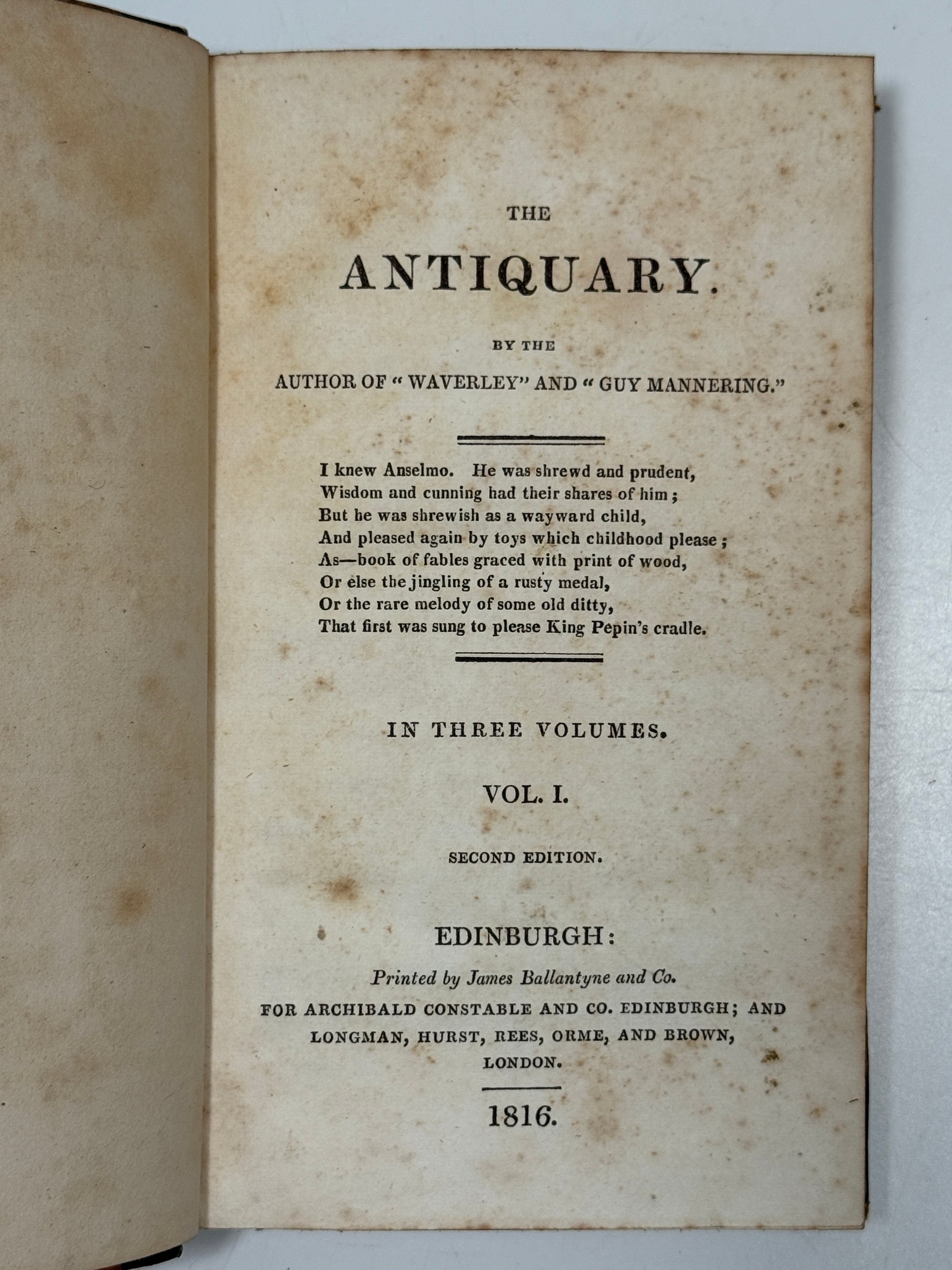 The Antiquary. By the Author of "Waverley" and "Guy Mannering." [Walter Scott]. In Three Volumes. Second Edition. Edinburgh: Printed by James Ballantyne and Co. For Archibald Contable and Co., Edinburgh; and Longman, Hurst, Rees, Orme, and Brown, London. 1816.