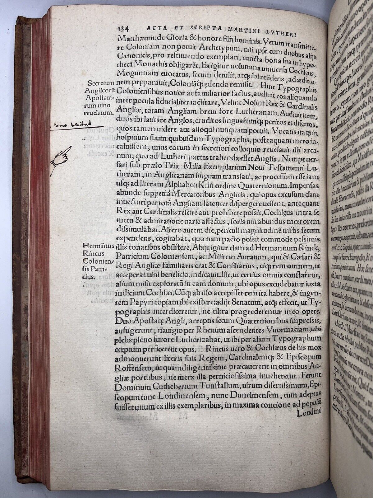 Also worthy of note, Johann Cochlaeus, the author of this book, played a significant role in the flight of William Tyndale from Cologne to Worms in 1525. His account, written on pp.132–135 of this book, is one of the earliest recorded descriptions of Tyndale’s clandestine printing of the English New Testament and the subsequent disruption of his efforts. Cochlaeus, while in Cologne, learned of Tyndale’s secretive work and alerted the authorities, leading to Tyndale’s flight. This makes this a very important book in the history of the English Bible, offering a rare Catholic perspective on Tyndale’s mission and demonstrating how an English Bible was viewed as a direct threat to Catholic orthodoxy.