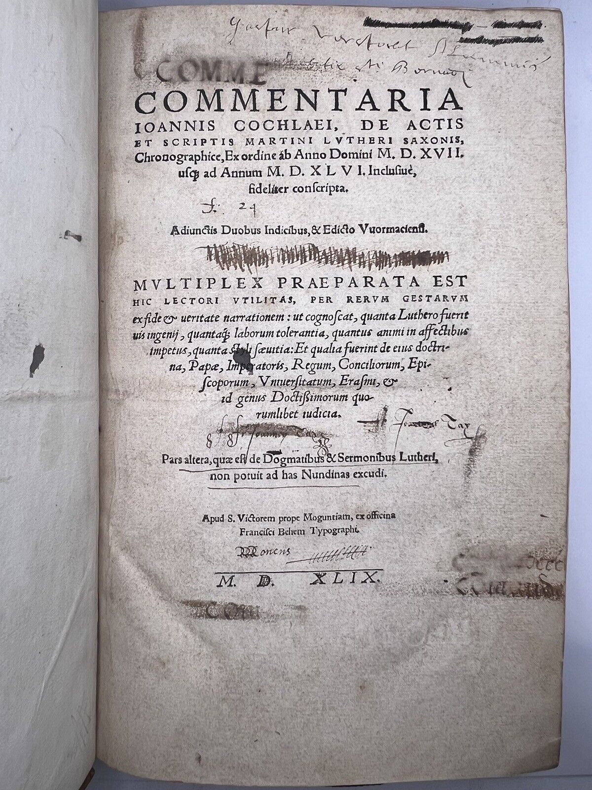 Commentaria Joannis Cochlaei, de Actis et Scriptis Martini Lutheri Saxonis, Chronographice, Ex ordine ab Anno Domini MDXVII usq ad Annum MDXLVI, Inclusiue, fideliter conscripta. [...]. Pars altera, quae est de Dogmatibus et Sermonibus Lutheri, non potuit ad has Nundinas excudi. Mainz: Francisci Behem, 1549, folio.