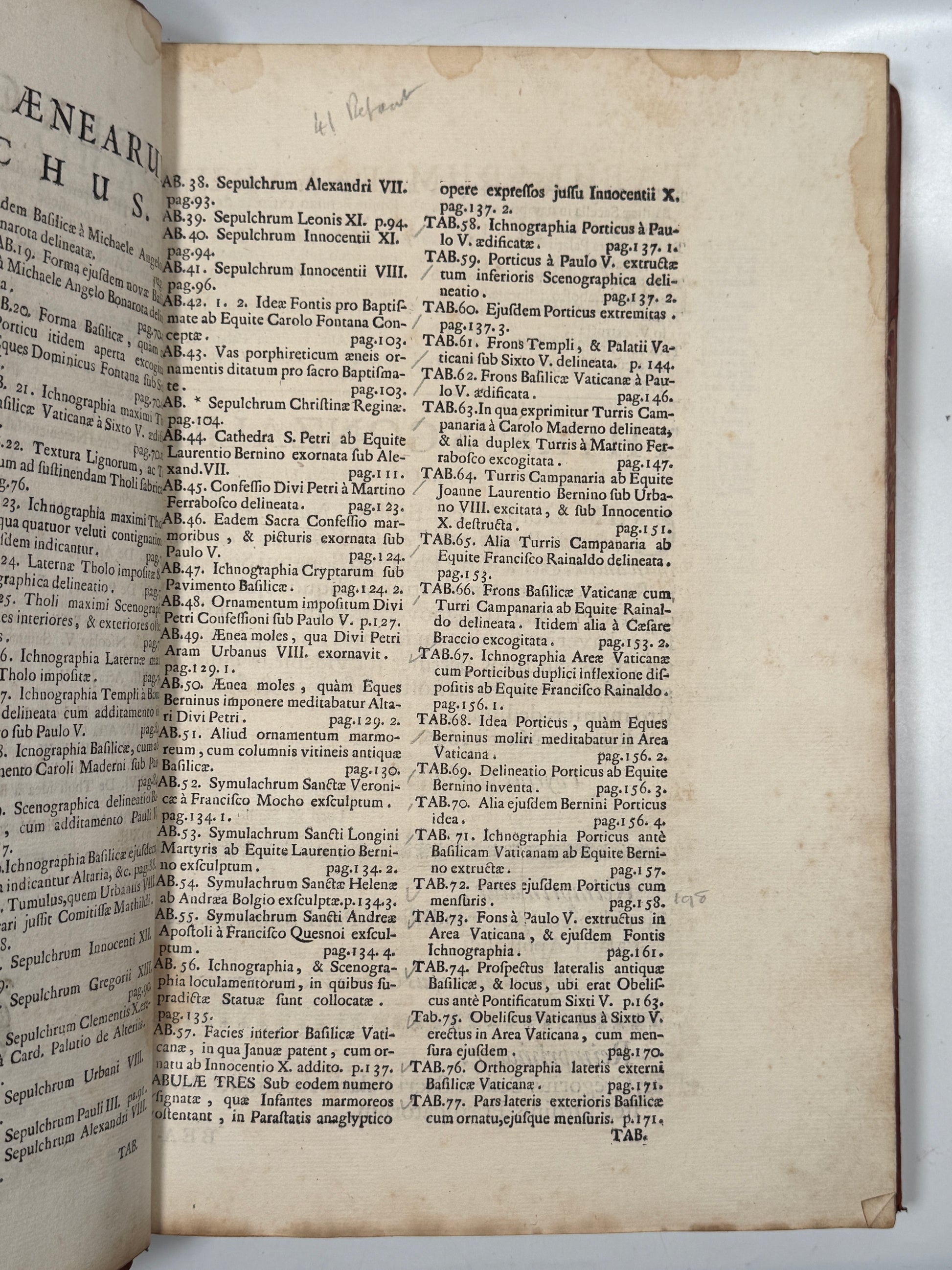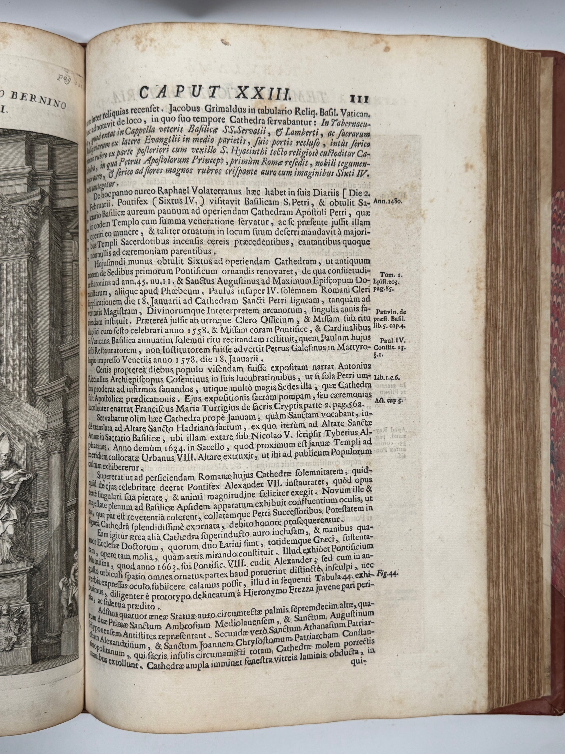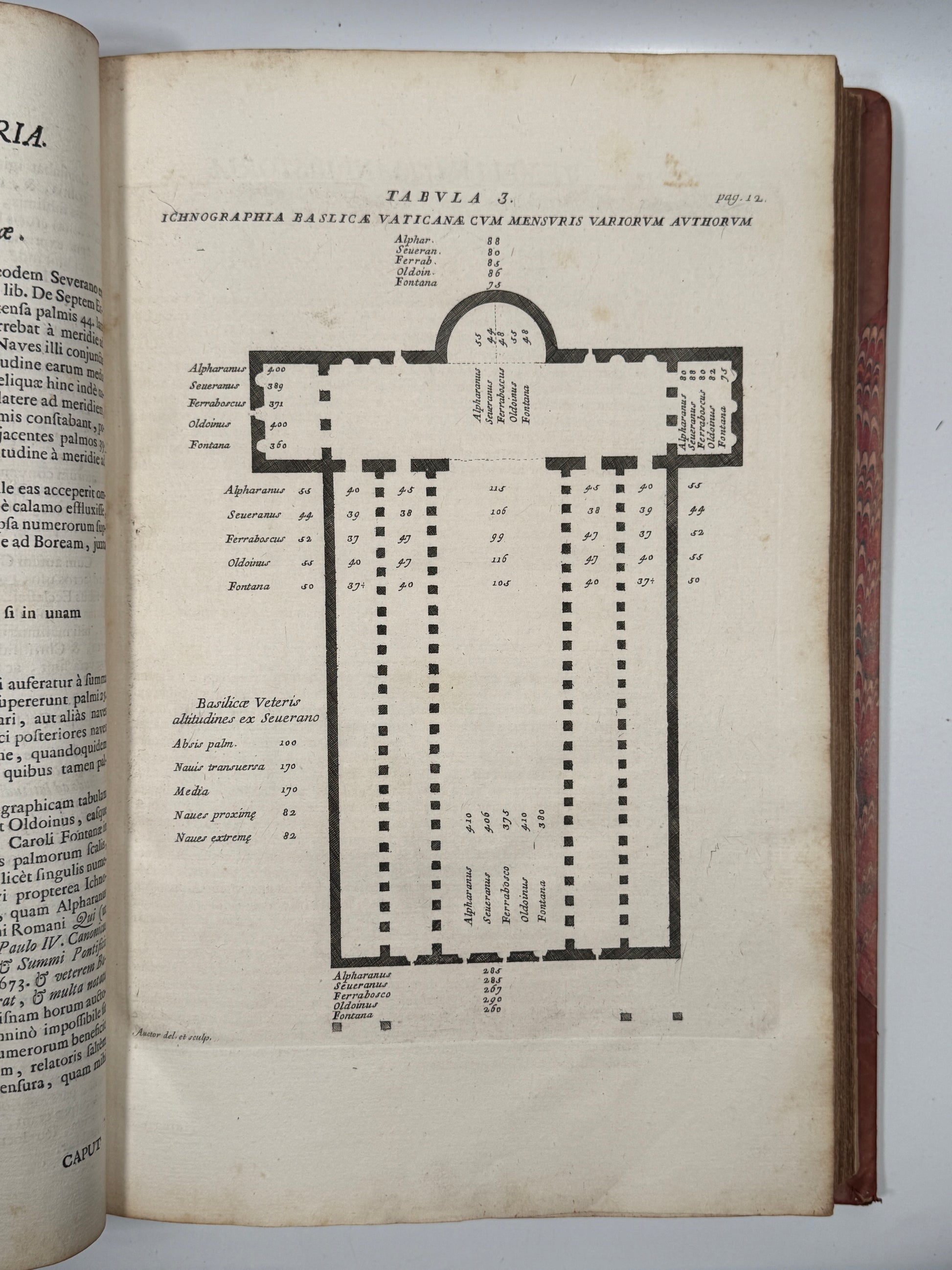 "The most valuable part of the book is the gallery of illustrations representing the church. Also Bonanni .. reuses the graphic conceptions of his precedessors, the illustrations are thoroughly consistent and uniformly formatted .. Bonanni's book is the first thorough survey of the architectural history and sculptural decoration of Saint Peter's" (Millard Coll).
