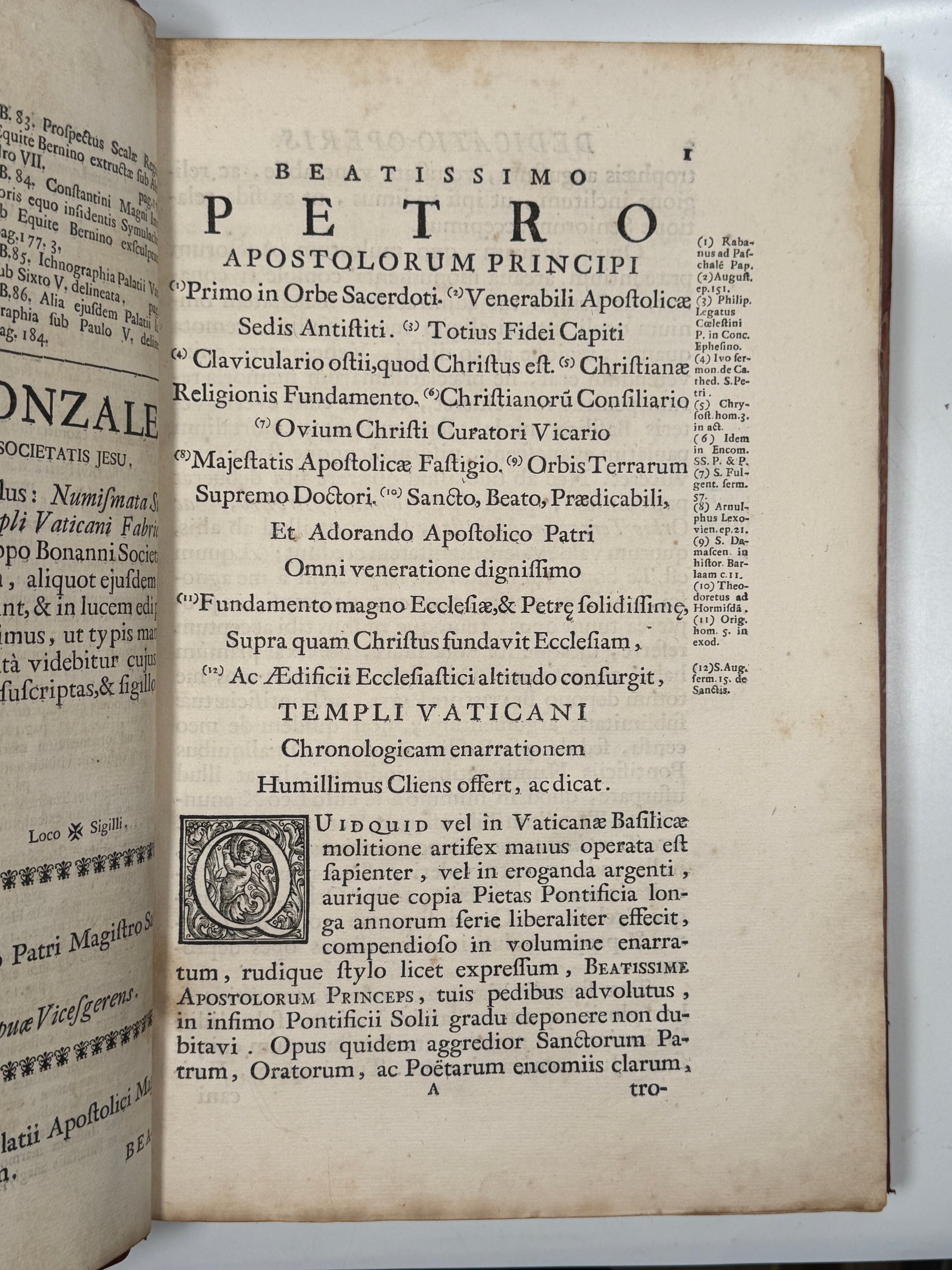 The Medals of the Supreme Pontiffs Depicting the Construction of the Vatican Basilica, Explained with a Chronological Narrative of that Same Construction and with Much Learning; and Prefaced, as a Forerunner, to a More Extensive Study of All Papal Coins. A Work Printed for the Third Time with Corrections and Additions, by Father Filippo Buonanni of the Society of Jesus. Rome, 1715. From the Press of Giorgio Placho, at St. Mark’s, folio.