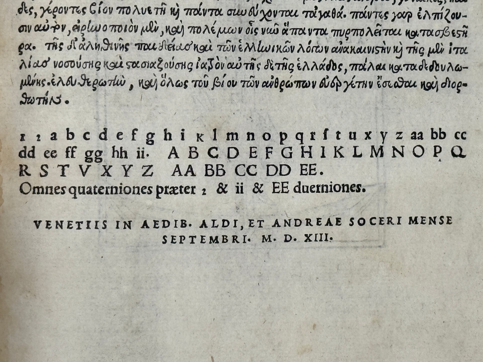 Aldus relied on his brilliant circle of Greek collaborators to prepare the text. Musurus’ edition is described by Nigel Wilson as “one of the finest achievements of Renaissance scholarship, produced from manuscripts in a notably good state of preservation” (From Byzantium to Italy, pp.151).