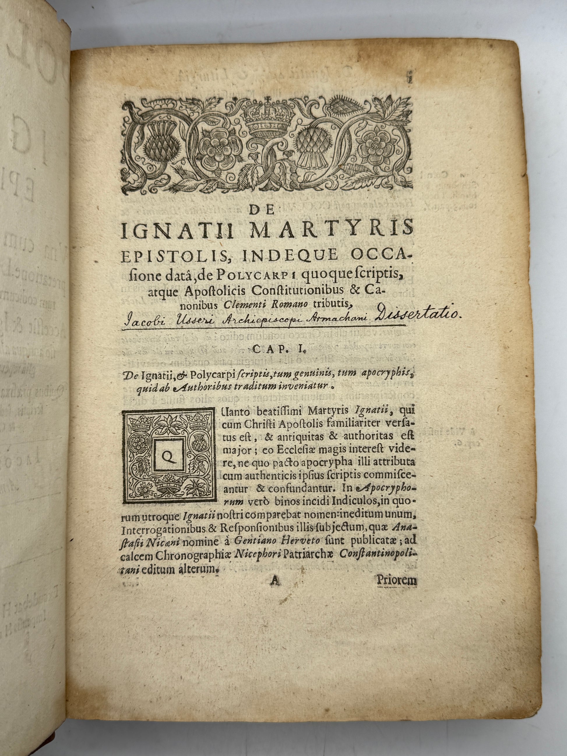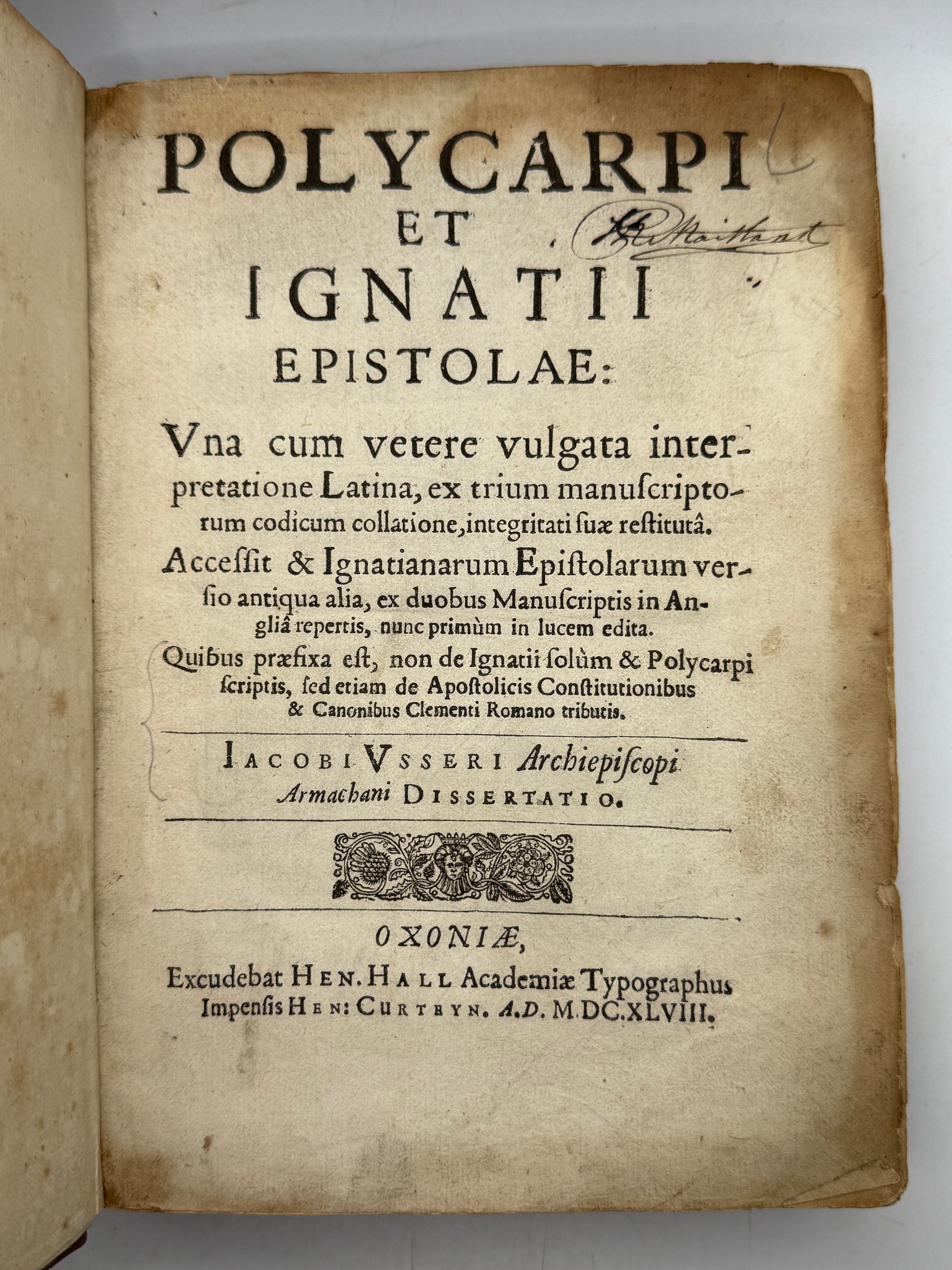 The Epistles of Polycarp and Ignatius: Together with the Ancient Vulgate Latin Interpretation, Restored to Their Integrity from the Collation of Three Manuscripts. Also Added is Another Ancient Version of the Ignatian Epistles, Found in Two Manuscripts in England, Now Published for the First Time. Prefixed to These is a Dissertation by James Ussher, Archbishop of Armagh, Not Only on the Writings of Ignatius and Polycarp but Also on the Apostolic Constitutions and Canons Attributed to Clement Romanus. Oxford, Printed by Henry Hall, Printer of the University, at the Expense of Henry Curtbyn. A.D. 1648.