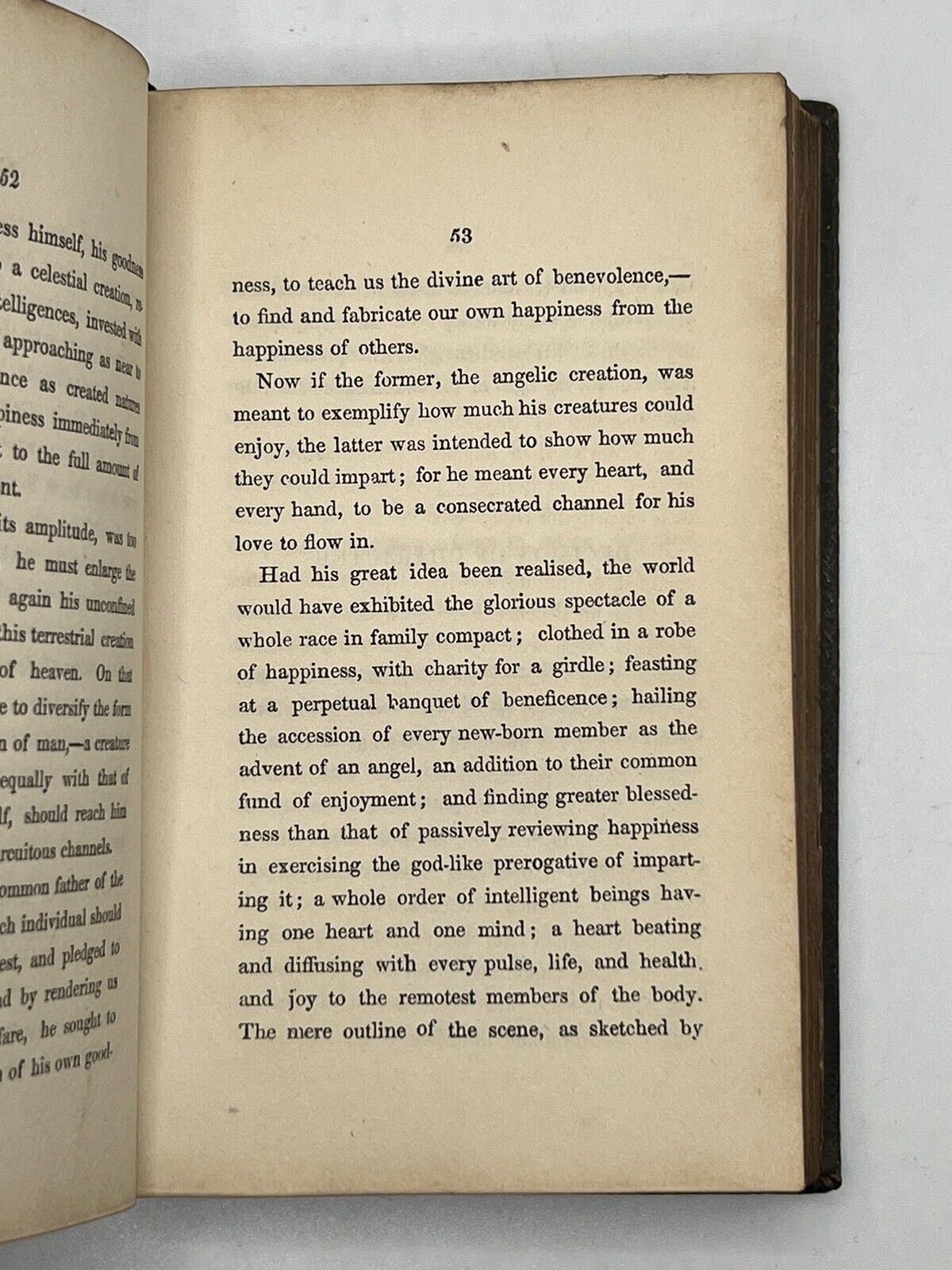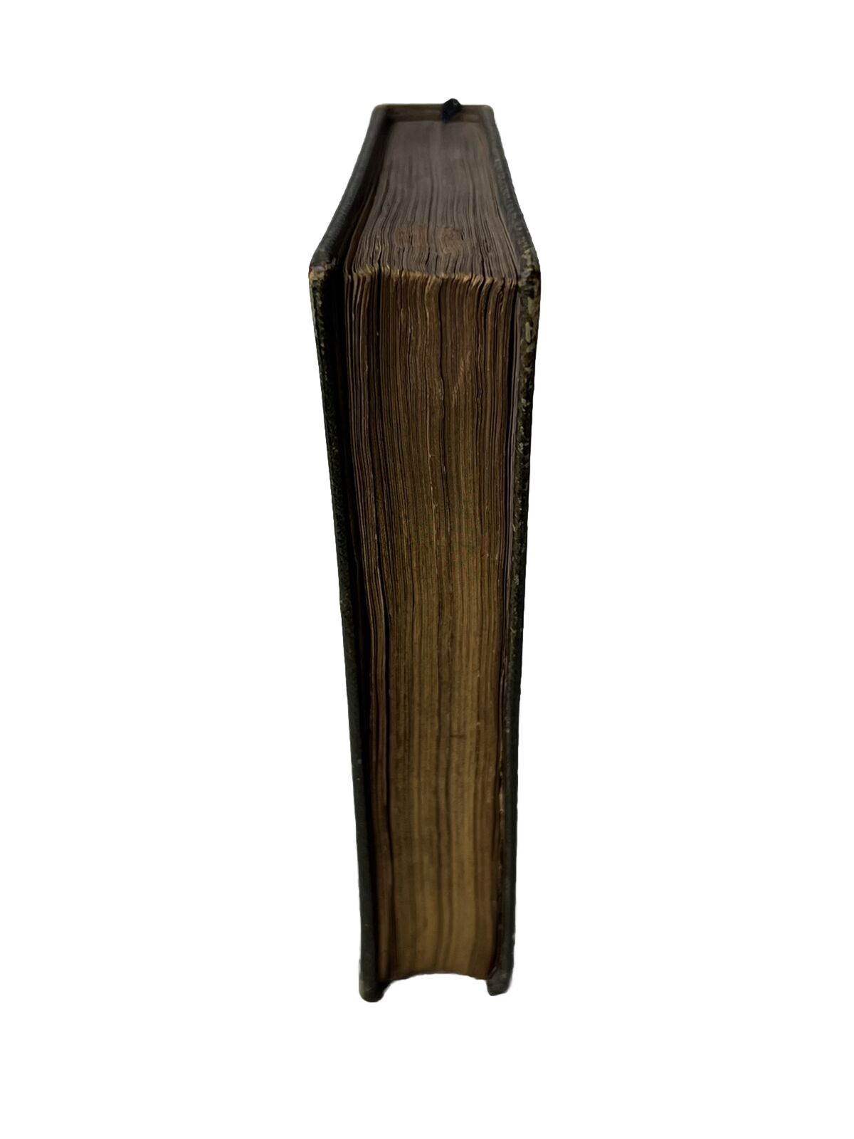 Beautifully bound with gilt tooling to spine and boards. Contains an intricate coloured engraved title page with gilt. Binding in very good condition with very minor rubbing and lightly warped boards. Both boards securely attached with front hinge cracked and very minor wear to joints and rear hinge. Very minor shelf and edge wear. Some light dulling to gilt page edges. Very small sticker with the inscription "Lonly change in death" attached to the top outer corner of the front pastedown. Text block very clean with light toning and very minor foxing.