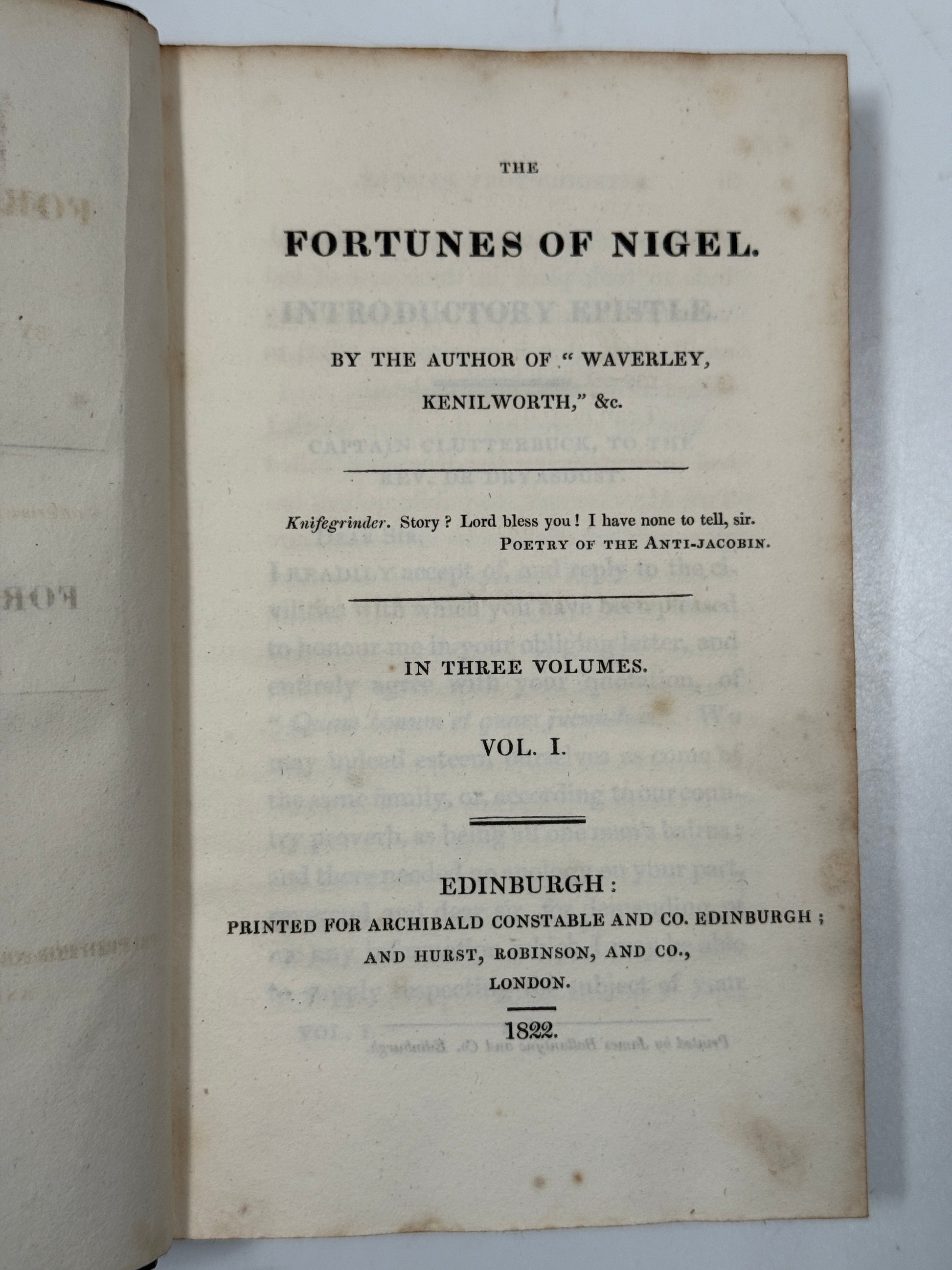 The Fortunes of Nigel. By the Author of "Waverley, Kenilworth," &c. [Walter Scott]. In Three Volumes. Edinburgh: Printed for Archibald Constable and Co., Edinburgh; and Hurst, Robinson, and Co., London. 1822.