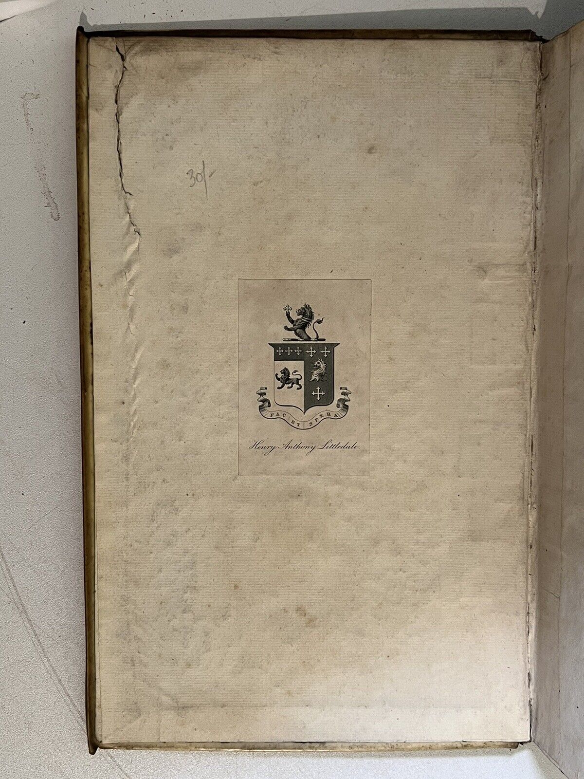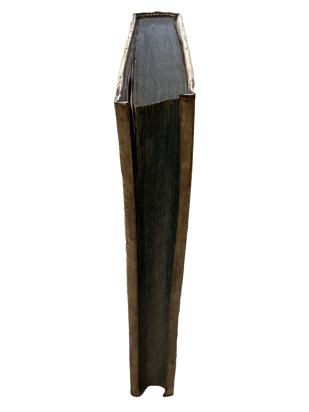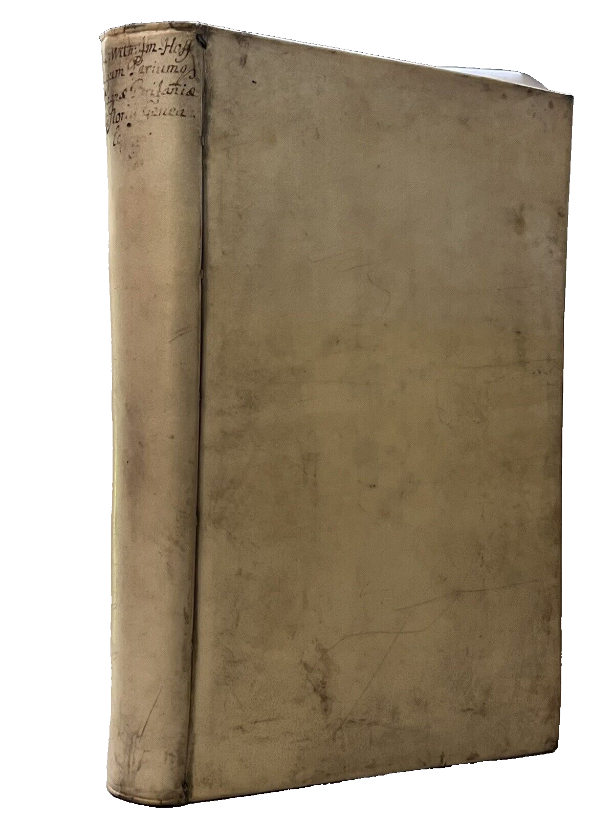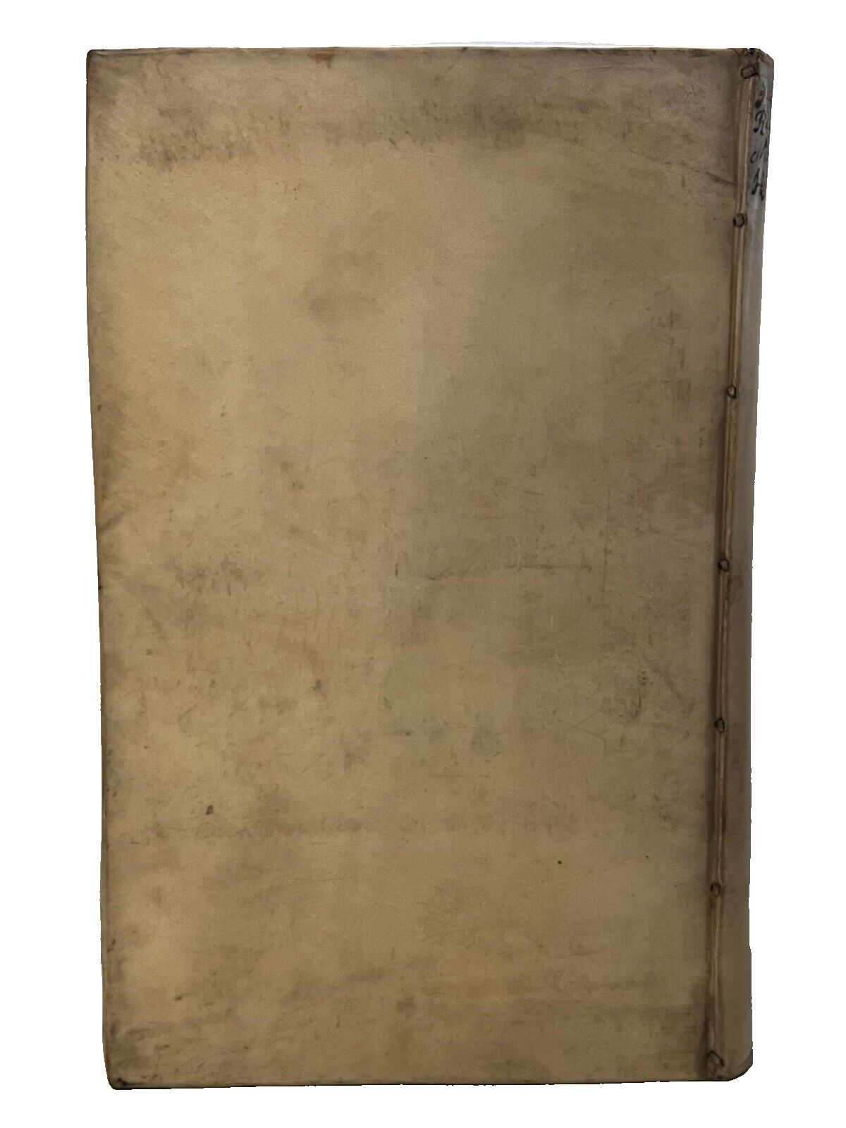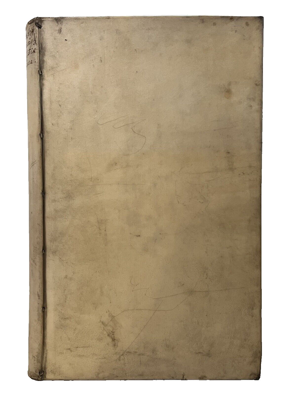 Full vellum binding with an ink title to the head of the spine. Binding lightly scuffed with some marks and scratches. Both boards securely attached, hinges reinforced with newer pastedowns. Shelf and edge wear. Blue page edges somewhat dulled, and top edge darkened as often. Bookplates attached to the front pastedown and ffep. First half title attached with wormholes to the hinge, thus somewhat fragile and partially detached at the top. Text block very clean with light toning, and occasional foxing and marks. Very small hole to P3. Very minor repairs to small wormholes to the rear blank. Small wormholing to the first few and last few leaves.