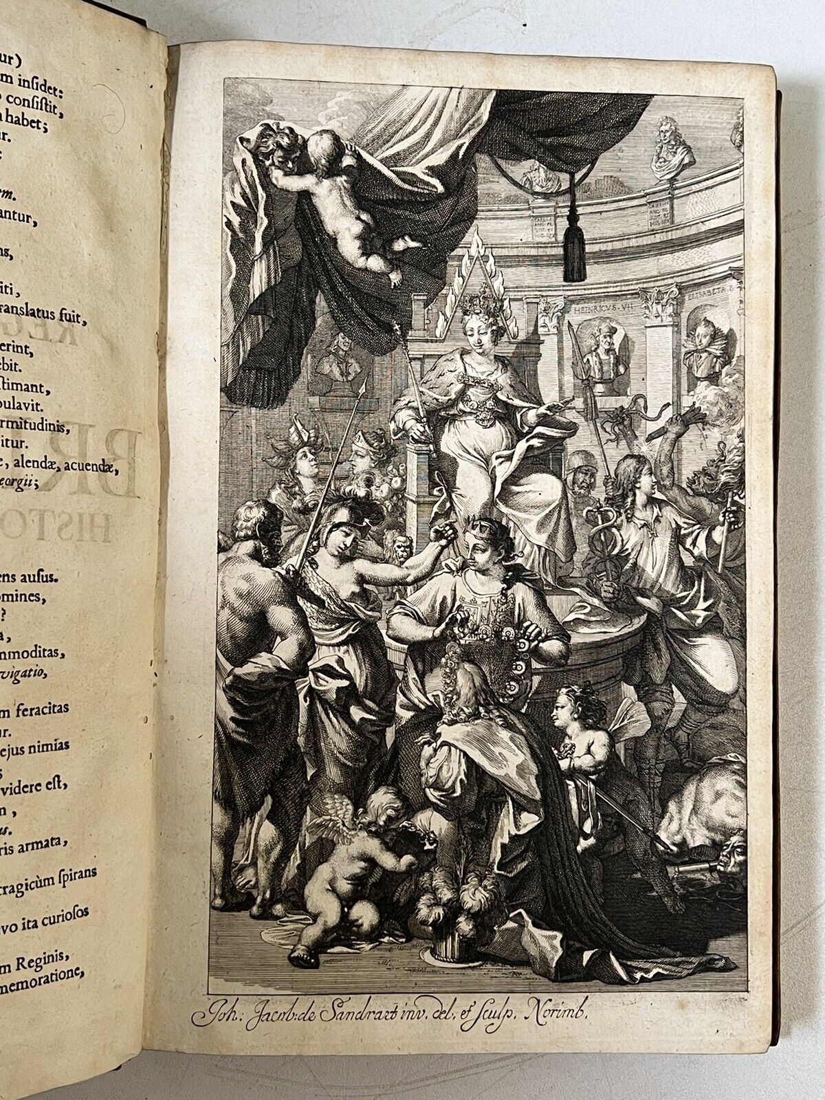 The Genealogical History of the Kings and Peers of Great Britain. In which the origins, family trees, and memorable deeds of both ancient and recent families in that land are reviewed and explained, adapted to the most current state of England, with added engraved plates of coats of arms and a necessary index, through the study and work of Jacob Wilhelm Imhoff. Nuremberg: Published by the Sons of Johann Andreas Endter. In the year 1690.
