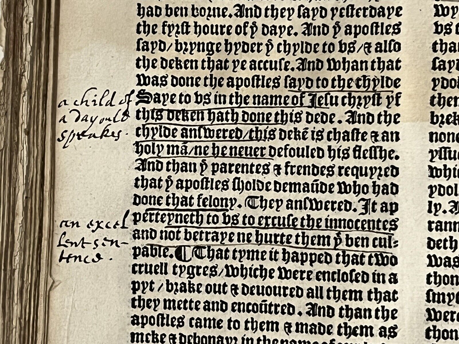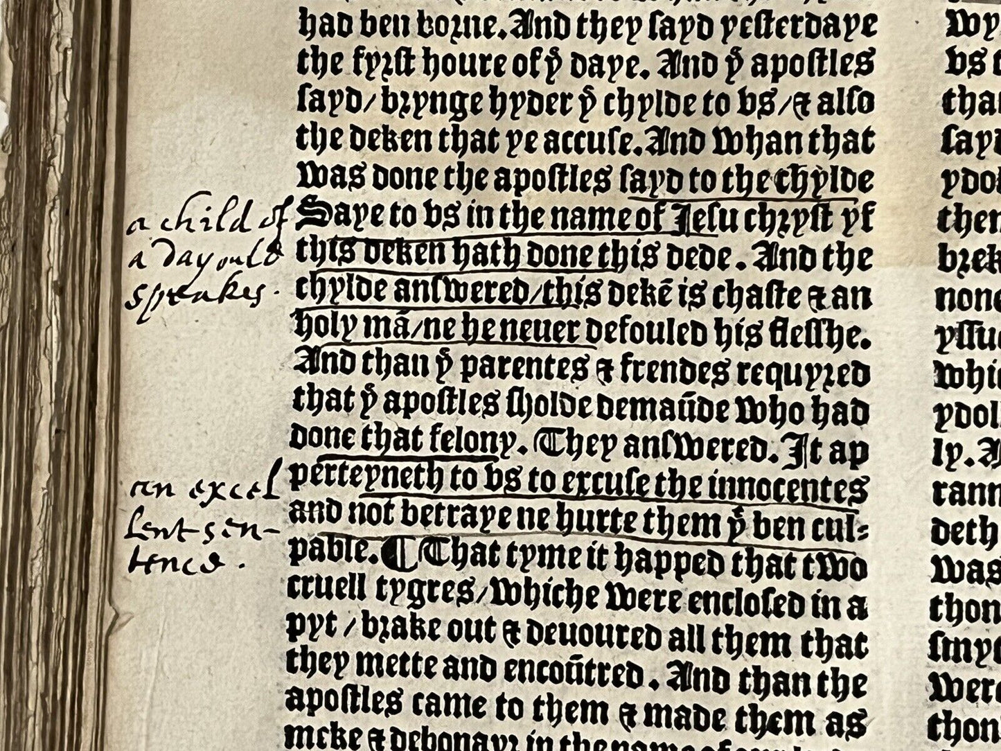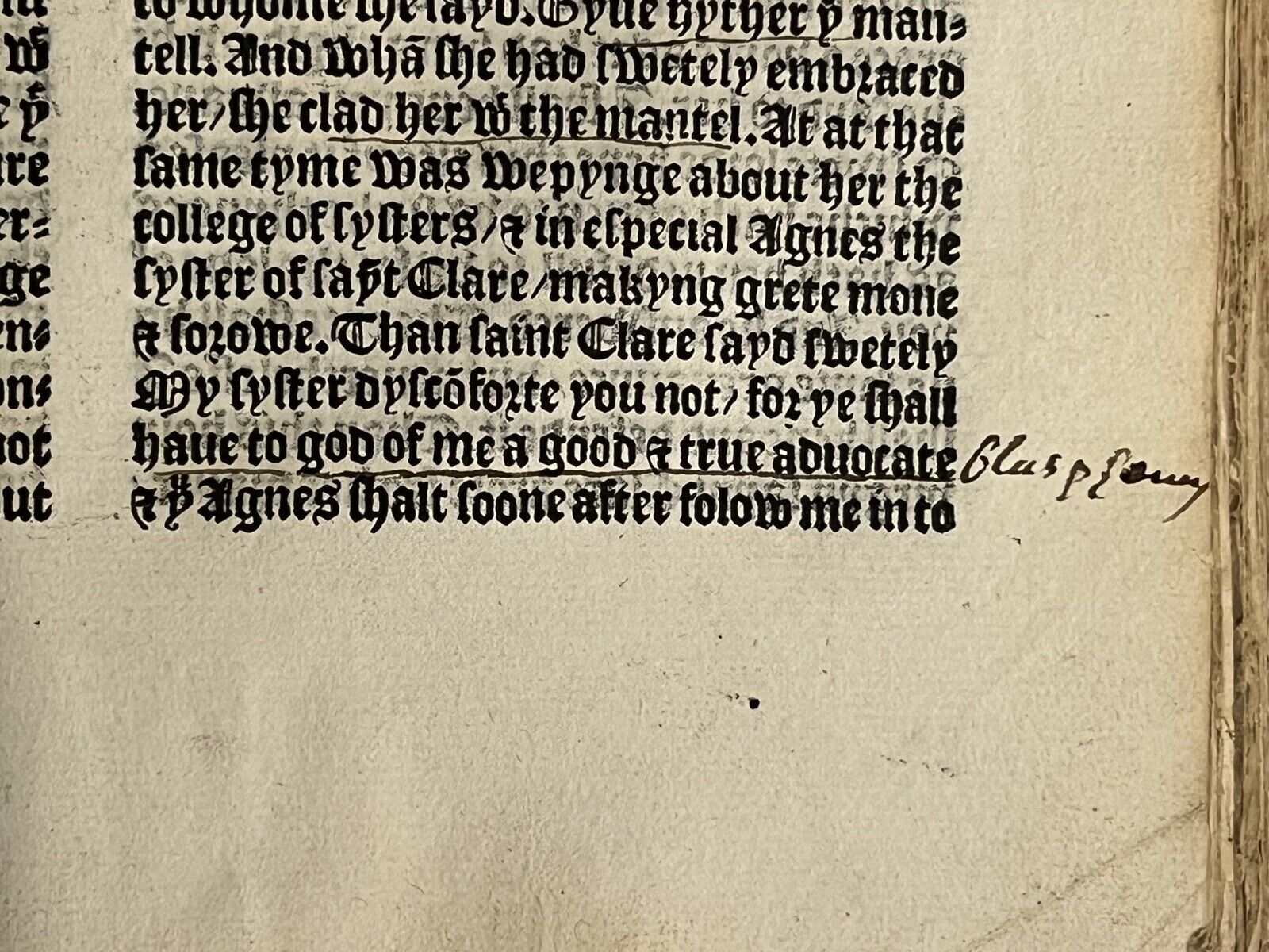 Contemporary early English marginalia (circa before 1550, likely very early), often very interesting indeed, including several accusations of blasphemy levied against the author, among other interesting comments which will profitably reward study, and several references to the Bible - something particularly significant as the handwriting style seems most consistent with a early date (c.1520s-1530s), and so it's quite likely that this commentator was consulting a copy of Tyndale's NT. They would certainly have been of the means to do so, given their possession of this book. A lovely witness to the incredibly tumultuous time in religious history surrounding Tyndale's printing through to the effects of the reformation in England.