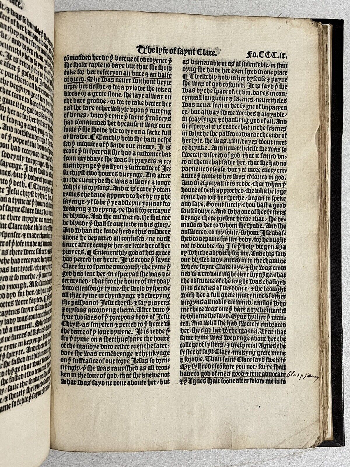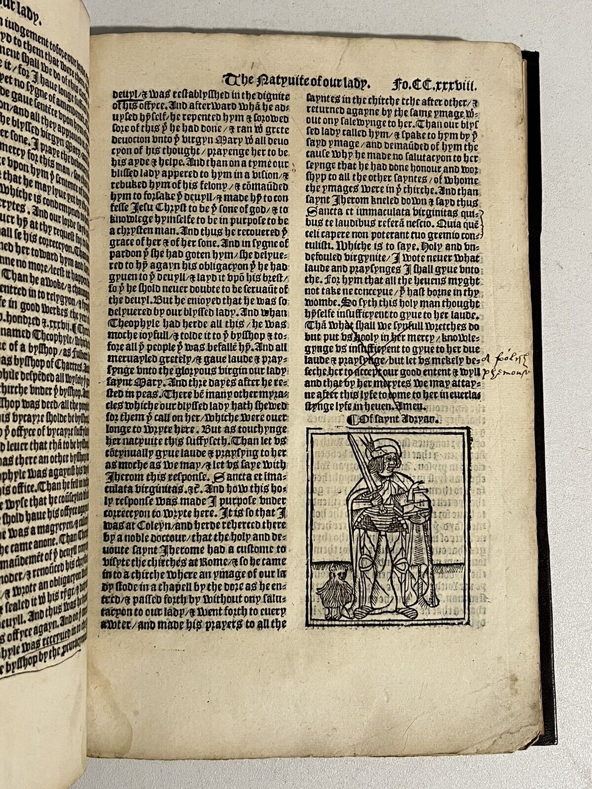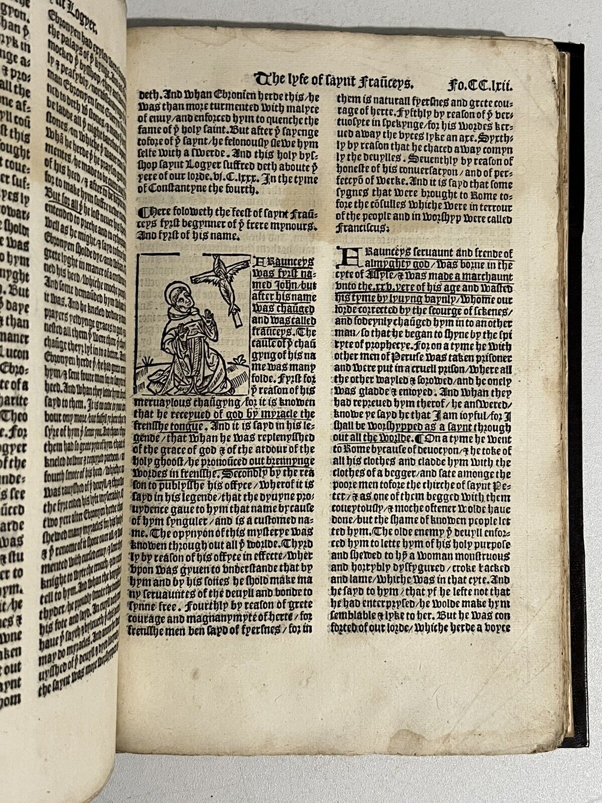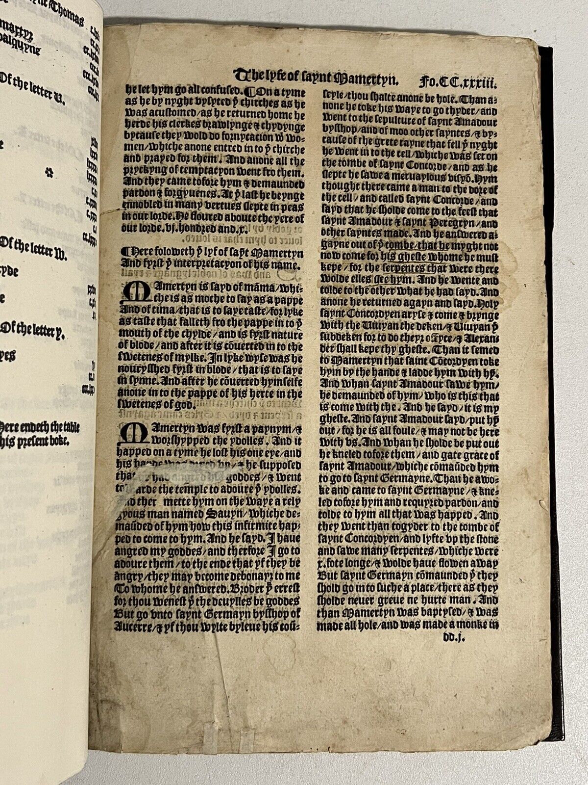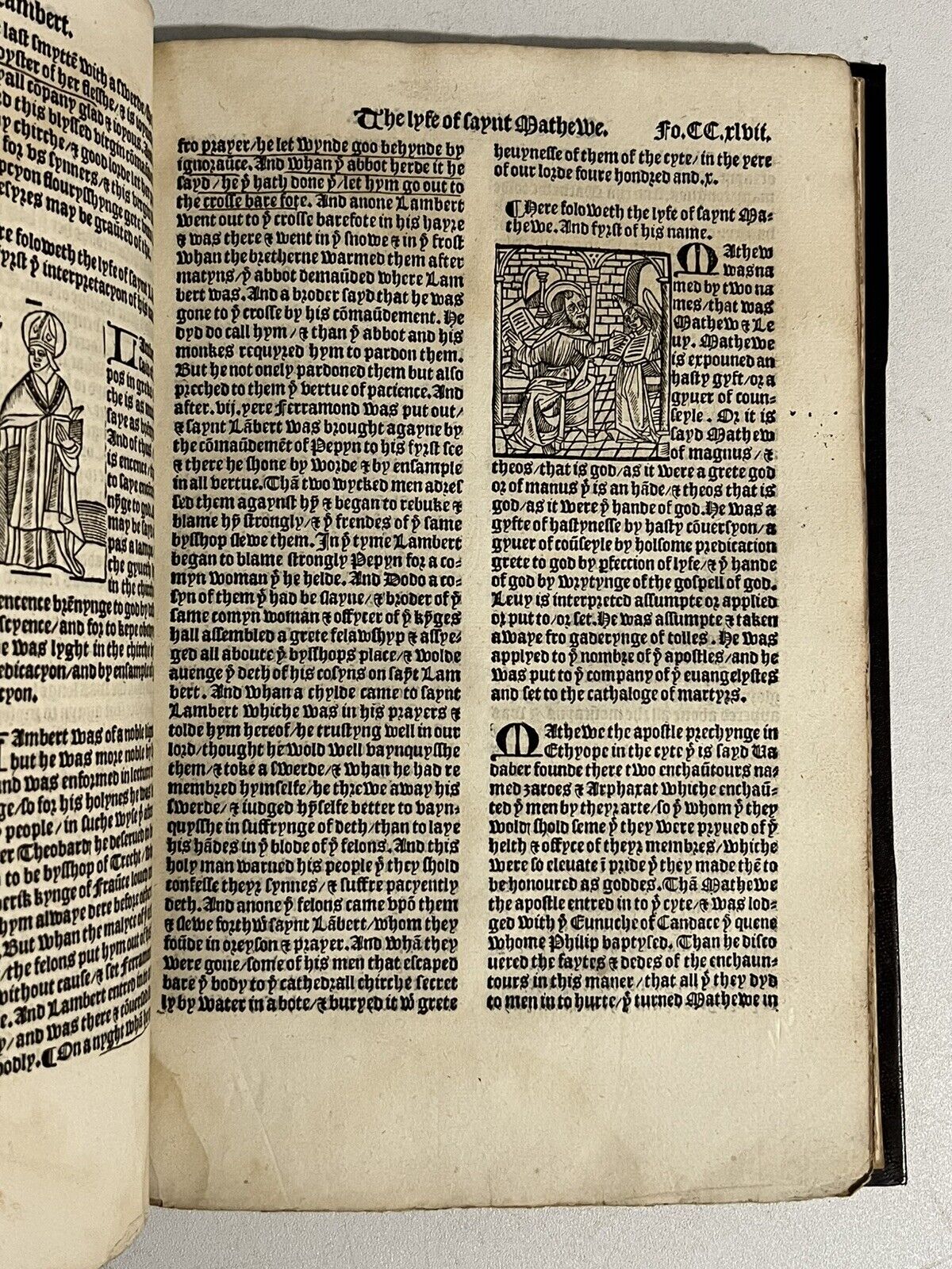 A noble fragment of one of the most famous early books printed in England: the Golden Legend, first translated and printed by William Caxton, and here by perhaps the second most famous English printer, Wynkyn de Worde. Imprints of de Worde are incredibly rare, as essentially are all English books prior to 1550 - the earlier the rarer. The Golden Legend was one of the first books William Caxton printed in the English language; Caxton's version appeared in 1483 and his translation was reprinted, reaching a ninth edition in 1527, as here.