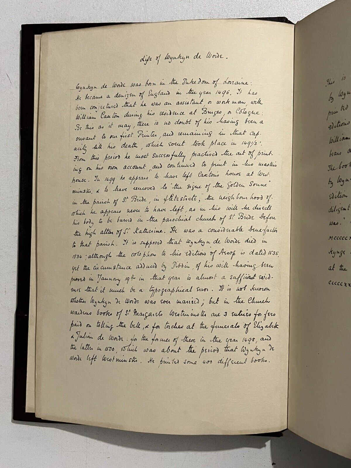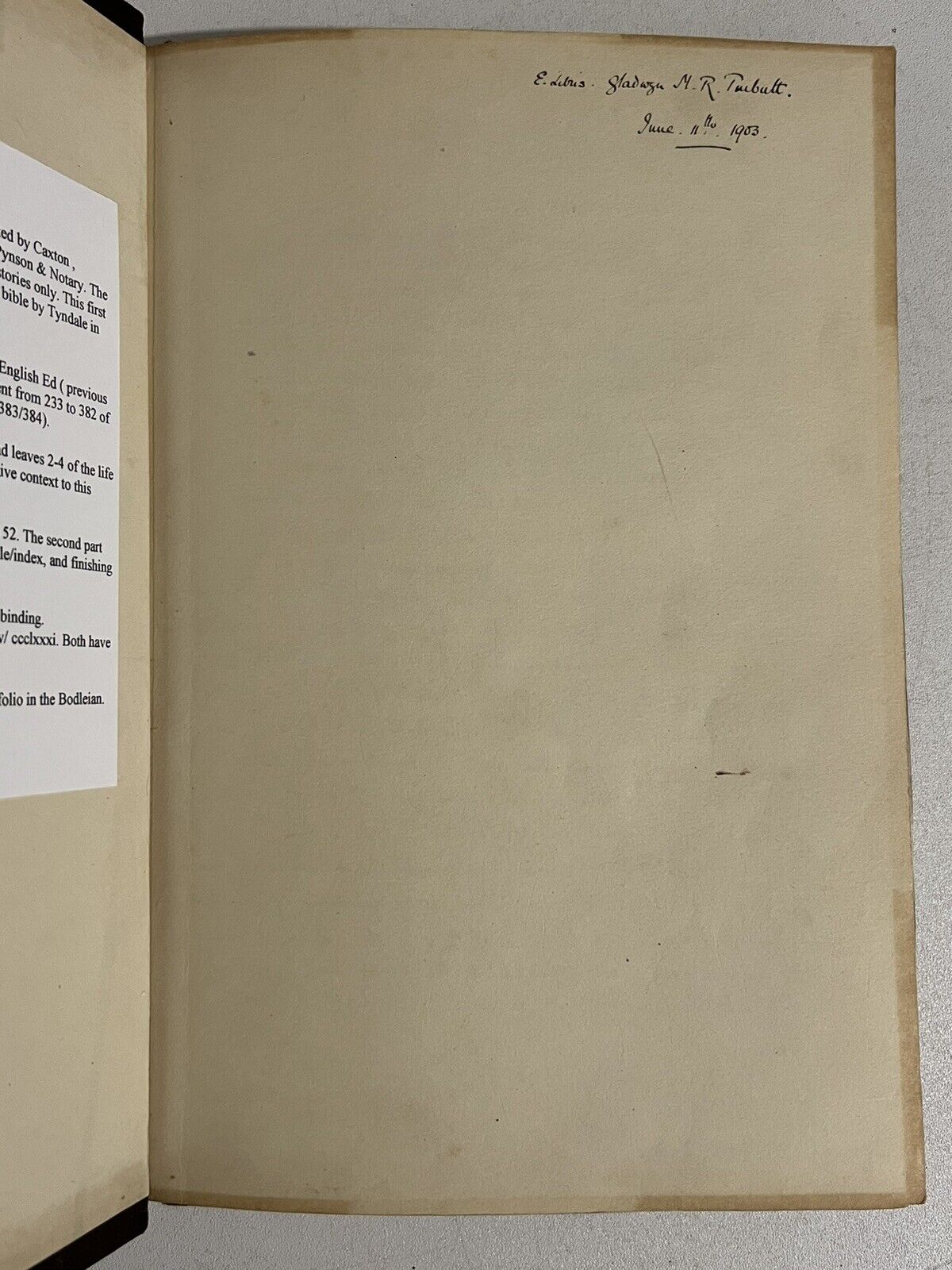 From the collection of Gladwyn Maurice Revell Turbutt (1883-1914), the famous collector who discovered a Shakespeare first folio which is now at the Bodleian Library, known as the Turbutt Shakespeare. His ownership inscription is on the ffep verso dated June 11th 1903, together with an interesting 2pp manuscript of the Life of Wynkyn de Worde in the hand of Turbutt on the front endpaper and following blank.