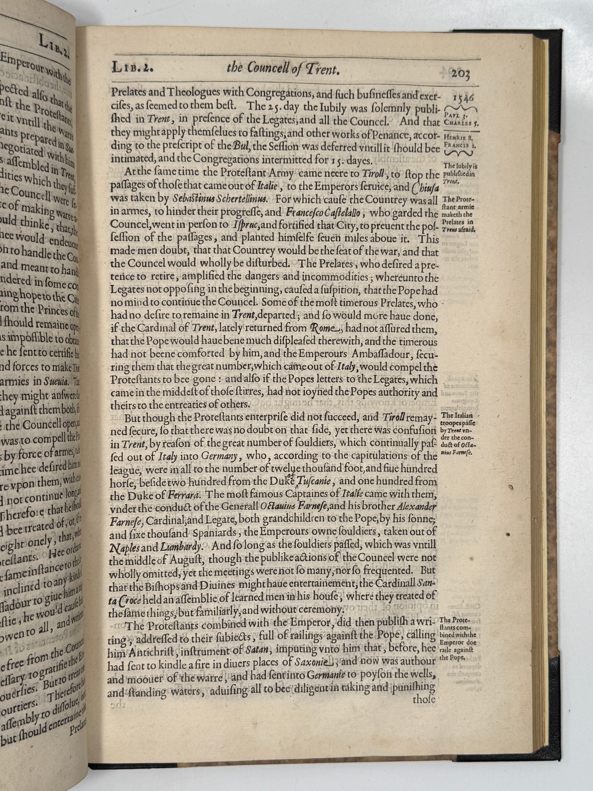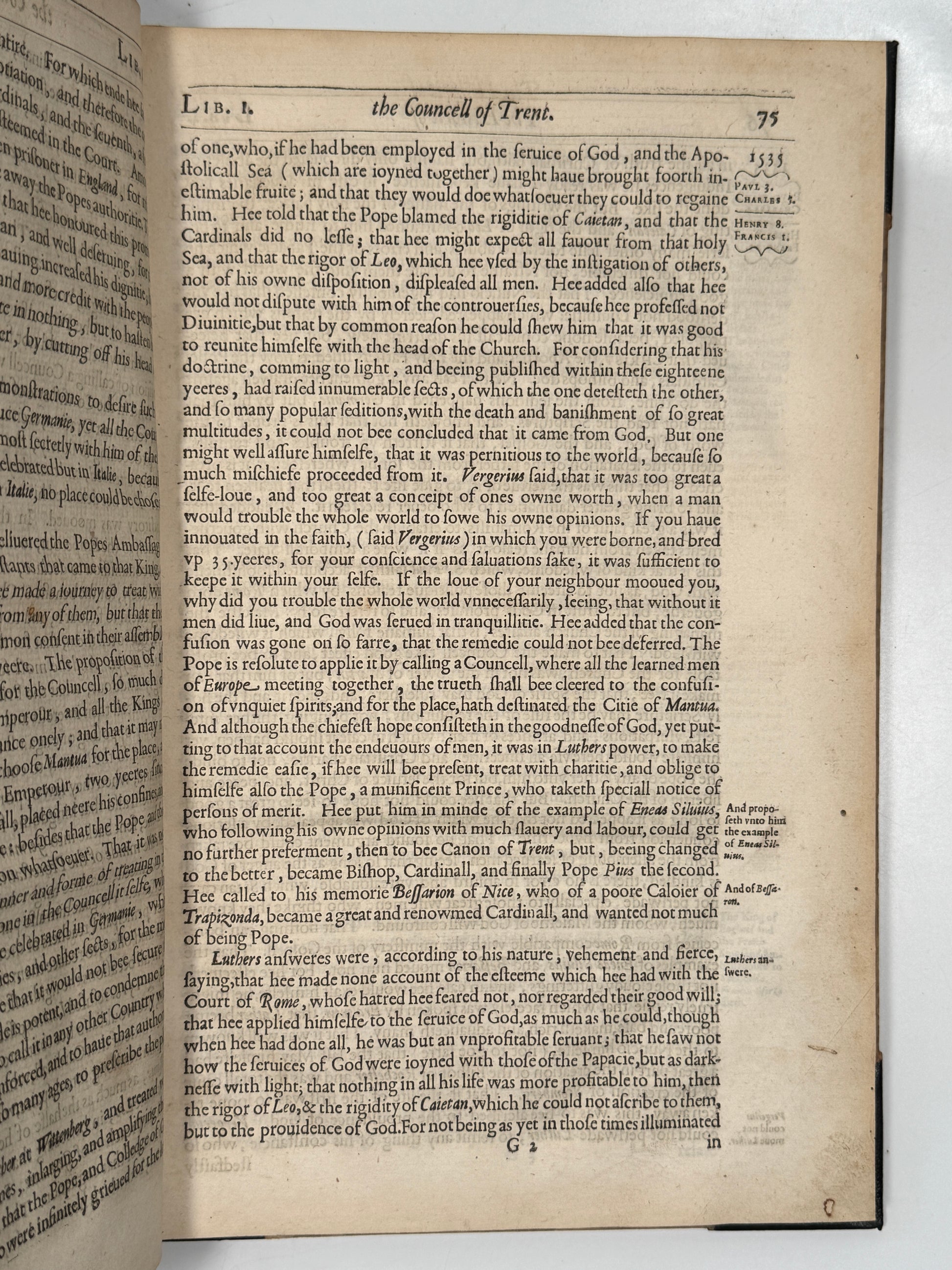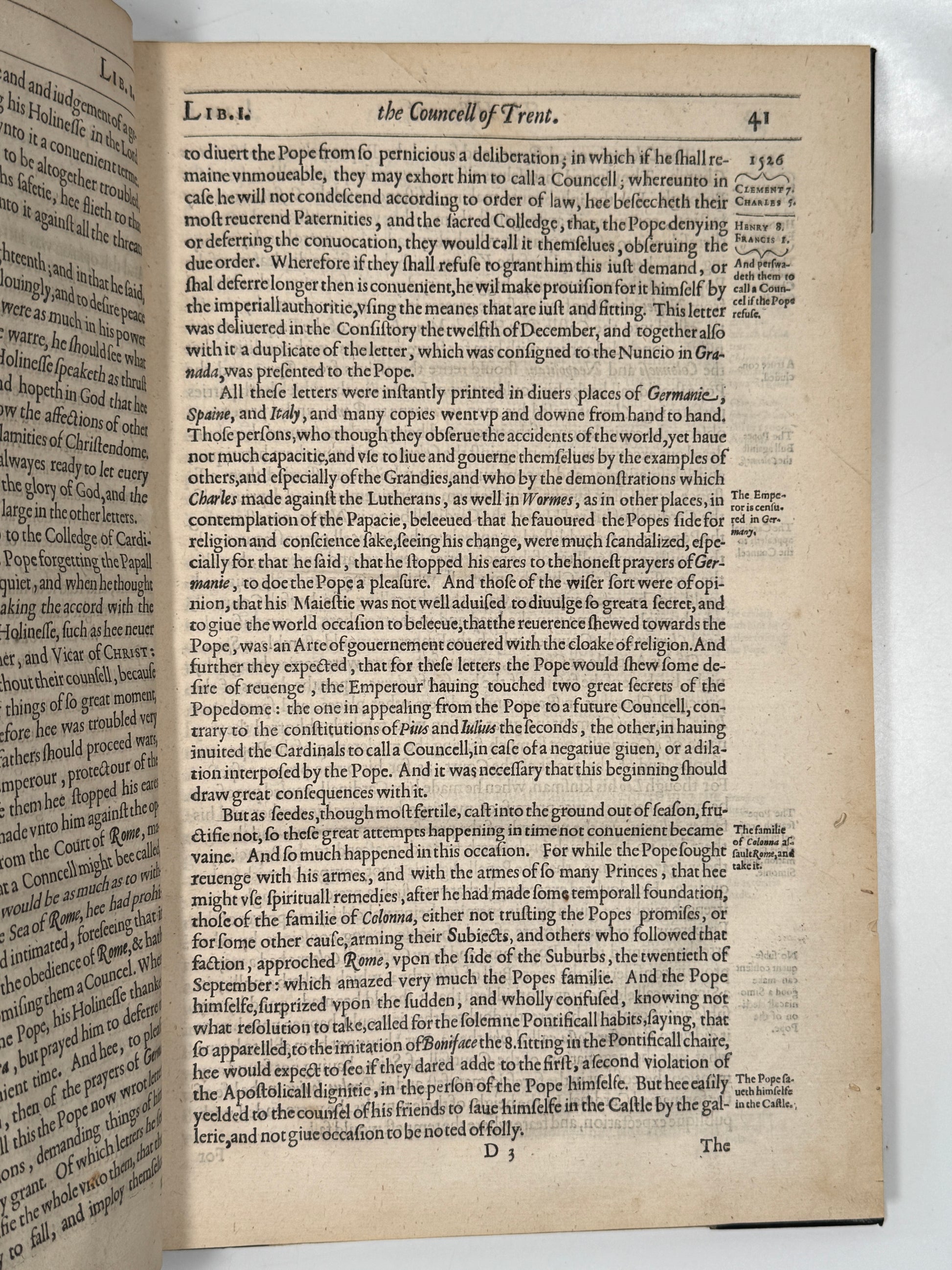 A noble fragment of the 1620 first edition of Brent’s Historie of the Councel of Trent, this copy comprising the complete text of the first four books of the text (379 pages), without the title leaf.