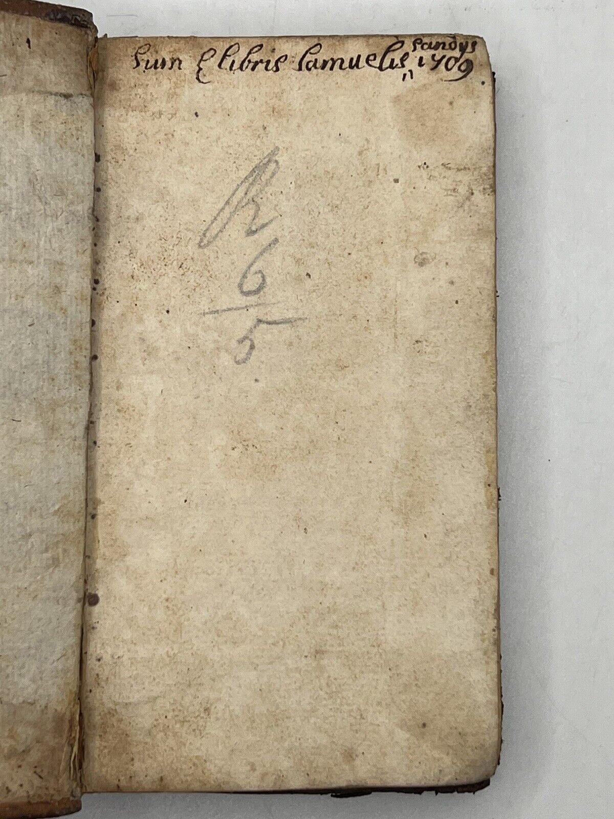 Ink inscription reading "Sum Elibris Samuelis Sandys 1709." (From the library of Samuel Sandys, 1709.)