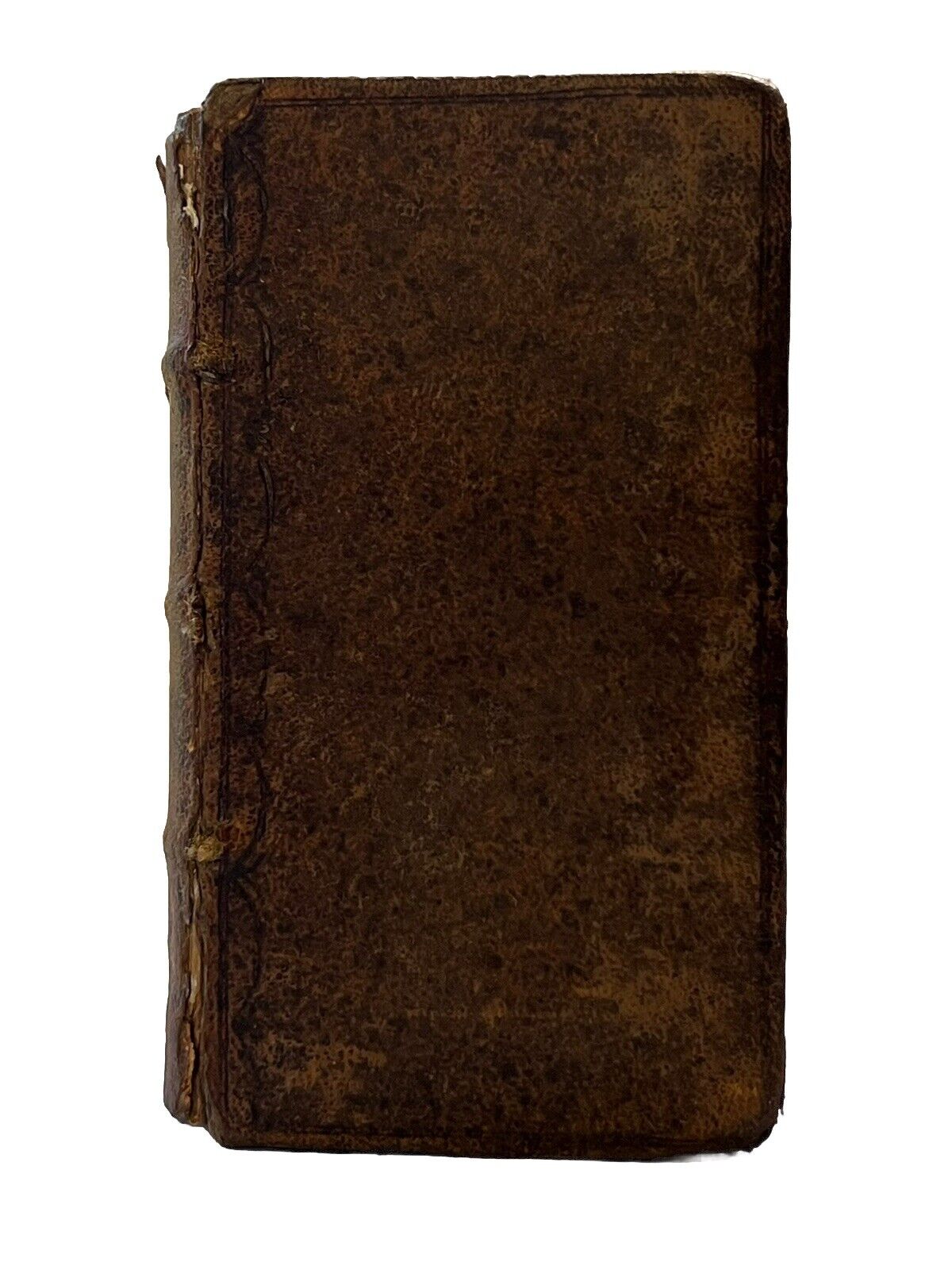 Full brown calf binding with simple blind-stamped edge to both boards on the inner side. Binding lightly rubbed and scuffed, with small losses at extremities of the spine. Both boards attached, fragile, joints and hinges cracked, rear board mostly detached, attached with a single binding string. Lacking headcap and tailcap. Shelf and edge wear. Does not stand upright due to the rear board being mostly detached. Ink ownership inscriptions to front blank and rear endpaper. No attached bookplates. Lacking rear blanks. Text block very clean with light toning and occasional foxing. Some damp staining towards the middle of the text block to some leaves.