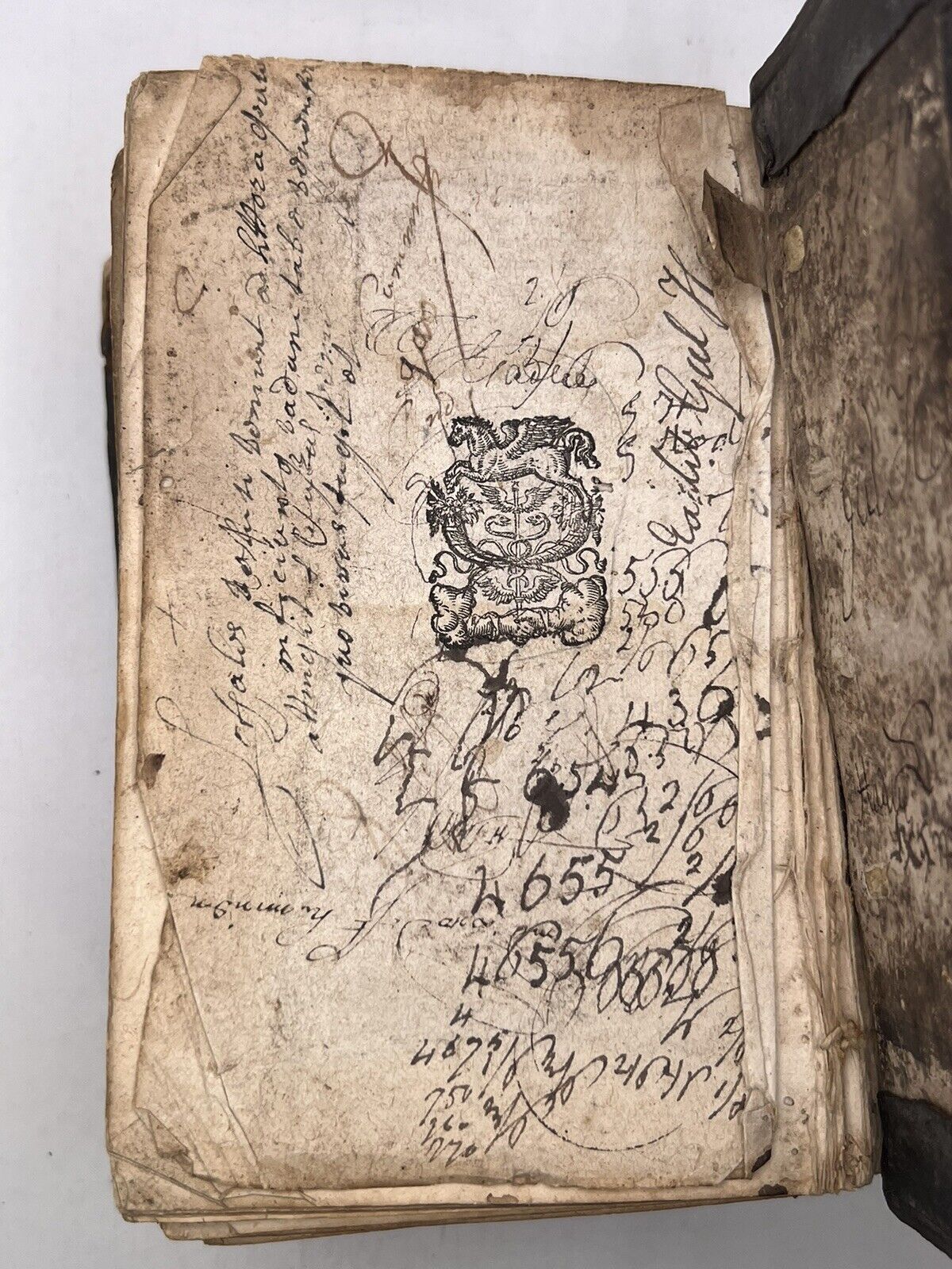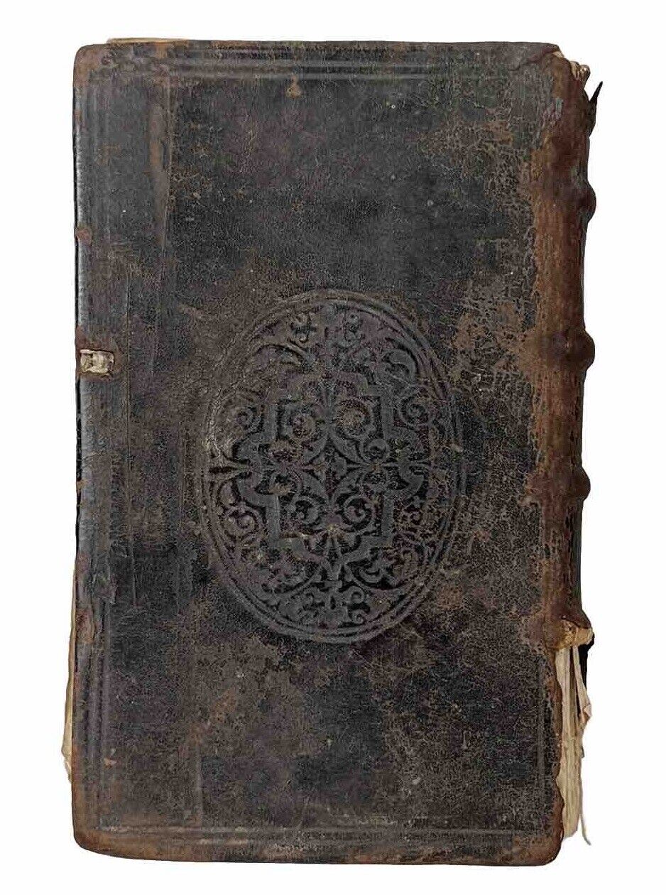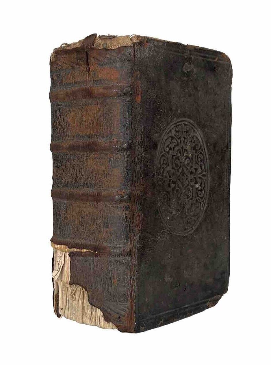 Contemporary full calf with blindstamped boards, rubbed with some loss of the backstrip at the foot and less so at the head. Joints secure with both boards attached to the binding, though with some separation of the backstrip and the page block which is visible when the binding is opened from the rear. Shelf and edge wear as typical with some losses at corners. No shelf lean. Some gatherings partially detached resulting in non-uniformity to the page edges. Binder's waste visible at the verso of the title page, not lacking any leaves in the collation prior to this according to WorldCat. Some ink ownership inscriptions to both inner boards of varying date, some being quite early. Lots of ink inscriptions to the final page (printer's device), largely illegible, and in multiple hands. Last leaf detached. The odd word of marginalia throughout or near contemporary underlining, else the text block is largely clean, the odd bit of damp staining at the edges and some wormhole tracks at the head of page block affecting the majority of it but without loss of sense to text. A rare work in a lovely 16th century binding.