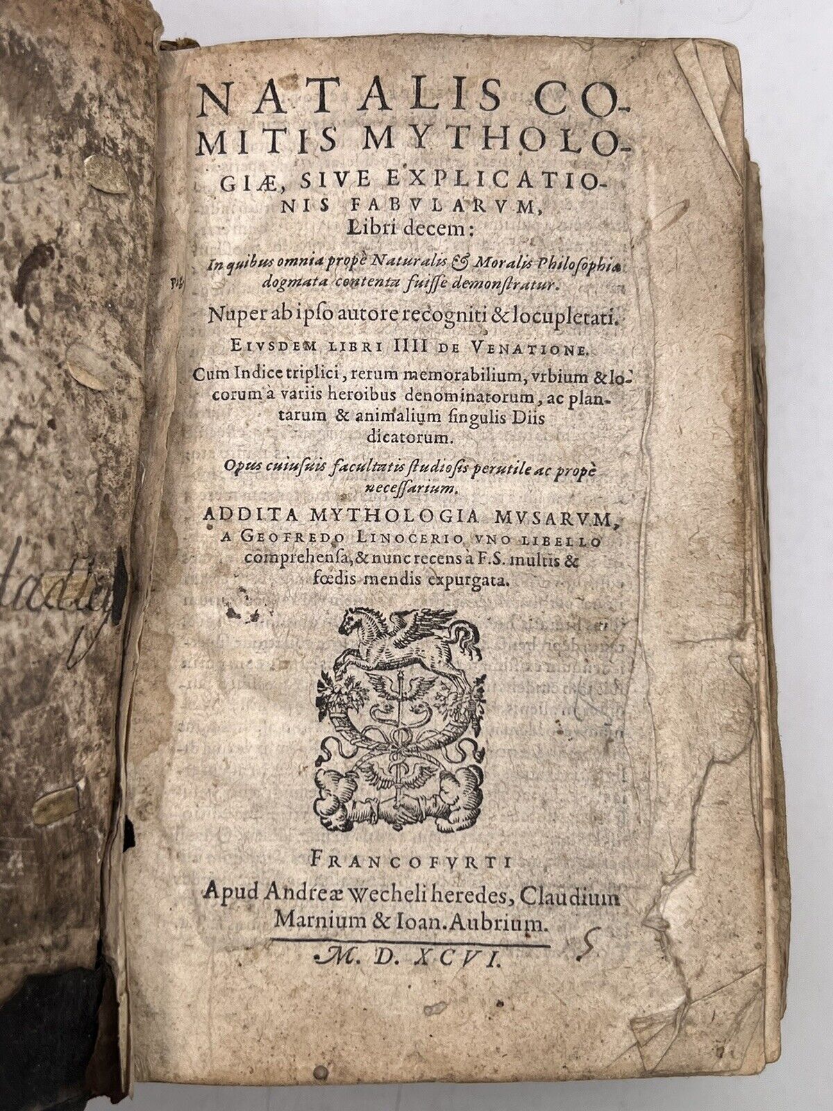 Natalis Comitis Mythologiae, Sive Explicationis Fabularum, Libri Decem: In Quibus Omnia Prope Naturalis & Moralis Philosophiae Dogmata Contenta Fuisse Demonstratur. Nuper Ab Ipso Autore Recogniti & Locupletati. Eiusdem Libri IIII De Venatione. Cum Indice Triplici, Rerum Memorabilium, Urbium & Locorum A Variis Heroibus Denominatorum, Ac Plantarum & Animalium Singulis Diis Dicatorum. Opus Cuiusuis Facultatis Studiosis Perutile Ac Prope Necessarium. Addita Mythologia Musarum, A Geofredo Linocerio Uno Libello Comprehensa, & Nunc Recens A F.S. Multis & Foedis Mendis Expurgata. Francofurti, Apud Andreae Wecheliheredes, Claudium Marnium & Ioan. Aubrium. MDXCVI.