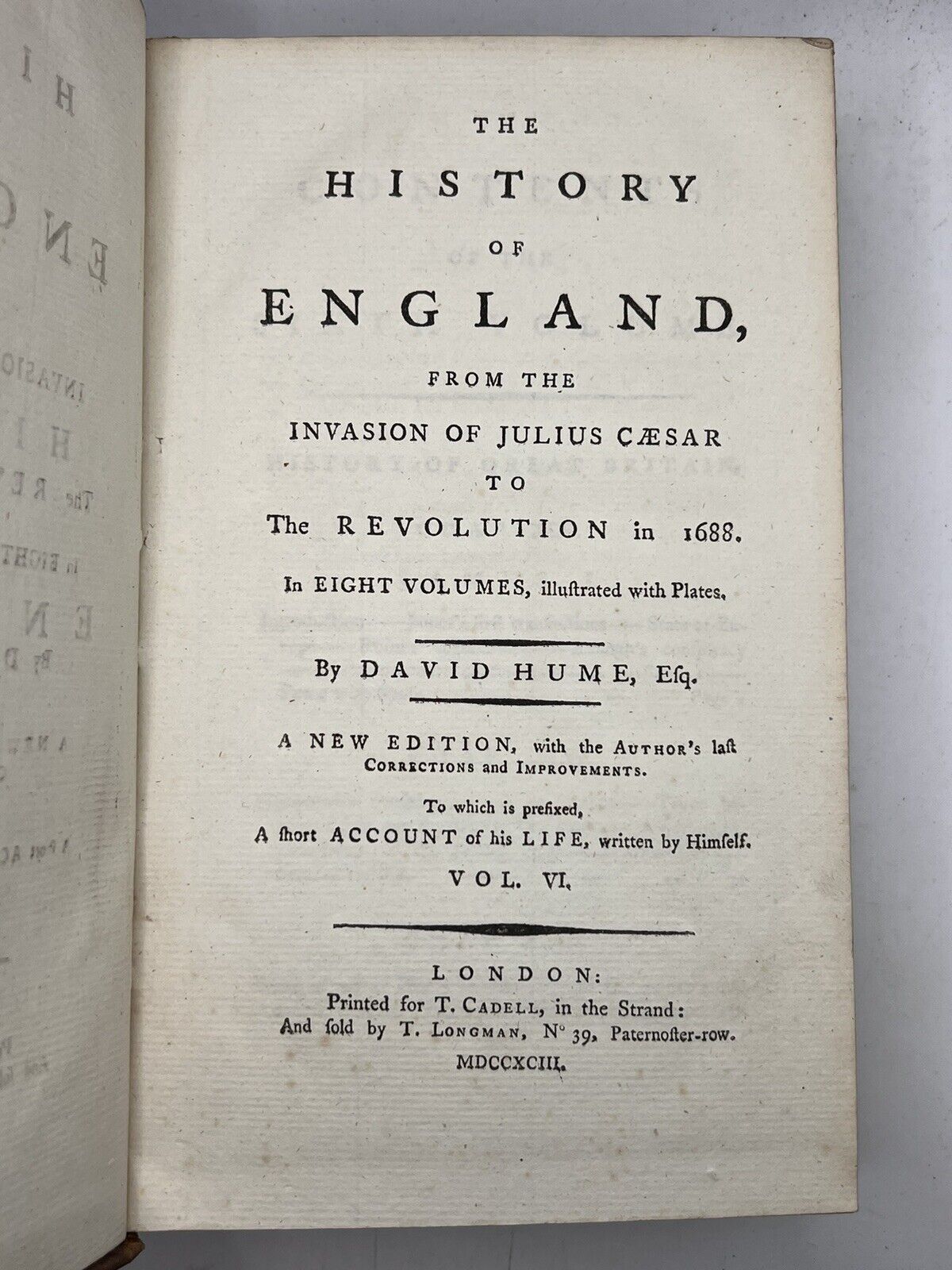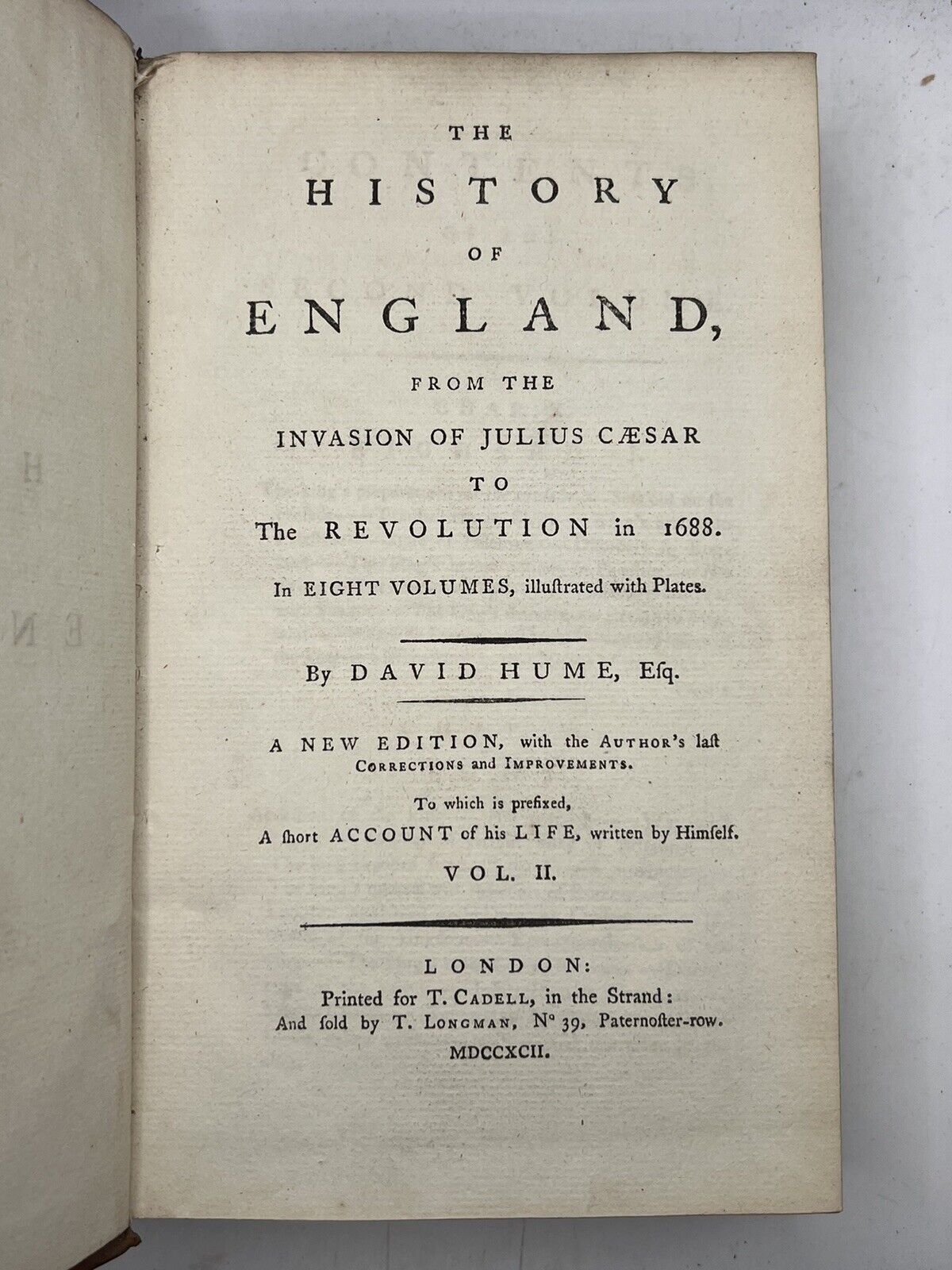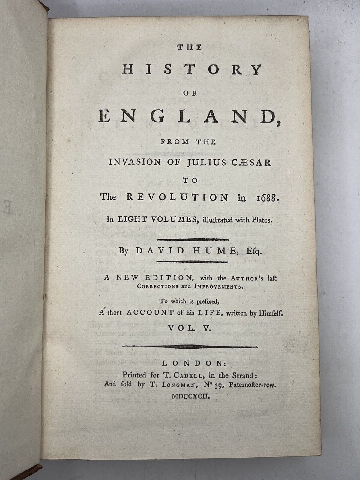The History of England, from the Invasion of Julius Caesar to the Revolution in 1688. In Eight Volumes, Illustrated with Plates. By David Hume, Esq. A New Edition, with the Author's Last Corrections and Improvements. To Which is Prefixed, a Short Account of His Life, Written by Himself. Volumes Two to Eight. London: Printed for T. Cadell, MDCCXCII (1792).