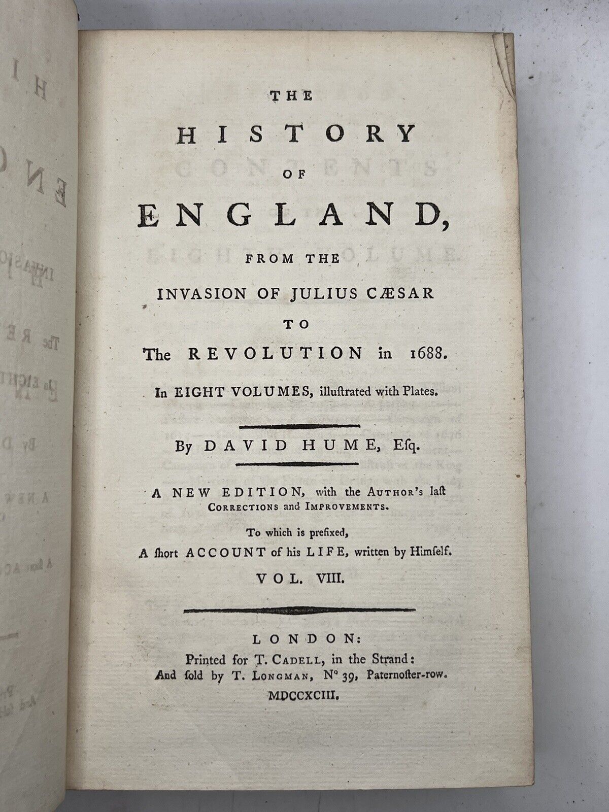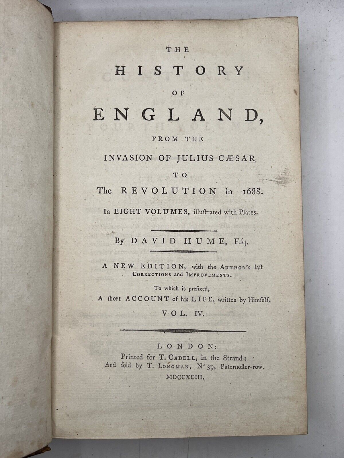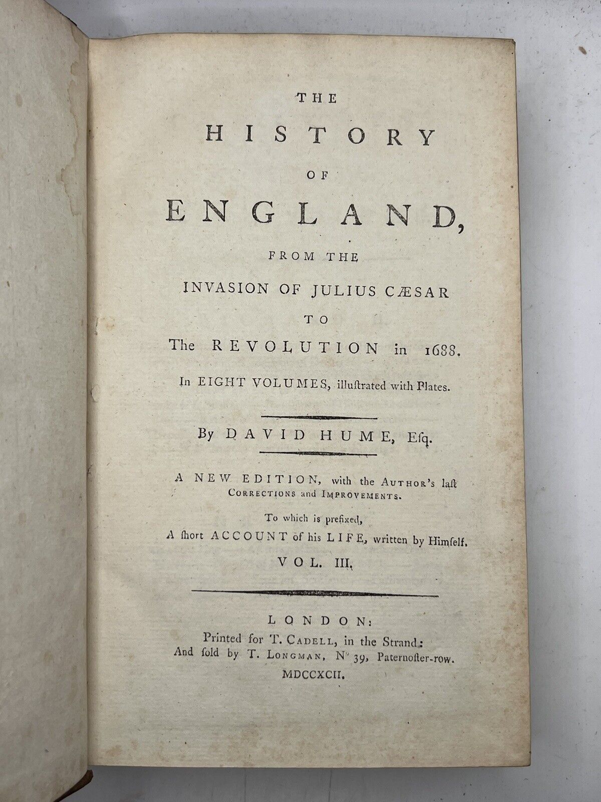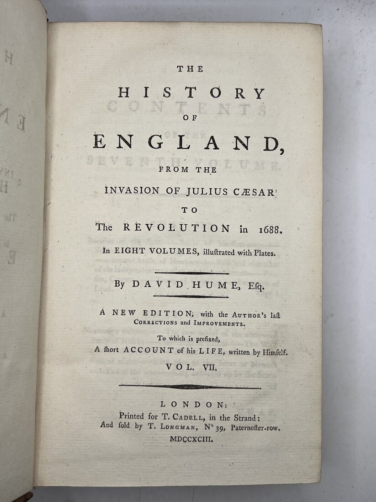 The History of England, from the Invasion of Julius Caesar to the Revolution in 1688. In Eight Volumes, Illustrated with Plates. By David Hume, Esq. A New Edition, with the Author's Last Corrections and Improvements. To Which is Prefixed, a Short Account of His Life, Written by Himself. Volumes Two to Eight. London: Printed for T. Cadell, MDCCXCII (1792).