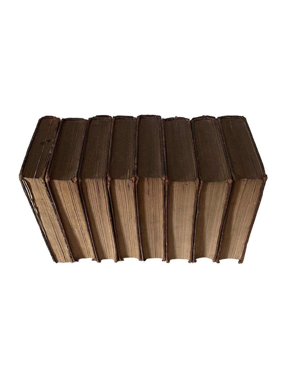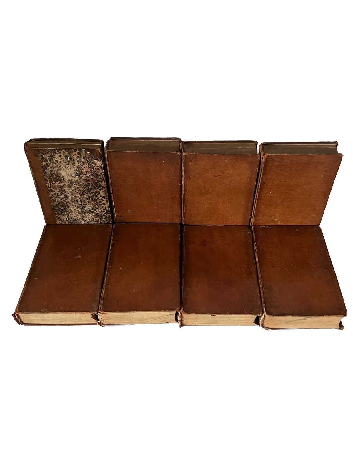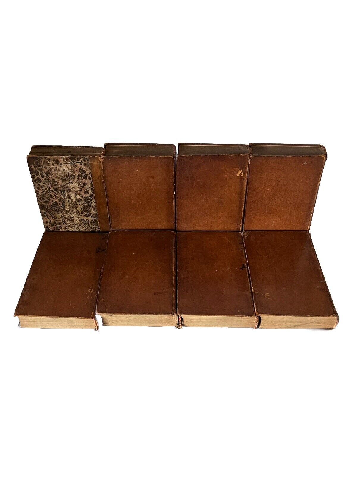 Full brown calf with red tooled labels to spines in compartments between gilt bands. Volume one is of a different set thus with a different binding and a later publication date; volume one is half brown calf over marbled paper backed boards with a gilt title to the spine. Bindings rubbed and scuffed. Some losses to backstrips. Wear to headcaps and tailcaps with the tailcap of volume six mostly detached. All boards attached with rubbing along joints and some joints and hinges starting/cracked. Shelf and edge wear. Page edges toned. Some volumes with shelf lean, but stand straight when set together as a set on the shelf. Text blocks very clean with light toning and occasional foxing, and some sporadic marks. Vii-x mostly detached in volume one, very loosely attached with one binding string at the bottom. very small hole over the number 5 in the pagination of pp.587/588 in volume six. Small mark on the first index page in volume eight, text still legible.
