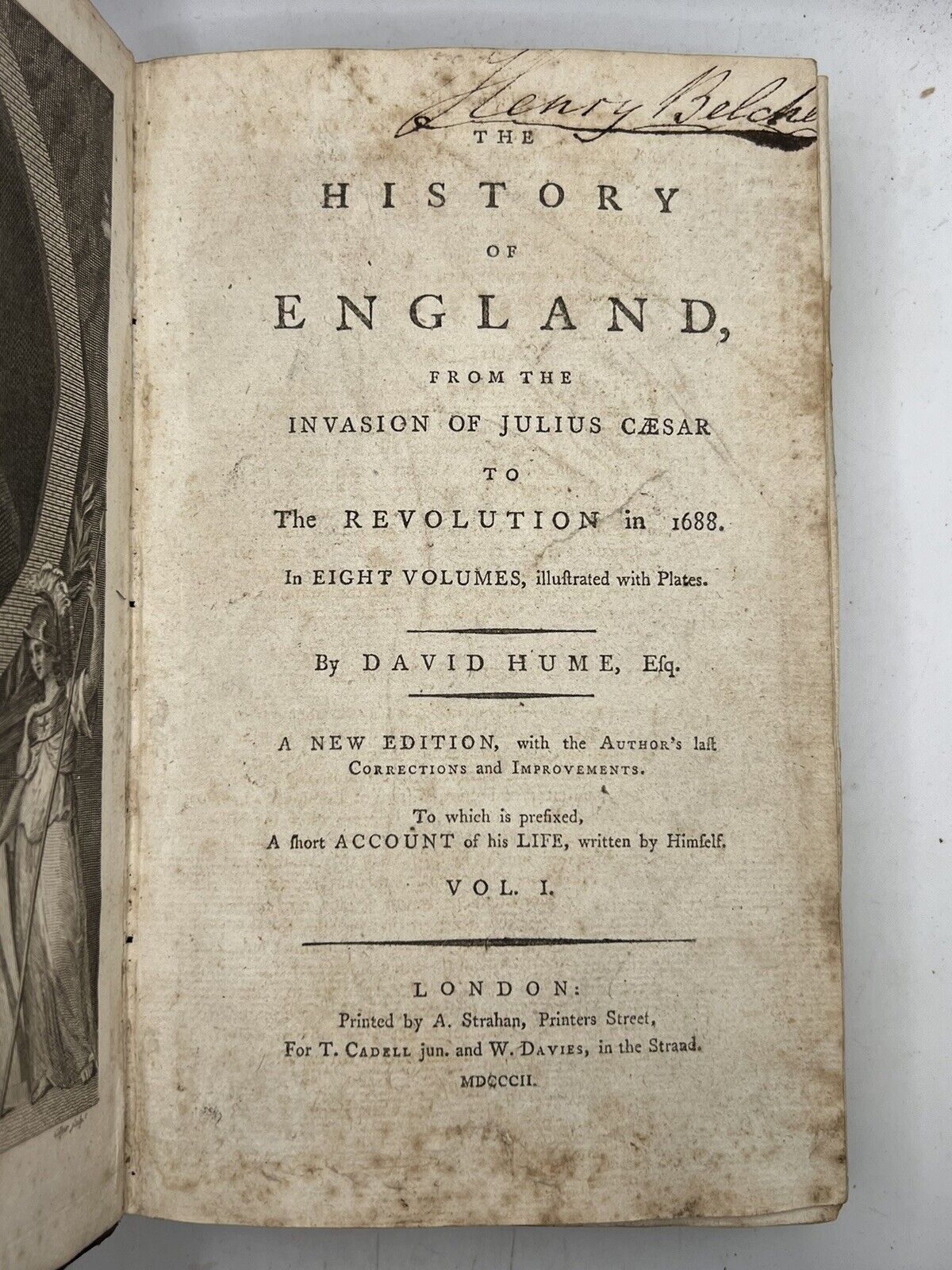 The History of England, from the Invasion of Julius Caesar to the Revolution in 1688. In Eight Volumes, Illustrated with Plates. By David Hume, Esq. A New Edition, with the Author's Last Corrections and Improvements. To Which is Prefixed, a Short Account of His Life, Written by Himself. Volume One. London: Printed by A. Strahan, MDCCCII (1802).