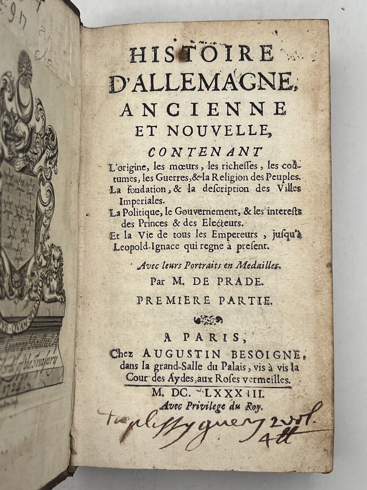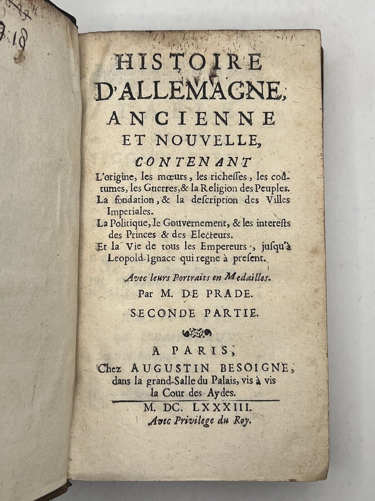 Histoire D'allemagne, Ancienne et Nouvelle, Contenant l'Origine, les Moeurs, les Richesses, les Coutumes, les Guerres & la Religion des Villes Imperiales. La Politique, le Gouvernement, & les Interests des Princes & des Electeurs. Et la Vie de Tous les Empereurs, Jusqu'a Leopold-Ignace Qui Règne a Present. Avec Leurs Portraits en Medailles. Par M. de Prade. A Paris, Chez Augustin Besoigne, Dans la Grande-Salle du Palais, Vis a Vis la Cour des Aydes, Aux Roses Vermeilles. MDCLXXXIII. Avec Privilege du Roy.