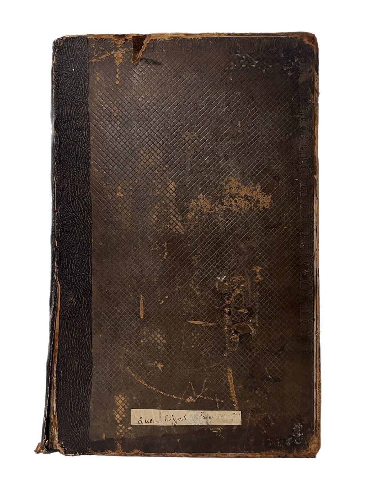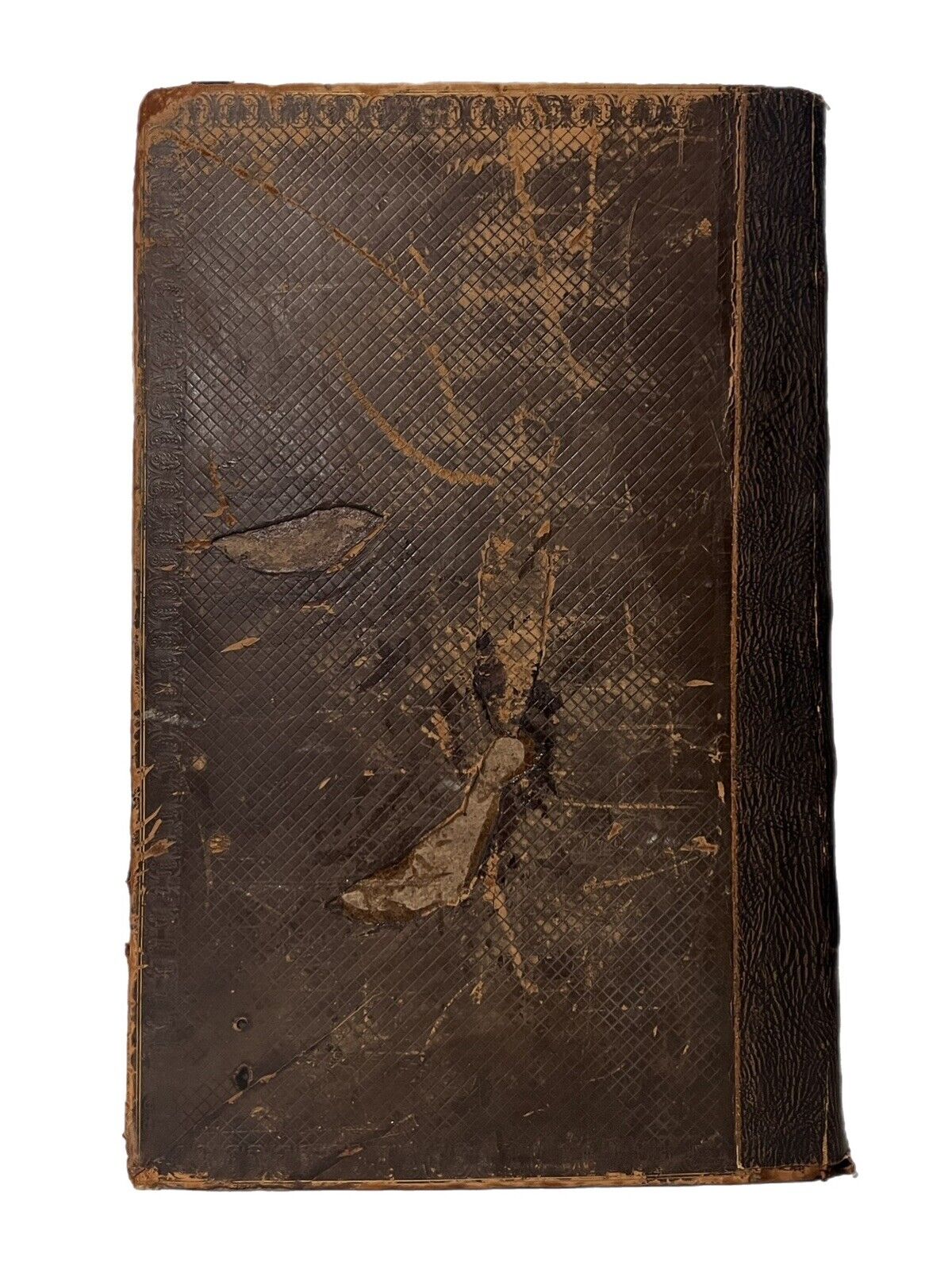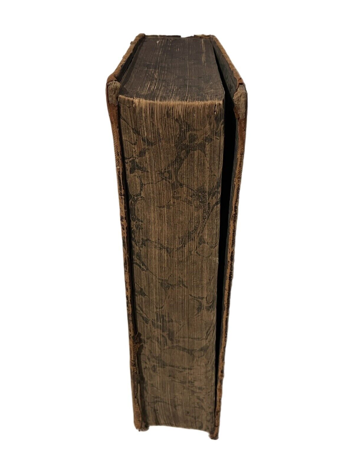 Brown calf boards with a brown cloth spine. Small fragment of paper labels remain on the spine. Paper label to the bottom of the front board. Binding rubbed and scuffed with small pieces of leather peeling in places. The bottom of the backstrip is partially detached. Shelf and edge wear. Both boards attached with rubbing along joints and wear to hinges. Marbled page edges dulled. Text block toned with occasional foxing and marks, some leaves more prominently foxed and toned. Ffep and the following blank are partially attached to each other. Title page backed onto a blank. Two blanks following the title page are partially attached to each other and the title page. Ink inscription on the dedication. Hole to pp.153/154 and pp.155/156 with a small part of the text lacking. Large mark to pp.158, text still legible. Tear to the centre of pp.163/164 between the two columns of text, thus not affecting legibility. Small tear to the bottom of the gutter of pp.185/186. Large tear to pp.341/342. Faint pencil inscription to pp.363. Tear to the last leaf of the text block. WorldCat copy collates as follows: 6pp., pp.155-402, pp.395-799, pp.800-828, pp.829-923, 23pp.