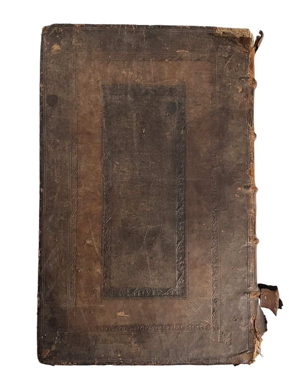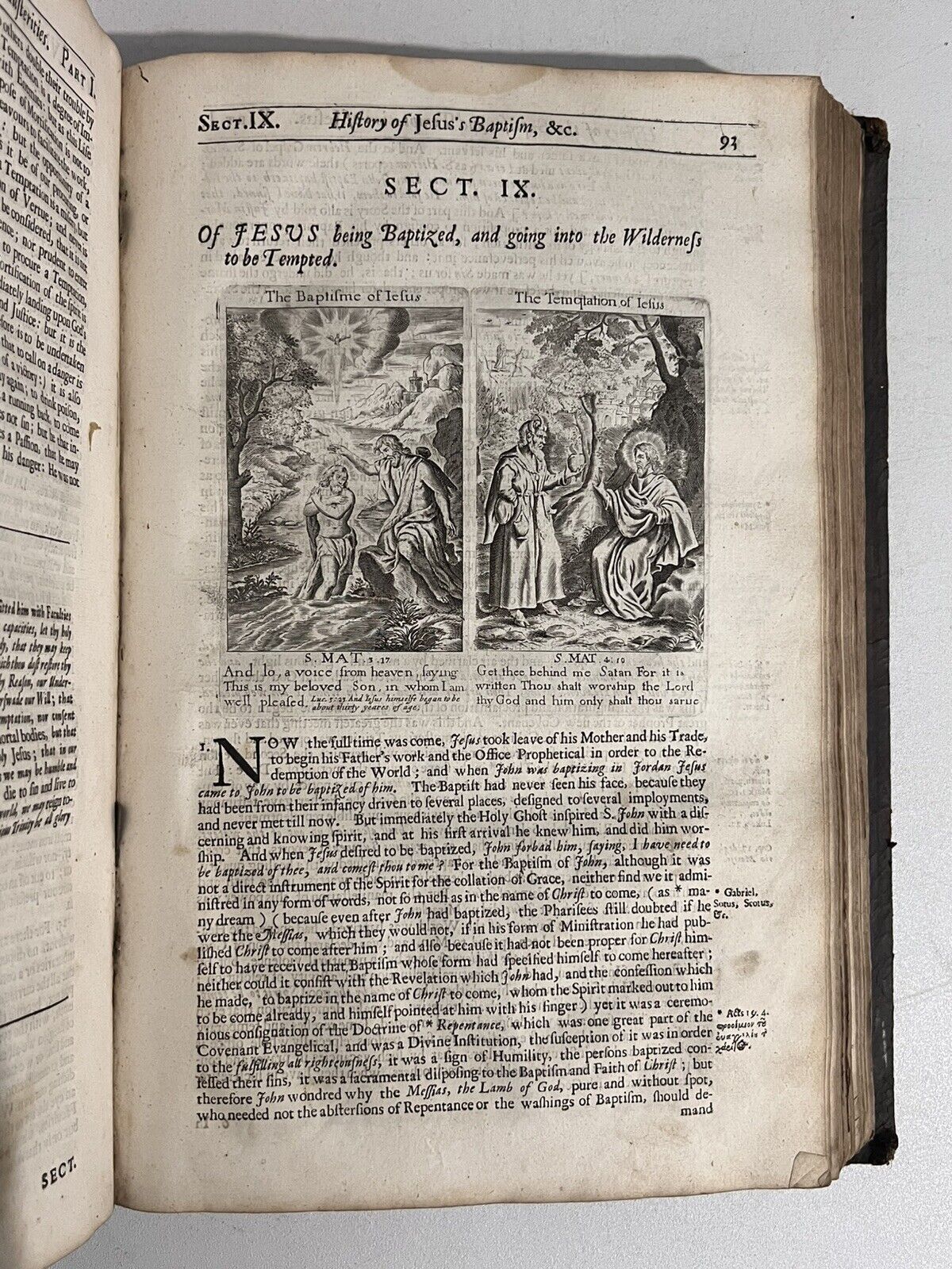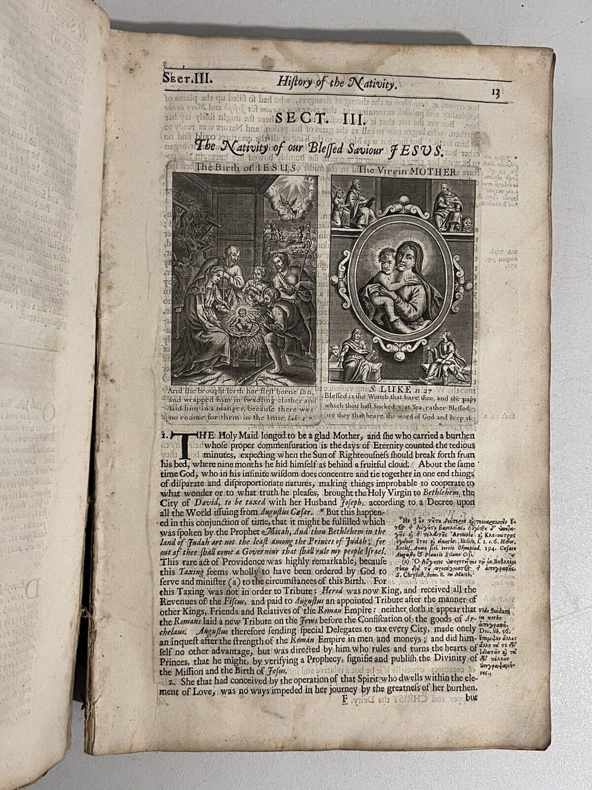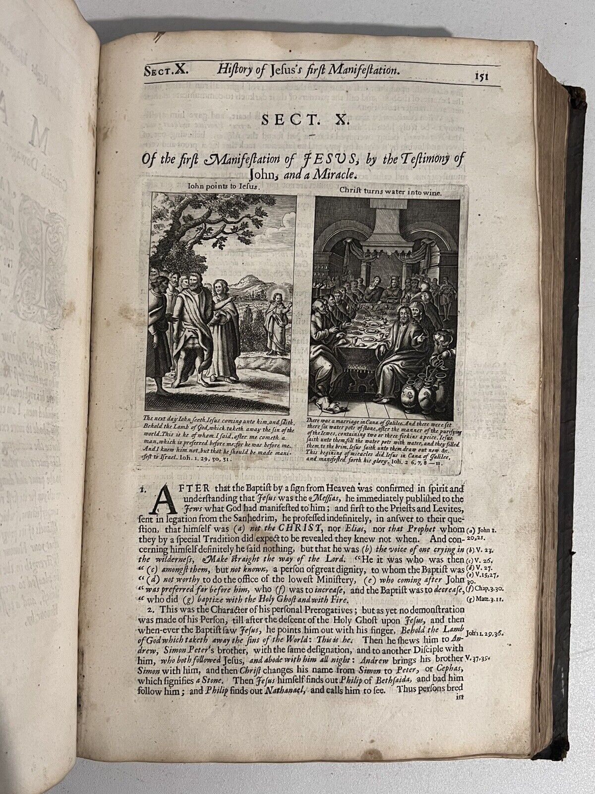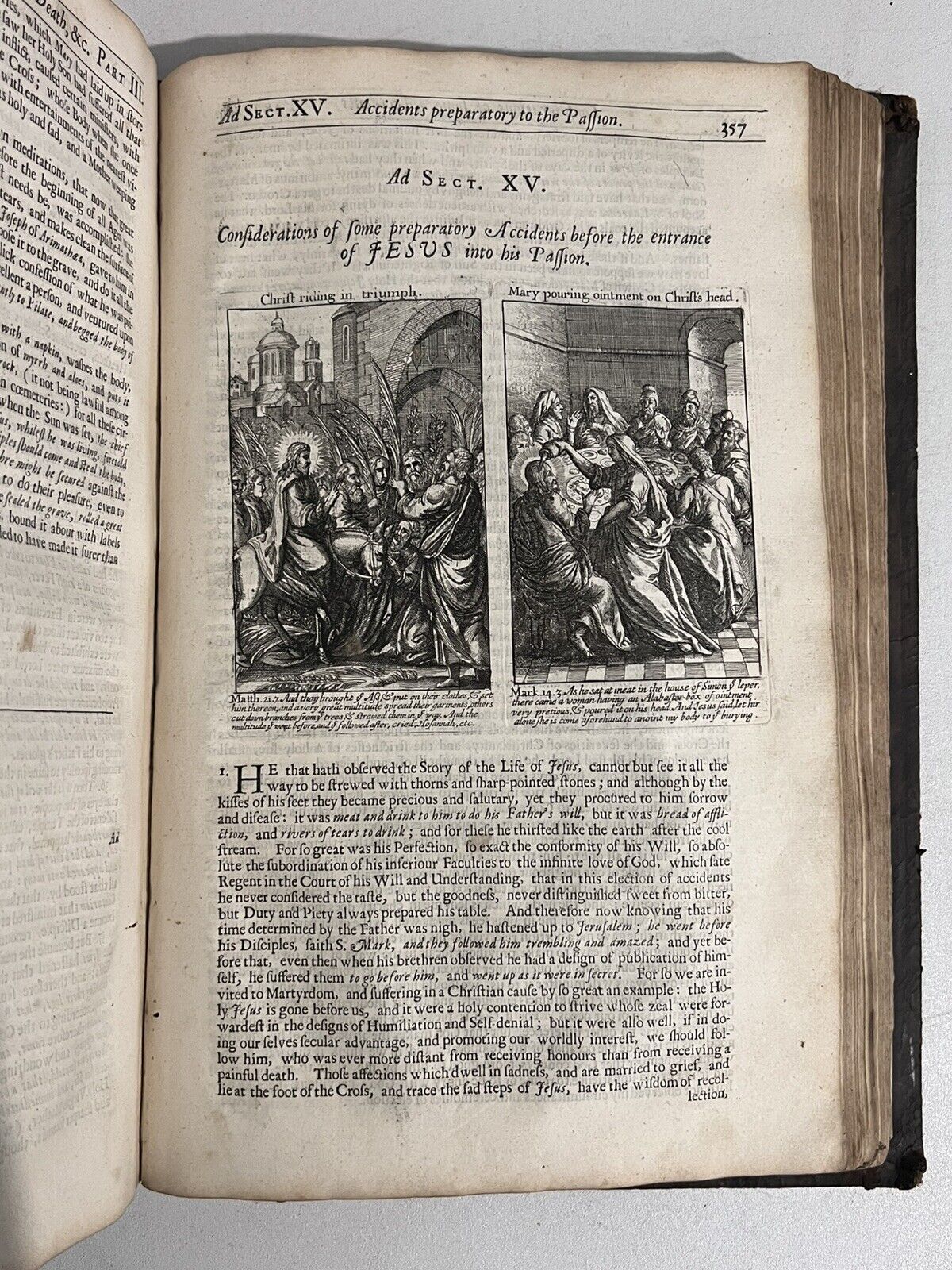 Full brown calf with blind-stamping to the boards. Binding rubbed and scuffed with some leather fragments lacking and peeling in places, and some discolouration/damp staining. Some wormholing to the binding. Page edges dulled. Both boards attached with wear to joints and hinges, some cracked or starting, thus very fragile. Text block very clean with light toning and occasional foxing. Uncollated, some leaves are loose or partially detached. Front pastedown partially detached from the board. Leaf edge repair to pp.221/222 of the Life of Jesus Christ. Some small damp staining to the tops of leaves.