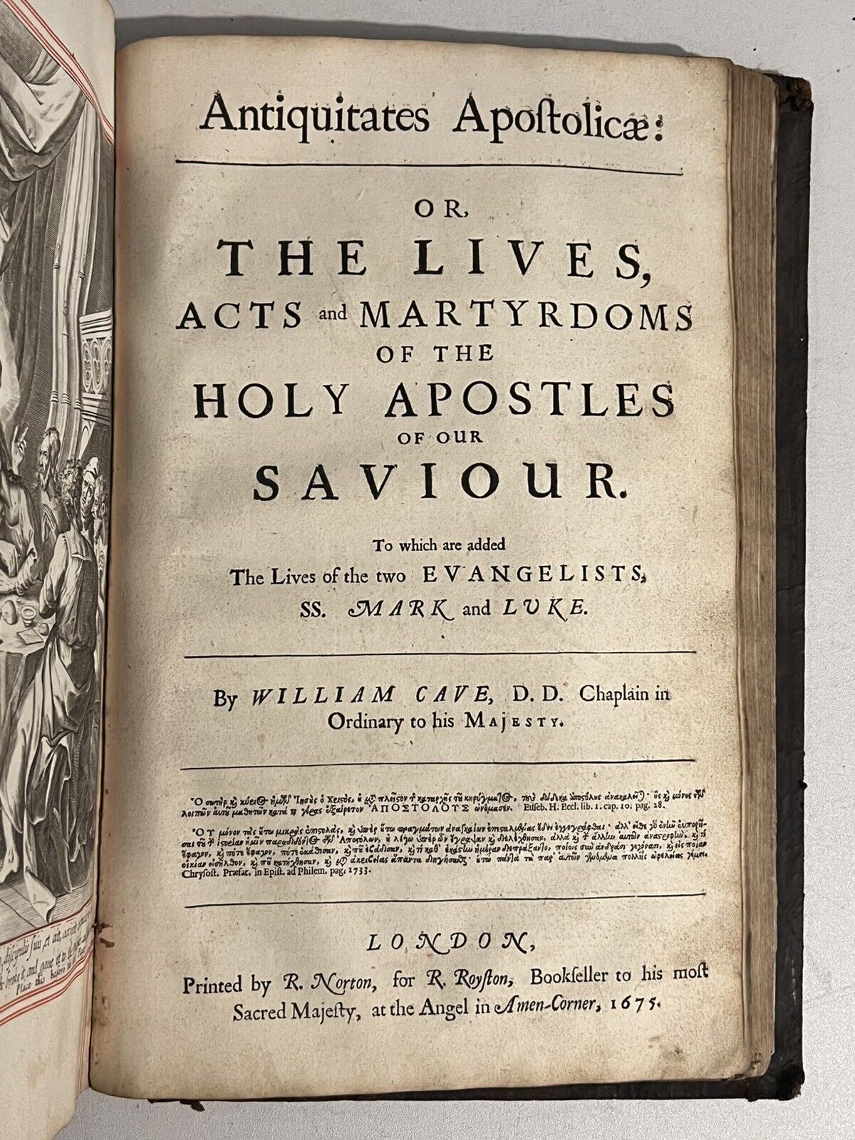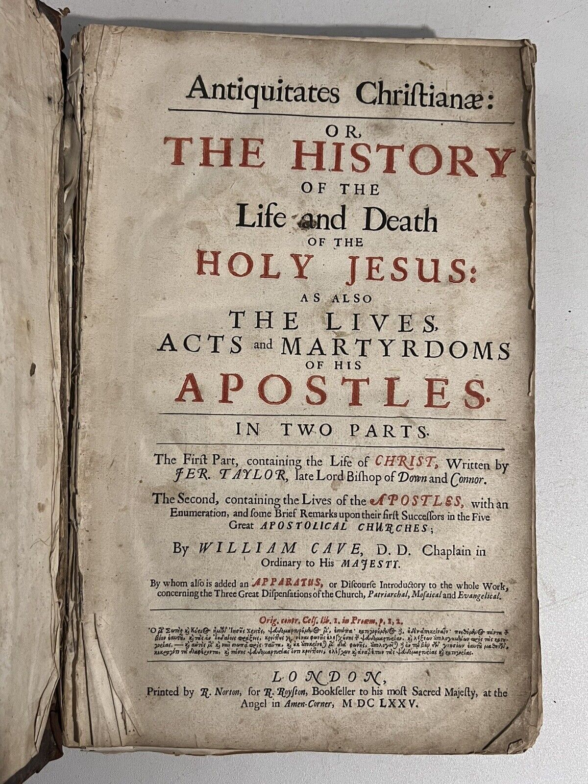 Antiquitates Christianae: Or, the History of the Life and Death of the Holy Jesus: As Also the Lives, Acts and Martyrdoms of His Apostles. In Two Parts. The First Part, Containing the Life of Christ, Written by Jer. Taylor, Late Lord Bishop of Down and Connor. The Second, Containing the Lives of the Apostles, with an Enumeration, and Some Brief Remarks Upon their First Successors in the Five Great Apostolical Churches. By William Cave, D.D., Chaplain in Ordinary to His Majesty. By Whom is Also Added an Apparatus, or Discourse Introductory to the Whole Work, Concerning the Three Great Dispensations of the Church, Patriarchal, Majesical and Evangelical. London: Printed by R. Norton, for R. Royston, MDCLXXV (1675).