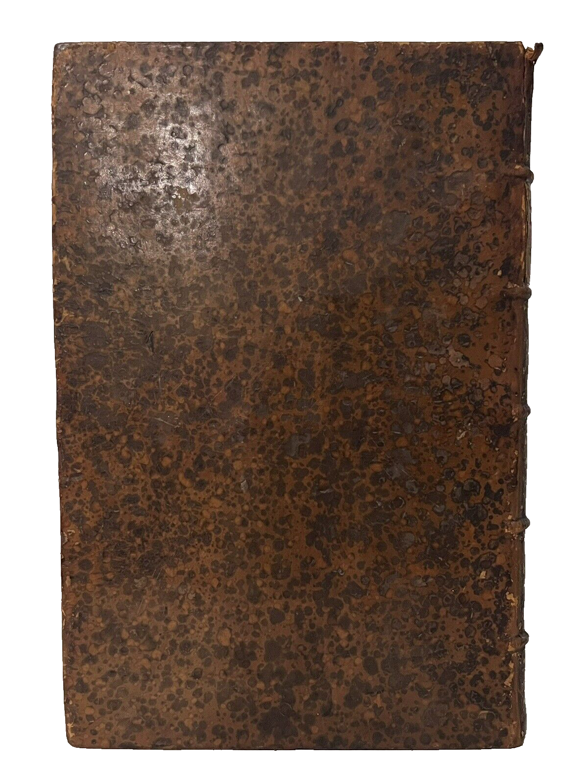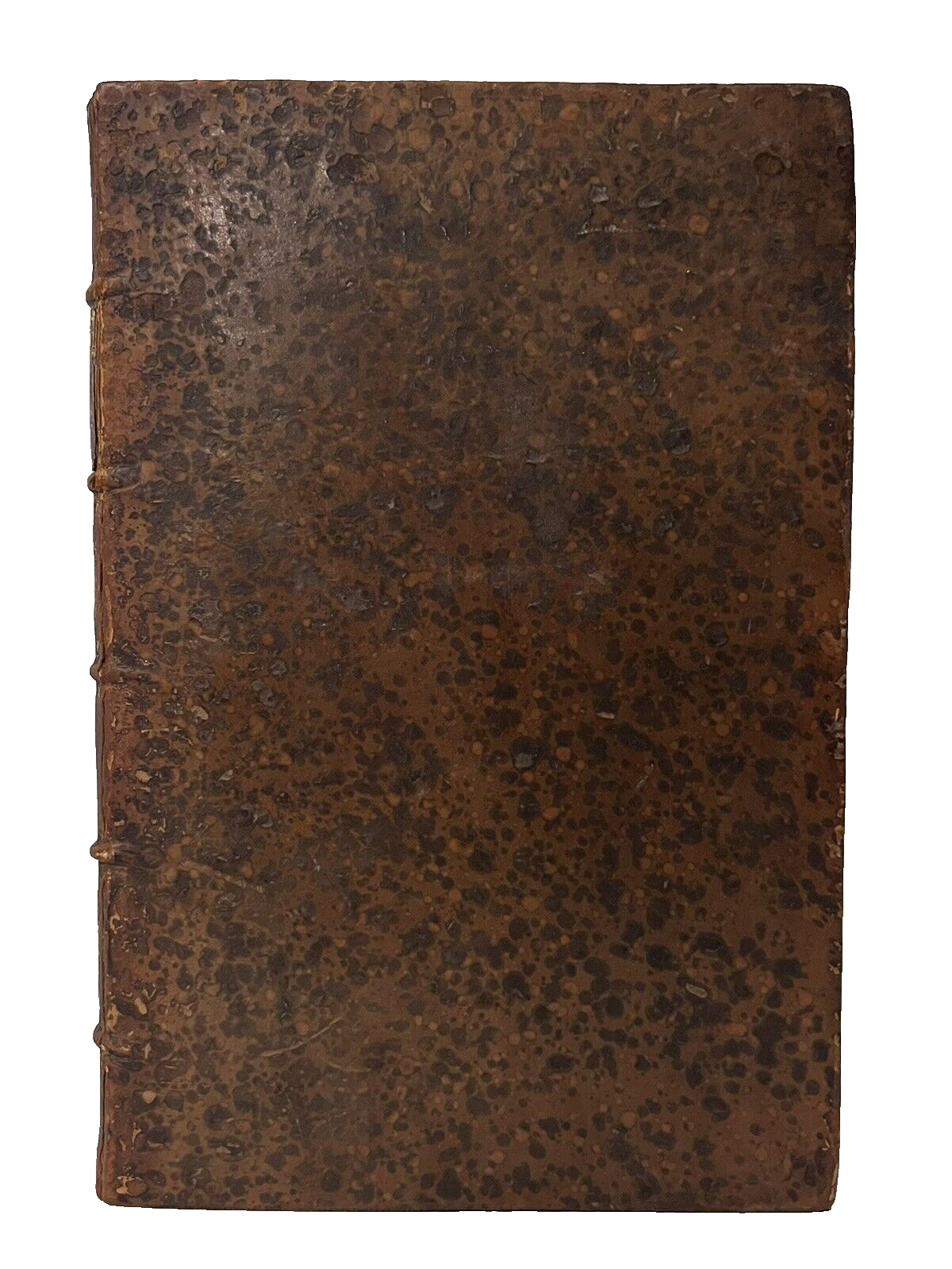 Full brown spotted calf binding with a red tooled label in a compartment on the spine between raised bands, other compartments with decorative gilt. The gilt on the spine is rubbed and dulled in places. Binding lightly rubbed and worn with small holes to the leather. Both boards attached with minor wea to joints and hinges. Shelf and edge wear. Corners lightly turned-in. Spotted page edges dulled, top edge darkened. No shelf lean. Spine very lightly cocked. No attached bookplates. Ink inscription to the head of the front pastedown, and a pencil inscription to the front blank. Text block very clean with light edge toning and occasional foxing.