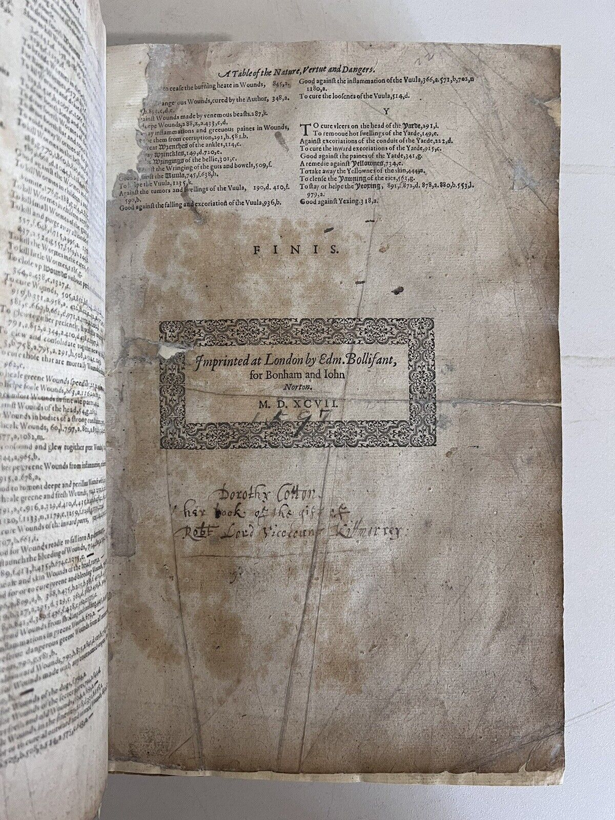 Ink inscription reading "Dorothy Cotton her book of the gift of Robt Lord Viscount Killorrey:"